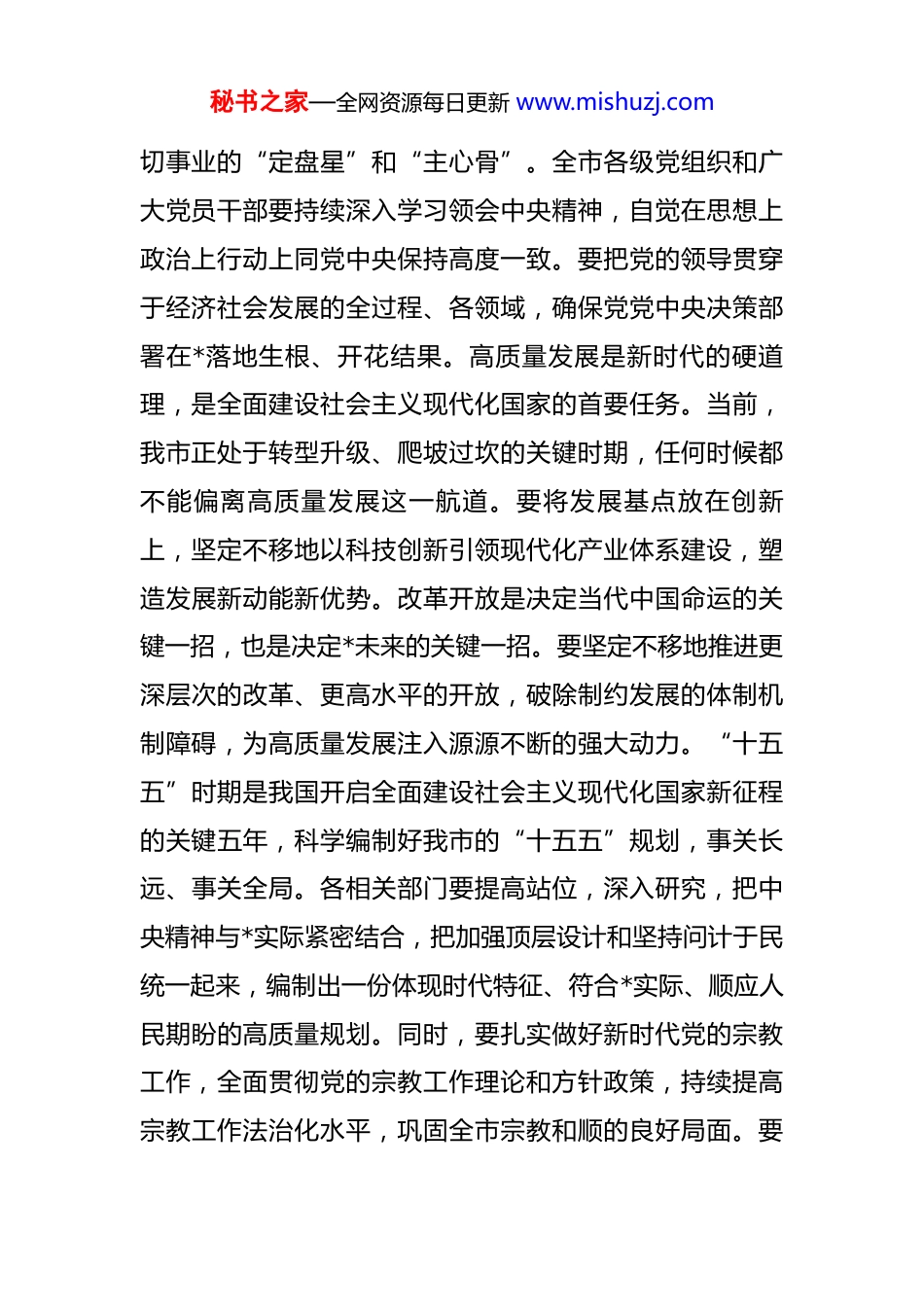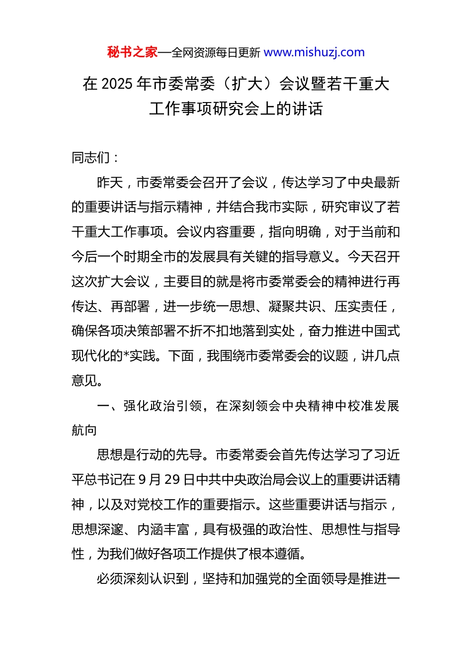 秘书之家—全网资源每日更新 www.mishuzj.com在 2025 年市委常委(扩大)会议暨若干重大工作事项研究会上的讲话 同志们:昨天,市委常委会召开了会议,传达学习了中央最新的重要讲话与指示精神,并结合我市实际,研究审议了若干重大工作事项。会议内容重要,指向明确,对于当前和今后一个时期全市的发展具有关键的指导意义。今天召开这次扩大会议,主要目的就是将市委常委会的精神进行再传达、再部署,进一步统一思想、凝聚共识、压实责任,确保各项决策部署不折不扣地落到实处,奋力推进中国式现代化的*实践。下面,我围绕市委常委会的议题,讲几点意见。一、强化政治引领,在深刻领会中央精神中校准发展航向思想是行动的先导。市委常委会首先传达学习了习近平总书记在 9 月 29 日中共中央政治局会议上的重要讲话精神,以及对党校工作的重要指示。这些重要讲话与指示,思想深邃、内涵丰富,具有极强的政治性、思想性与指导性,为我们做好各项工作提供了根本遵循。必须深刻认识到,坚持和加强党的全面领导是推进一秘书之家—全网资源每日更新 www.mishuzj.com切事业的“定盘星”和“主心骨”。全市各级党组织和广大党员干部要持续深入学习领会中央精神,自觉在思想上政治上行动上同党中央保持高度一致。要把党的领导贯穿于经济社会发展的全过程、各领域,确保党党中央决策部署在*落地生根、开花结果。高质量发展是新时代的硬道理,是全面建设社会主义现代化国家的首要任务。当前,我市正处于转型升级、爬坡过坎的关键时期,任何时候都不能偏离高质量发展这一航道。要将发展基点放在创新上,坚定不移地以科技创新引领现代化产业体系建设,塑造发展新动能新优势。改革开放是决定当代中国命运的关键一招,也是决定*未来的关键一招。要坚定不移地推进更深层次的改革、更高水平的开放,破除制约发展的体制机制障碍,为高质量发展注入源源不断的强大动力。“十五五”时期是我国开启全面建设社会主义现代化国家新征程的关键五年,科学编制好我市的“十五五”规划,事关长远、事关全局。各相关部门要提高站位,深入研究,把中央精神与*实际紧密结合,把加强顶层设计和坚持问计于民统一起来,编制出一份体现时代特征、符合*实际、顺应人民期盼的高质量规划。同时,要扎实做好新时代党的宗教工作,全面贯彻党的宗教工作理论和方针政策,持续提高宗教工作法治化水平,巩固全市宗教和顺的良好局面。要秘书之家—全网资源每日更新 www.mishuzj.com坚持党校姓党根本原则,牢记“为党育才、为党献策”的党校初心,以从严治校、质量立校为抓手,全面提升办学治校水平,为*发展培养更多忠诚干净担当的高素质干部队伍。二、聚焦实体经济,在构建现代化产业体系上实现新突破经济是发展的根基,实体经济是根基中的根基。昨天会议听取了近期经济运行情况的汇报,总体来看,势头是好的,但压力依然不小。确保完成全年目标任务,关键在于抓好实体经济,尤其是制造业这个“顶梁柱”。回顾过去一年的发展,我市经济展现出强大的韧性与活力。2024年,全市地区生产总值达到了 1.67 万亿元,三次产业结构持续优化,调整为 3:34.2:62.8,服务业的主引擎作用更加凸显,但工业的压舱石地位绝不能动摇。2024 年,全市工业增加值增长 7.7%,其中规模以上工业增加值更是实现了 9.4%的较快增长,这个成绩来之不易。进入 2025 年,我市经济延续了稳中向好的发展态势,根据初步统计,一季度规模以上工业增加值同比增长 8.7%,这为我们完成全年目标打下了坚实基础。成绩面前要保持清醒,更要看到结构性问题。发展的关键在于向创新要动力,向结构优化要效益。要坚定不移秘书之家—全网资源每日更新 www.mishuzj.com地推进新型工业化,以科技创新推动产业创新。2024 年,我市高技术制造业增加值增长了 12.8%,占规模以上工业增加值的比重达到 12.1%,装备制造业增加值也增长了11.0%。这些数据说明,我市的创新驱动发展战略已经初见成效,新质生产力正在加速形成。下一步,要继续加大对战略性新兴产业和未来产业的布局与投入。2024 年,我市战略性新兴产业投资增长了 5.5%,高技术制造业投资更是实...