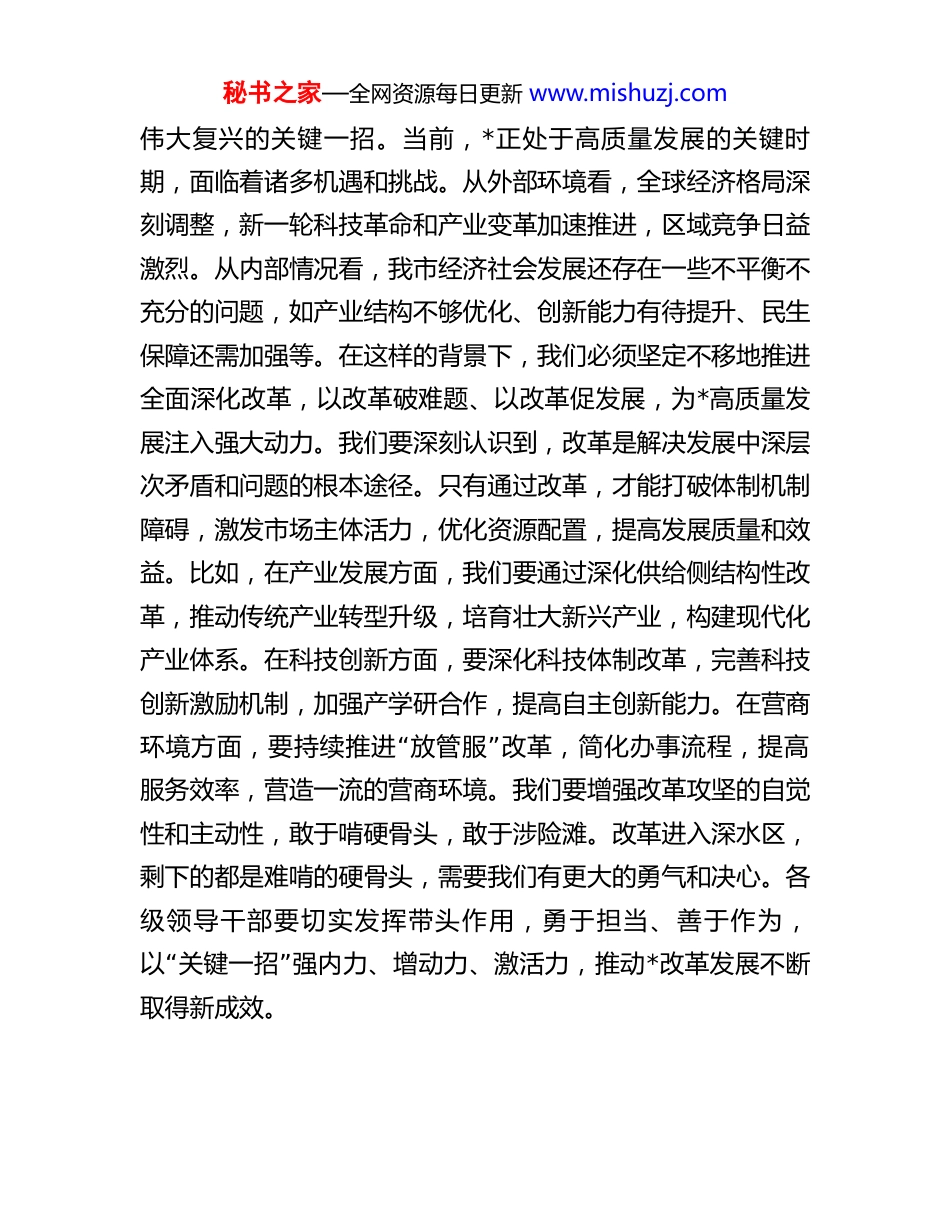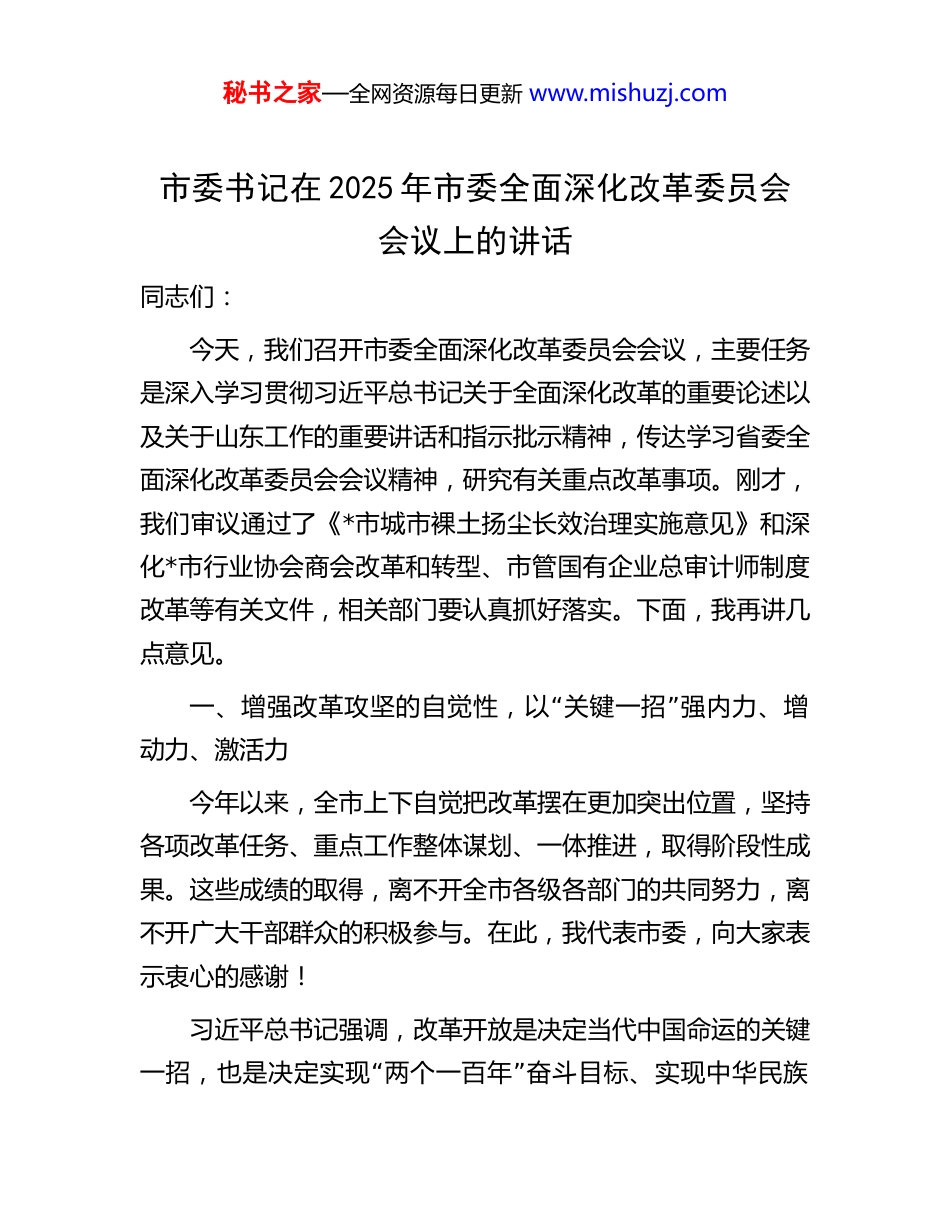 秘书之家—全网资源每日更新 www.mishuzj.com市委书记在 2025 年市委全面深化改革委员会会议上的讲话同志们:今天,我们召开市委全面深化改革委员会会议,主要任务是深入学习贯彻习近平总书记关于全面深化改革的重要论述以及关于山东工作的重要讲话和指示批示精神,传达学习省委全面深化改革委员会会议精神,研究有关重点改革事项。刚才,我们审议通过了《*市城市裸土扬尘长效治理实施意见》和深化*市行业协会商会改革和转型、市管国有企业总审计师制度改革等有关文件,相关部门要认真抓好落实。下面,我再讲几点意见。“”一、增强改革攻坚的自觉性,以 关键一招 强内力、增动力、激活力今年以来,全市上下自觉把改革摆在更加突出位置,坚持各项改革任务、重点工作整体谋划、一体推进,取得阶段性成果。这些成绩的取得,离不开全市各级各部门的共同努力,离不开广大干部群众的积极参与。在此,我代表市委,向大家表示衷心的感谢!习近平总书记强调,改革开放是决定当代中国命运的关键“”一招,也是决定实现 两个一百年 奋斗目标、实现中华民族秘书之家—全网资源每日更新 www.mishuzj.com伟大复兴的关键一招。当前,*正处于高质量发展的关键时期,面临着诸多机遇和挑战。从外部环境看,全球经济格局深刻调整,新一轮科技革命和产业变革加速推进,区域竞争日益激烈。从内部情况看,我市经济社会发展还存在一些不平衡不充分的问题,如产业结构不够优化、创新能力有待提升、民生保障还需加强等。在这样的背景下,我们必须坚定不移地推进全面深化改革,以改革破难题、以改革促发展,为*高质量发展注入强大动力。我们要深刻认识到,改革是解决发展中深层次矛盾和问题的根本途径。只有通过改革,才能打破体制机制障碍,激发市场主体活力,优化资源配置,提高发展质量和效益。比如,在产业发展方面,我们要通过深化供给侧结构性改革,推动传统产业转型升级,培育壮大新兴产业,构建现代化产业体系。在科技创新方面,要深化科技体制改革,完善科技创新激励机制,加强产学研合作,提高自主创新能力。在营商“”环境方面,要持续推进 放管服 改革,简化办事流程,提高服务效率,营造一流的营商环境。我们要增强改革攻坚的自觉性和主动性,敢于啃硬骨头,敢于涉险滩。改革进入深水区,剩下的都是难啃的硬骨头,需要我们有更大的勇气和决心。各级领导干部要切实发挥带头作用,勇于担当、善于作为,“”以 关键一招 强内力、增动力、激活力,推动*改革发展不断取得新成效。秘书之家—全网资源每日更新 www.mishuzj.com二、找准改革攻坚的发力点,聚焦激活发展动能、补齐民生短板、健全治理体系、巩固基层基础抓改革改革是一项系统工程,必须找准发力点,抓住关键环节,以重点突破带动全局发展。当前,我们要聚焦激活发展动能、补齐民生短板、健全治理体系、巩固基层基础等方面,持续深化改革。(一)激活发展动能。发展是第一要务,动能是发展的关键。我们要围绕激活发展动能,深化重点领域改革。在产业改革方面,要聚焦*的优势产业和战略性新兴产业,加大政策支持力度,推动产业链供应链优化升级。比如,我们的工程机械产业,要通过技术创新、模式创新,提升产业的核心竞争力,打造世界级产业集群。同时,要积极培育新兴产业,如人工智能、新能源、生物医药等,为*经济发展注入新的动力。在创新改革方面,要完善科技创新体制机制,加大科技投入,培育创新主体,搭建创新平台。鼓励企业加大研发投入,加强与高校、科研机构的合作,突破一批关键核心技术。要优化人才发展环境,吸引和留住各类创新人才,为科技创新提供人才支“”撑。在开放改革方面,要积极融入 一带一路 建设,加强与国内外其他地区的交流合作。提升*的开放平台功能,如黄花国际机场、*新港等,加强口岸建设,提高通关效率。推动对外贸易和投资便利化,吸引更多的外资企业来*投资兴业,同“”时鼓励本地企业 走出去 ,拓展国际市场。秘书之家—全网资源每日更新 www.mishuzj.com(二)补齐民生短板。民生是人民幸福之基、社会和谐之本。我们要坚持以人民为中心的发展思想,围绕群众关心的热点难点问题,加大...