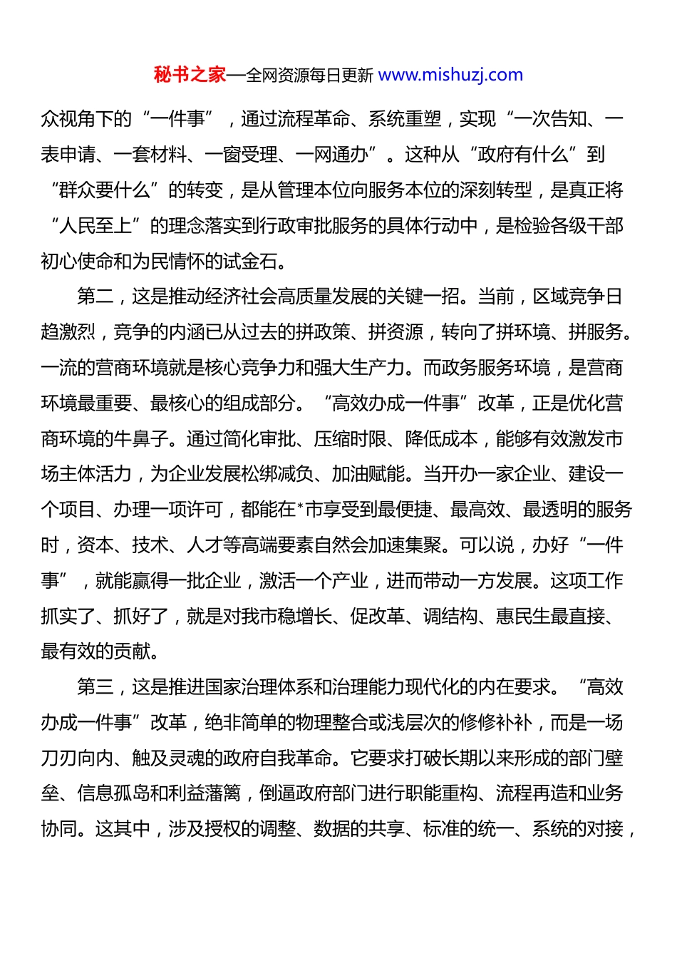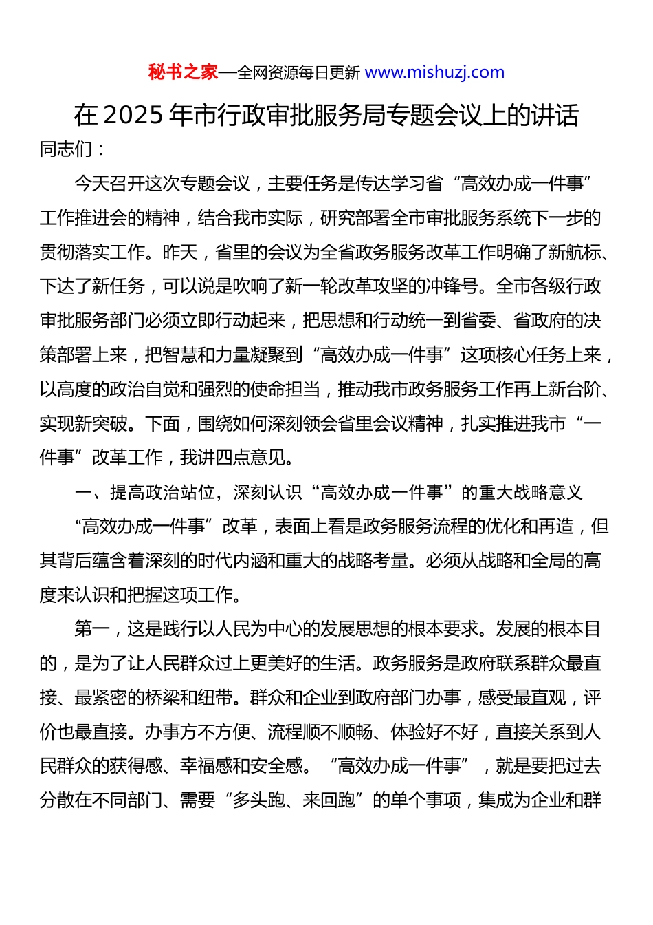 秘书之家—全网资源每日更新 www.mishuzj.com在 2025 年市行政审批服务局专题会议上的讲话同志们:今天召开这次专题会议,主要任务是传达学习省“高效办成一件事”工作推进会的精神,结合我市实际,研究部署全市审批服务系统下一步的贯彻落实工作。昨天,省里的会议为全省政务服务改革工作明确了新航标、下达了新任务,可以说是吹响了新一轮改革攻坚的冲锋号。全市各级行政审批服务部门必须立即行动起来,把思想和行动统一到省委、省政府的决策部署上来,把智慧和力量凝聚到“高效办成一件事”这项核心任务上来,以高度的政治自觉和强烈的使命担当,推动我市政务服务工作再上新台阶、实现新突破。下面,围绕如何深刻领会省里会议精神,扎实推进我市“一件事”改革工作,我讲四点意见。一、提高政治站位,深刻认识“高效办成一件事”的重大战略意义“高效办成一件事”改革,表面上看是政务服务流程的优化和再造,但其背后蕴含着深刻的时代内涵和重大的战略考量。必须从战略和全局的高度来认识和把握这项工作。第一,这是践行以人民为中心的发展思想的根本要求。发展的根本目的,是为了让人民群众过上更美好的生活。政务服务是政府联系群众最直接、最紧密的桥梁和纽带。群众和企业到政府部门办事,感受最直观,评价也最直接。办事方不方便、流程顺不顺畅、体验好不好,直接关系到人民群众的获得感、幸福感和安全感。“高效办成一件事”,就是要把过去分散在不同部门、需要“多头跑、来回跑”的单个事项,集成为企业和群秘书之家—全网资源每日更新 www.mishuzj.com众视角下的“一件事”,通过流程革命、系统重塑,实现“一次告知、一表申请、一套材料、一窗受理、一网通办”。这种从“政府有什么”到“群众要什么”的转变,是从管理本位向服务本位的深刻转型,是真正将“人民至上”的理念落实到行政审批服务的具体行动中,是检验各级干部初心使命和为民情怀的试金石。第二,这是推动经济社会高质量发展的关键一招。当前,区域竞争日趋激烈,竞争的内涵已从过去的拼政策、拼资源,转向了拼环境、拼服务。一流的营商环境就是核心竞争力和强大生产力。而政务服务环境,是营商环境最重要、最核心的组成部分。“高效办成一件事”改革,正是优化营商环境的牛鼻子。通过简化审批、压缩时限、降低成本,能够有效激发市场主体活力,为企业发展松绑减负、加油赋能。当开办一家企业、建设一个项目、办理一项许可,都能在*市享受到最便捷、最高效、最透明的服务时,资本、技术、人才等高端要素自然会加速集聚。可以说,办好“一件事”,就能赢得一批企业,激活一个产业,进而带动一方发展。这项工作抓实了、抓好了,就是对我市稳增长、促改革、调结构、惠民生最直接、最有效的贡献。第三,这是推进国家治理体系和治理能力现代化的内在要求。“高效办成一件事”改革,绝非简单的物理整合或浅层次的修修补补,而是一场刀刃向内、触及灵魂的政府自我革命。它要求打破长期以来形成的部门壁垒、信息孤岛和利益藩篱,倒逼政府部门进行职能重构、流程再造和业务协同。这其中,涉及授权的调整、数据的共享、标准的统一、系统的对接,秘书之家—全网资源每日更新 www.mishuzj.com每一项都是对传统行政管理模式的巨大挑战,也是对政府协同治理能力的全面考验。推进这项改革,能够有效提升跨部门、跨层级、跨区域的协同办事能力,推动政府运行方式从碎片化、分割化向整体性、协同性转变,这本身就是治理能力现代化的重要标志。可以说,“一件事”改革的深度,决定了政府治理现代化的程度。全市各级审批服务干部,尤其是领导干部,务必要从这三个层面深化认识,切实把“高效办成一件事”作为当前和今后一个时期的“头号工程”来抓,以“功成不必在我”的精神境界和“功成必定有我”的历史担当,坚定不移地把这项改革推向深入。二、坚持问题导向,清醒正视当前改革工作中存在的短板与不足近年来,全市审批服务系统围绕“放管服”改革,做了大量工作,也取得了一定成效,尤其是在“一窗受理”、电子证照应用、线上线下融合等方面,有了一些积极探索,为推进“一件事”改革打下了一定基础。但同时,必须清醒...