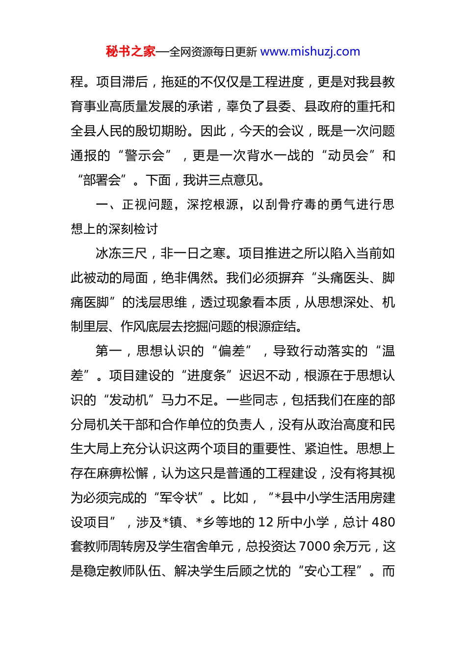 秘书之家—全网资源每日更新 www.mishuzj.com在 2025 年县教育局项目推进滞后问题整改推进会议上的讲话 同志们:今天,我们在这里召开一个紧急且至关重要的会议——*县教育局项目推进滞后问题整改推进会议。会议的主题,大家已经非常清楚,就是针对*党作风办〔2025〕10号通报文件,就我局牵头负责的“*县中小学生活用房建设项目”和“*县教育信息化基础能力提升工程”两个项目推进严重滞后的问题,进行深刻反思、全面部署、强力整改。刚才,我们共同学习了这份措辞严厉的通报文件。可以说,这份通报像一记警钟,更像一剂猛药,敲在我们每一位与教育项目建设相关同志的心上,让我们深感不安、如坐针毡。它指出的问题一针见血、切中要害,充分暴露了我们在项目管理、责任落实、工作作风等方面存在的短板和漏洞。对此,我们没有任何理由回避,更不能有丝毫辩解,必须以最诚恳的态度全盘认领、深刻检讨,以最坚决的行动彻底整改、迎头赶上。这两个项目,一个是关乎我县偏远地区教师“安居”和寄宿学生“乐学”的民生工程,一个是决定我县教育未来发展核心竞争力的战略工秘书之家—全网资源每日更新 www.mishuzj.com程。项目滞后,拖延的不仅仅是工程进度,更是对我县教育事业高质量发展的承诺,辜负了县委、县政府的重托和全县人民的殷切期盼。因此,今天的会议,既是一次问题通报的“警示会”,更是一次背水一战的“动员会”和“部署会”。下面,我讲三点意见。一、正视问题,深挖根源,以刮骨疗毒的勇气进行思想上的深刻检讨冰冻三尺,非一日之寒。项目推进之所以陷入当前如此被动的局面,绝非偶然。我们必须摒弃“头痛医头、脚痛医脚”的浅层思维,透过现象看本质,从思想深处、机制里层、作风底层去挖掘问题的根源症结。第一,思想认识的“偏差”,导致行动落实的“温差”。项目建设的“进度条”迟迟不动,根源在于思想认识的“发动机”马力不足。一些同志,包括我们在座的部分局机关干部和合作单位的负责人,没有从政治高度和民生大局上充分认识这两个项目的重要性、紧迫性。思想上存在麻痹松懈,认为这只是普通的工程建设,没有将其视为必须完成的“军令状”。比如,“*县中小学生活用房建设项目”,涉及*镇、*乡等地的 12 所中小学,总计 480套教师周转房及学生宿舍单元,总投资达 7000 余万元,这是稳定教师队伍、解决学生后顾之忧的“安心工程”。而秘书之家—全网资源每日更新 www.mishuzj.com“*县教育信息化基础能力提升工程”,涉及全县 50 所学校的智慧教室建设、校园网络升级和数据中心构建,预算达 5500 万元,这是推动教育模式变革、实现教育公平的“未来工程”。如此重要的项目,在我们一些同志眼中,却成了“慢慢来”的常规工作,缺乏“等不起、慢不得、坐不住”的责任感和紧迫感,这是最值得我们警醒和反思的。第二,统筹协调的“堵点”,造成联动机制的“断点”。教育项目建设是一项系统工程,涉及设计、招标、施工、监理、财政、自然资源等多个环节和单位,需要高效地统筹协调。但从这两个项目的推进过程来看,我们的统筹协调机制显然是失灵的。教育局作为项目业主单位,在发挥“总枢纽”作用上存在明显不足,未能有效建立起一个权责清晰、沟通顺畅、协作紧密的联动平台。各参与方,包括设计单位、施工单位、监理单位等,往往各自为战,信息壁垒高筑,形成了“信息孤岛”。一些本应在第一时间协商解决的问题,比如设计图纸的微调、施工材料的确认、现场环境的清障等,却因为沟通不畅、层层请示,变成了“马拉松式”的审批流程。这种低效的协调模式,导致了严重的内耗,让宝贵的时间在无休止地等待和推诿中白白流逝。问题的根源在于我们缺乏一个强有力秘书之家—全网资源每日更新 www.mishuzj.com的、常态化的联席会议制度和问题会商机制。第三,计划管理的“粗放”,导致过程监控的“缺位”。这次通报一针见血地指出了我们项目“推进缓慢”的问题,其背后反映的是我们项目计划管理的粗放和过程监控的缺失。我们最初制定的项目计划,往往过于笼统和原则化,缺乏对关键节点的精准把控,没有将总任务分解到月、周、日,更没有将责任明确到具体的单...