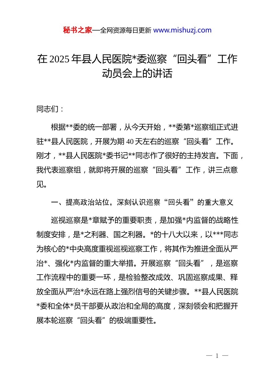秘书之家—全网资源每日更新 www.mishuzj.com在 2025 年县人民医院*委巡察“回头看”工作动员会上的讲话同志们:根据**委的统一部署,从今天开始,**委第*巡察组正式进驻**县人民医院,开展为期 40 天左右的巡察“回头看”工作。刚才,**县人民医院*委书记**同志作了很好的主持发言。下面,我代表巡察组,就即将开展的巡察“回头看”工作,讲三点意见。一、提高政治站位,深刻认识巡察“回头看”的重大意义巡视巡察是*章赋予的重要职责,是加强*内监督的战略性制度安排,是*之利器、国之利器。*的十八大以来,以***同志为核心的*中央高度重视巡视巡察工作,将其作为推进全面从严治*、强化*内监督的重大举措。开展巡察“回头看”,是巡察工作流程中的重要一环,是检验整改成效、巩固巡察成果、释放全面从严治*永远在路上强烈信号的关键步骤。**县人民医院*委和全体*员干部要从政治和全局的高度,深刻领会和把握开展本轮巡察“回头看”的极端重要性。— 1 —秘书之家—全网资源每日更新 www.mishuzj.com第一,巡察“回头看”是践行“两个维护”的政治要求和具体行动。“两个确立”是*的十八大以来最重要的政治成果,而“两个维护”是新时代我们*最重要的政治纪律和政治规矩。检验各级*组织是否真正做到“两个维护”,最直接、最现实的标尺,就是看其是否不折不扣地贯彻落实了*中央的各项决策部署。**县人民医院作为全**医疗卫生事业的龙头单位、保障人民群众生命健康的主阵地,其工作成效直接关系到民生福祉和社会稳定,关系到*和政府在人民群众心中的形象。上一轮巡察已经指出了一些问题,*委也作出了整改承诺。这次“回头看”,就是要进行一次深入的“政治复查”,看医院*委是否真正将“两个维护”融入了思想和行动,是否将*中央关于卫生健康事业发展的方针政策、**委的工作要求落到了实处,确保医院的改革发展始终沿着正确的政治方向前进。这不仅是对业务工作的检查,更是对政治忠诚、政治担当的检阅。第二,巡察“回头看”是深化标本兼治、推动全面从严治*向纵深发展的有力抓手。巡察的生命力在于整改,整改的成效决定了巡察的质量。如果巡察发现的问题没有得到彻底解决,或者出现“纸上整改”“虚假整改”,甚至边改边犯、改了又犯,那么巡察就会失去应有的权威和震慑力。“回头看”就是— 2 —秘书之家—全网资源每日更新 www.mishuzj.com要揪住不放、寸步不让,用“钉钉子”精神督促整改落实。我们要重点检查上一轮巡察反馈意见的整改情况,看责任是否压实、措施是否有力、效果是否彰显、机制是否健全。这既是对上次巡察整改成果的“再巩固”,也是对可能出现的新问题、新动向的“再发现”,更是对管*治*责任的“再传导”。通过杀“回马枪”,释放出“巡察不是一阵风”的强烈信号,让心存侥幸者受到警醒,让履责不力者受到追究,从而推动医院*委切实担负起全面从严治*主体责任,一体推进不敢腐、不能腐、不想腐的长效机制建设。第三,巡察“回头看”是回应群众期盼、保障和改善民生的现实需要。医疗卫生事业是重大的民生工程、民心工程。人民群众对高质量的医疗服务、对风清气正的就医环境有着强烈的期盼。近年来,**县人民医院在提升医疗质量、改善服务态度等方面做了大量工作,取得了积极成效,例如,相关数据显示,门诊和住院患者满意度分别达到了 97.57%和 98.54%。这些成绩值得肯定。但我们必须清醒地认识到,群众身边的腐败和不正之风问题,哪怕是极少数,也足以侵蚀群众的获得感和信任感。本次“回头看”,将继续把群众反映强烈的突出问题作为监督重点,深入了解在药品采购、设备引进、工程建设、— 3 —秘书之家—全网资源每日更新 www.mishuzj.com医德医风等方面是否存在廉洁风险和违规违纪行为,推动解决群众“看病难、看病贵”等急难愁盼问题。我们的最终目的,是通过政治监督,督促医院*委更好地履行公益属性,不断提升服务能力和管理水平,让全**人民享受到更加优质、高效、便捷、安全的医疗健康服务,将巡察成效真正体现在增进民生福祉上。二、聚焦监督重点,精准有效开展政治“复查”本次巡察“回头看”将严格按照**委的要求,坚持问题导向,...