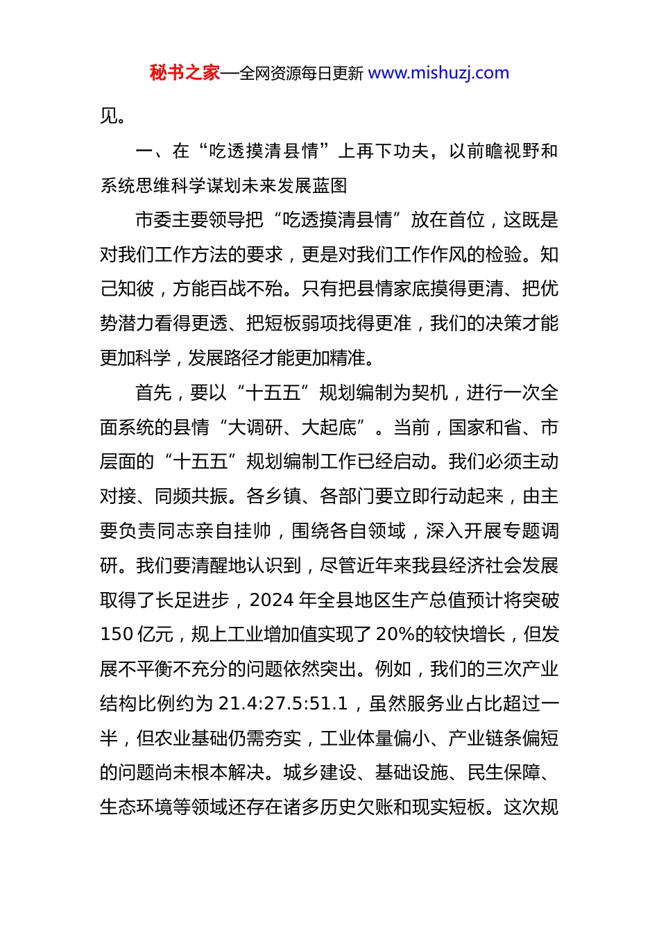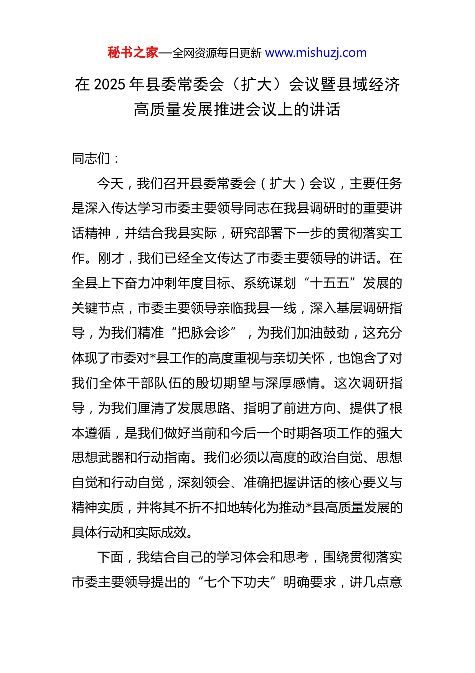 秘书之家—全网资源每日更新 www.mishuzj.com在 2025 年县委常委会(扩大)会议暨县域经济高质量发展推进会议上的讲话 同志们:今天,我们召开县委常委会(扩大)会议,主要任务是深入传达学习市委主要领导同志在我县调研时的重要讲话精神,并结合我县实际,研究部署下一步的贯彻落实工作。刚才,我们已经全文传达了市委主要领导的讲话。在全县上下奋力冲刺年度目标、系统谋划“十五五”发展的关键节点,市委主要领导亲临我县一线,深入基层调研指导,为我们精准“把脉会诊”,为我们加油鼓劲,这充分体现了市委对*县工作的高度重视与亲切关怀,也饱含了对我们全体干部队伍的殷切期望与深厚感情。这次调研指导,为我们厘清了发展思路、指明了前进方向、提供了根本遵循,是我们做好当前和今后一个时期各项工作的强大思想武器和行动指南。我们必须以高度的政治自觉、思想自觉和行动自觉,深刻领会、准确把握讲话的核心要义与精神实质,并将其不折不扣地转化为推动*县高质量发展的具体行动和实际成效。下面,我结合自己的学习体会和思考,围绕贯彻落实市委主要领导提出的“七个下功夫”明确要求,讲几点意秘书之家—全网资源每日更新 www.mishuzj.com见。一、在“吃透摸清县情”上再下功夫,以前瞻视野和系统思维科学谋划未来发展蓝图市委主要领导把“吃透摸清县情”放在首位,这既是对我们工作方法的要求,更是对我们工作作风的检验。知己知彼,方能百战不殆。只有把县情家底摸得更清、把优势潜力看得更透、把短板弱项找得更准,我们的决策才能更加科学,发展路径才能更加精准。首先,要以“十五五”规划编制为契机,进行一次全面系统的县情“大调研、大起底”。当前,国家和省、市层面的“十五五”规划编制工作已经启动。我们必须主动对接、同频共振。各乡镇、各部门要立即行动起来,由主要负责同志亲自挂帅,围绕各自领域,深入开展专题调研。我们要清醒地认识到,尽管近年来我县经济社会发展取得了长足进步,2024 年全县地区生产总值预计将突破150 亿元,规上工业增加值实现了 20%的较快增长,但发展不平衡不充分的问题依然突出。例如,我们的三次产业结构比例约为 21.4:27.5:51.1,虽然服务业占比超过一半,但农业基础仍需夯实,工业体量偏小、产业链条偏短的问题尚未根本解决。城乡建设、基础设施、民生保障、生态环境等领域还存在诸多历史欠账和现实短板。这次规秘书之家—全网资源每日更新 www.mishuzj.com划编制,绝不能停留在办公室里翻材料、抄数据,而是要真正沉下去,用脚步丈量土地,用真心倾听民声,把产业发展的瓶颈、基础设施的断点、民生服务的痛点、生态治理的难点一一摸排清楚,形成高质量的调研报告,为科学编制规划提供最扎实的一手资料。其次,要以项目化思维谋划长远,构建支撑高质量发展的“四梁八柱”。规划的生命力在于落地,而项目是规划落地的核心载体。在编制“十五五”规划的过程中,我们必须牢固树立“项目为王”的理念,紧盯国家政策导向和投资方向,着眼于补短板、强弱项、增后劲,谋划储备一批具有全局性、基础性、战略性意义的重大项目。初步设想,在“十五五”期间,我们将重点推动三大标志性工程:一是“*县环城高速公路项目”,预计总投资 50 亿元,旨在彻底打通县域交通外循环,提升我县作为区域交通节点的战略地位;二是“*河流域生态综合治理工程”,计划投资 30 亿元,通过水系连通、岸线整治、水源涵养等系列措施,打造一条贯穿全县的生态绿廊和经济走廊;三是“*县数字经济产业园”,预计投资 20 亿元,聚焦大数据、人工智能、高端装备制造等新兴产业,打造县域经济新的增长极。各分管领导、各部门要牵头成立工作专班,对这些重大项目进行深入论证,明确建设内容、投资规秘书之家—全网资源每日更新 www.mishuzj.com模、资金来源和预期效益,力争将更多项目挤进国家和省、市的“大盘子”,为*县未来五年的发展积蓄磅礴力量。再者,要以创新思维破解发展难题,为县域发展注入新动能。面对当前复杂多变的经济形势和日益激烈的区域竞争,我们不能因循守旧、按部就班,而必须敢于突破传统思维定式,积极探索符合县情实际的...