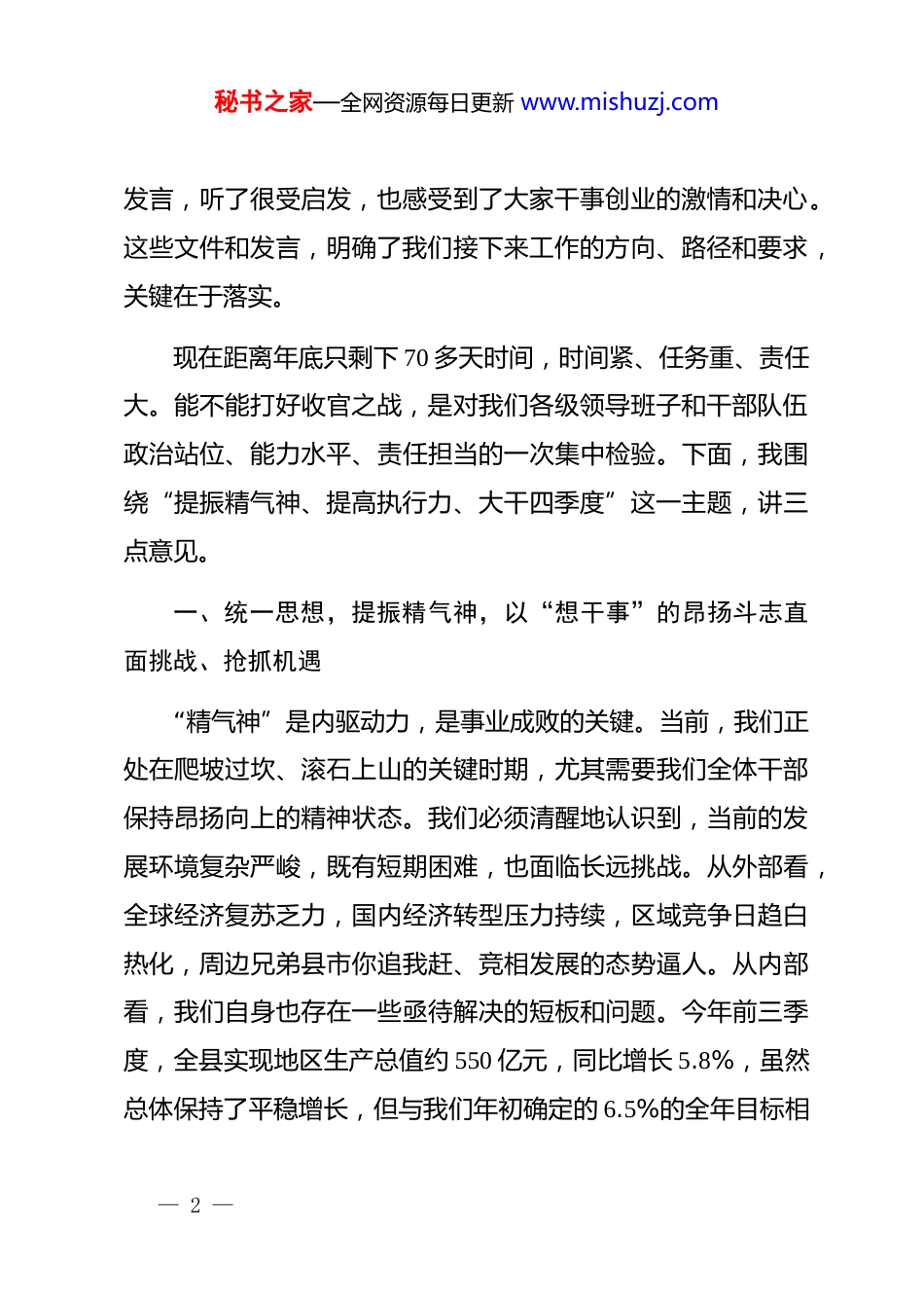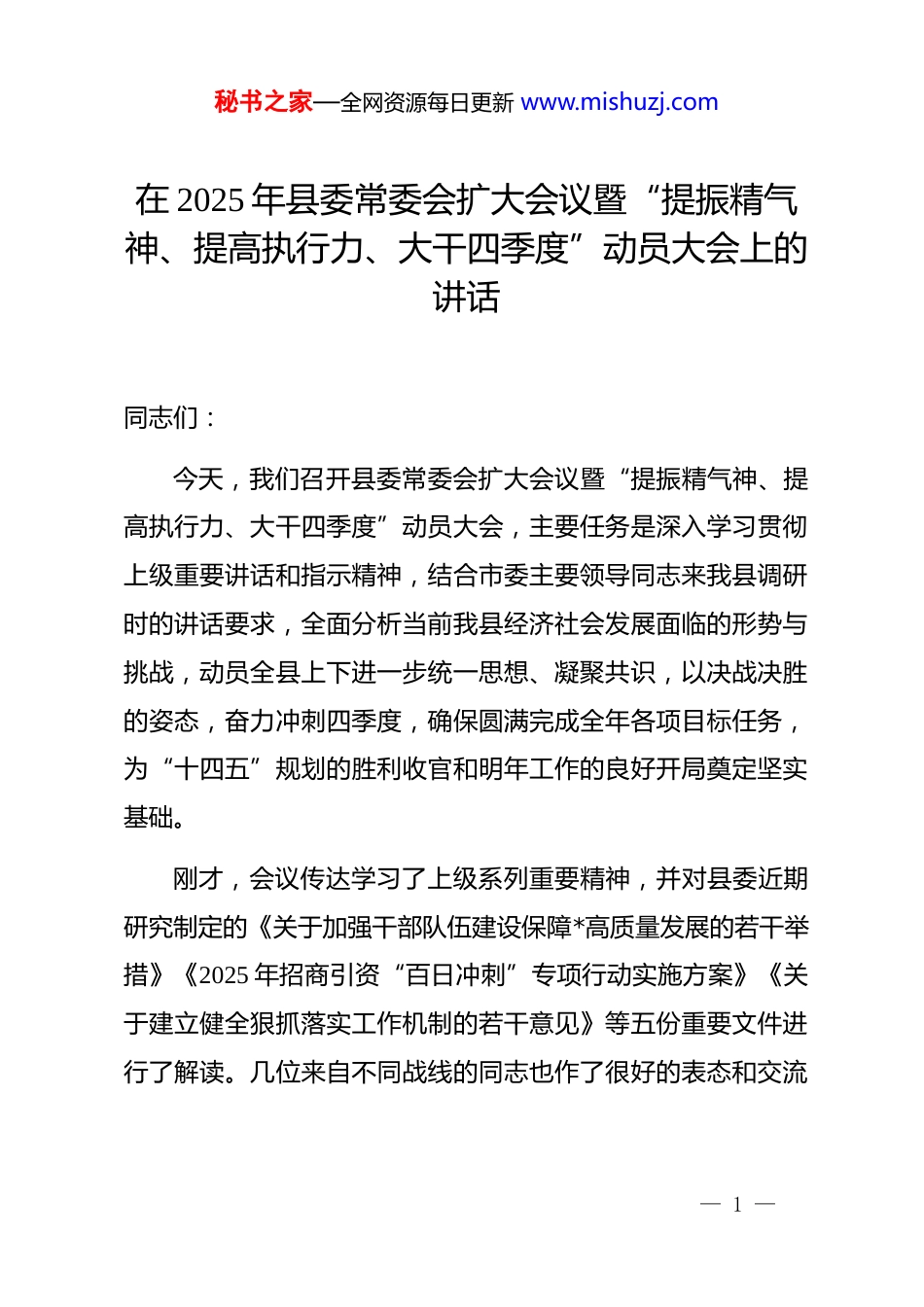 秘书之家—全网资源每日更新 www.mishuzj.com在 2025 年县委常委会扩大会议暨“提振精气神、提高执行力、大干四季度”动员大会上的讲话同志们:今天,我们召开县委常委会扩大会议暨“提振精气神、提高执行力、大干四季度”动员大会,主要任务是深入学习贯彻上级重要讲话和指示精神,结合市委主要领导同志来我县调研时的讲话要求,全面分析当前我县经济社会发展面临的形势与挑战,动员全县上下进一步统一思想、凝聚共识,以决战决胜的姿态,奋力冲刺四季度,确保圆满完成全年各项目标任务,为“十四五”规划的胜利收官和明年工作的良好开局奠定坚实基础。刚才,会议传达学习了上级系列重要精神,并对县委近期研究制定的《关于加强干部队伍建设保障*高质量发展的若干举措》《2025 年招商引资“百日冲刺”专项行动实施方案》《关于建立健全狠抓落实工作机制的若干意见》等五份重要文件进行了解读。几位来自不同战线的同志也作了很好的表态和交流— 1 —秘书之家—全网资源每日更新 www.mishuzj.com发言,听了很受启发,也感受到了大家干事创业的激情和决心。这些文件和发言,明确了我们接下来工作的方向、路径和要求,关键在于落实。现在距离年底只剩下 70 多天时间,时间紧、任务重、责任大。能不能打好收官之战,是对我们各级领导班子和干部队伍政治站位、能力水平、责任担当的一次集中检验。下面,我围绕“提振精气神、提高执行力、大干四季度”这一主题,讲三点意见。一、统一思想,提振精气神,以“想干事”的昂扬斗志直面挑战、抢抓机遇“精气神”是内驱动力,是事业成败的关键。当前,我们正处在爬坡过坎、滚石上山的关键时期,尤其需要我们全体干部保持昂扬向上的精神状态。我们必须清醒地认识到,当前的发展环境复杂严峻,既有短期困难,也面临长远挑战。从外部看,全球经济复苏乏力,国内经济转型压力持续,区域竞争日趋白热化,周边兄弟县市你追我赶、竞相发展的态势逼人。从内部看,我们自身也存在一些亟待解决的短板和问题。今年前三季度,全县实现地区生产总值约 550 亿元,同比增长 5.8%,虽然总体保持了平稳增长,但与我们年初确定的 6.5%的全年目标相— 2 —秘书之家—全网资源每日更新 www.mishuzj.com比,还有一定差距。部分关键经济指标,如固定资产投资增速虽然达到 7%,但新开工重大项目支撑力尚显不足;社会消费品零售总额增长 8%,但新的消费热点培育仍需加力。这些数据背后,反映出的是我们产业结构调整的阵痛、有效需求不足的压力以及部分干部担当作为不够的现实问题。面对困难和挑战,是畏缩不前、怨天尤人,还是迎难而上奋发有为?答案不言而喻。悲观者永远正确,但乐观者才能赢得未来。我们既要正视困难、看到问题,更要善于在危机中育新机、于变局中开新局,坚定发展的信心和决心。我们的信心从何而来?信心来自宏观政策的强力支撑。从中央到省、市,一系列稳增长、促改革、调结构、惠民生的政策措施密集出台,政策的叠加效应正在持续释放。特别是对实体经济、科技创新、区域协调发展等领域的支持力度前所未有,这为我们争取项目、资金和试点示范创造了极为有利的条件。我们必须紧紧抓住这个窗口期,主动对接,精准发力,将政策红利最大限度地转化为*的发展实效。信心来自自身发展的坚实基础。经过多年的不懈努力,我县已经形成了较为完备的产业体系。我们的高端装备制造、新材料等主导产业集群效应初显,三次产业结构持续优化,由去年的 8:46:46 调整为目前的 8:45:47,第三产业— 3 —秘书之家—全网资源每日更新 www.mishuzj.com占比稳步提升,经济发展的韧性和活力不断增强。今年以来,我们成功引进了投资额达 20 亿元的*智能装备制造基地项目和投资额 15 亿元的*新材料产业园项目,这些百亿级、十亿级的重大项目,就是我们未来发展的“压舱石”和“新引擎”,它们将在不远的将来释放出巨大的经济和社会效益。信心来自营商环境的持续优化。近年来,我们坚持把优化营商环境作为“一号改革工程”,深入推进“放管服”改革,大力推行“一枚印章管审批”“一窗受理、并联审批”等模式,企业开办时间已压缩至半个工作日...