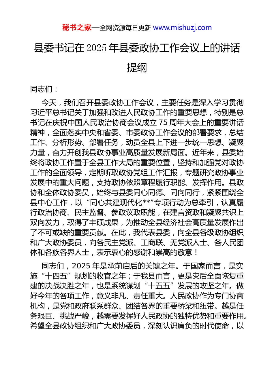 秘书之家—全网资源每日更新 www.mishuzj.com县委书记在 2025 年县委政协工作会议上的讲话提纲同志们:今天,我们召开县委政协工作会议,主要任务是深入学习贯彻习近平总书记关于加强和改进人民政协工作的重要思想,特别是总书记在庆祝中国人民政治协商会议成立 75 周年大会上的重要讲话精神,全面落实中央和省委、市委政协工作会议的部署要求,总结工作、分析形势、部署任务,动员全县上下进一步统一思想、凝聚力量,奋力开创我县政协事业高质量发展新局面。近年来,县委始终将政协工作置于全县工作大局的重要位置,坚持和加强党对政协工作的全面领导,定期听取政协党组工作汇报,专题研究政协事业发展中的重大问题,支持政协依照章程履行职能、发挥作用。县政协和全体政协委员,始终与县委同心同德、同向同行,紧紧围绕全县中心工作,以“同心共建现代化**”专项行动为总牵引,认真履行政治协商、民主监督、参政议政职能,在建言资政和凝聚共识上双向发力,取得了丰硕成果,为推动全县经济社会高质量发展作出了不可或缺的重要贡献。在此,我代表县委,向全县各级政协组织和广大政协委员,向各民主党派、工商联、无党派人士、各人民团体和各族各界人士,表示衷心的感谢和崇高的敬意!同志们,2025 年是承前启后的关键之年。于国家而言,是实施“十四五”规划的收官之年;于我县而言,更是灾后全面恢复重建的决战决胜之年,也是系统谋划“十五五”发展的攻坚之年。做好今年的各项工作,意义非凡、责任重大。人民政协作为专门协商机构,是党和政府联系群众、团结各界的重要桥梁和纽带。越是任务艰巨、挑战严峻,越需要发挥好人民政协的独特优势和重要作用。希望全县政协组织和广大政协委员,深刻认识肩负的时代使命,以秘书之家—全网资源每日更新 www.mishuzj.com更高站位、更实举措、更强担当,在新的征程上再创佳绩、再立新功。下面,我讲几点意见。一、坚持党的全面领导,在把牢政治方向上彰显新高度中国共产党领导是人民政协事业发展进步的根本保证。做好新时代政协工作,最根本的就是要毫不动摇地坚持党的领导。(一)要筑牢绝对忠诚的政治品格。要始终将习近平新时代中国特色社会主义思想作为统揽政协工作的总纲,深刻领悟“两个确立”的决定性意义,增强“四个意识”、坚定“四个自信”、做到“两个维护”。要持续巩固拓展主题教育成果,建立健全以学铸魂、以学增智、以学正风、以学促干的长效机制,引导广大政协委员和各族各界人士,不断增进对中国共产党和中国特色社会主义的政治认同、思想认同、理论认同、情感认同,确保人民政协事业始终沿着正确政治方向前进。(二)要确保党的工作对政协委员的全覆盖。要充分发挥政协党组在政协组织中的领导核心作用,认真执行《中国共产党政治协商工作条例》,严格落实重大问题、重要事项向县委请示报告制度。要创新党的工作方式,积极探索“政协党组成员联系党员常委、党员常委联系党员委员、党员委员联系党外委员”等机制,通过“委员活动之家”、“委员工作室”等平台,把党的政治主张和路线方针政策,转化为社会各界的广泛共识和自觉行动。要加强功能型党支部建设,确保党的组织和党的工作在政协履职的各领域、各环节、各层级实现有效覆盖,做到哪里有政协委员,哪里就有党的工作;哪里有政协组织,哪里就有坚强的党的领导。(三)要坚决贯彻县委的决策部署。政协工作是党的工作的重要组成部分,必须自觉置于县委的统一领导之下。县政协党组要主动围绕县委的中心工作来谋划和推进自身工作,做到县委的工作重心推进到哪里,政协的力量就汇聚到哪里;县委的决策部署落实到哪里,政协的作用就发挥到哪里。要引导广大政协委员深刻理解县委的战略意图和工作部署,不仅要做县委决策的宣传者、推动者,秘书之家—全网资源每日更新 www.mishuzj.com更要当好社情民意的“信息员”、政策落实的“监督员”,确保县委的各项决策部署不折不扣地落到实处,转化为全县人民的共同奋斗目标。二、服务中心大局,在助推高质量发展上作出新贡献围绕中心、服务大局,是人民政协履行职能的基本遵循。当前,我县正处于灾后重建与转型发展的双重...