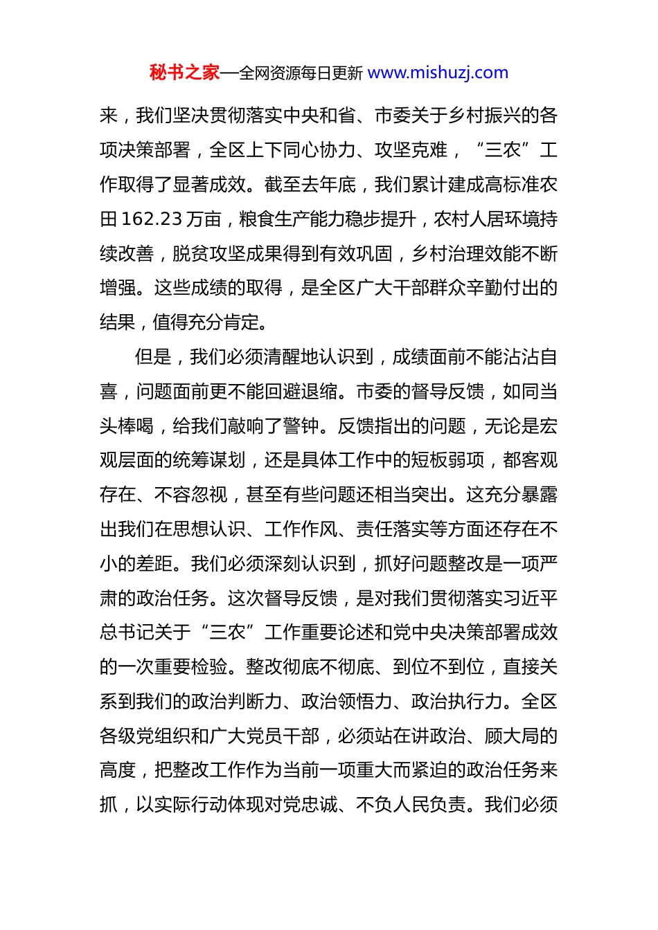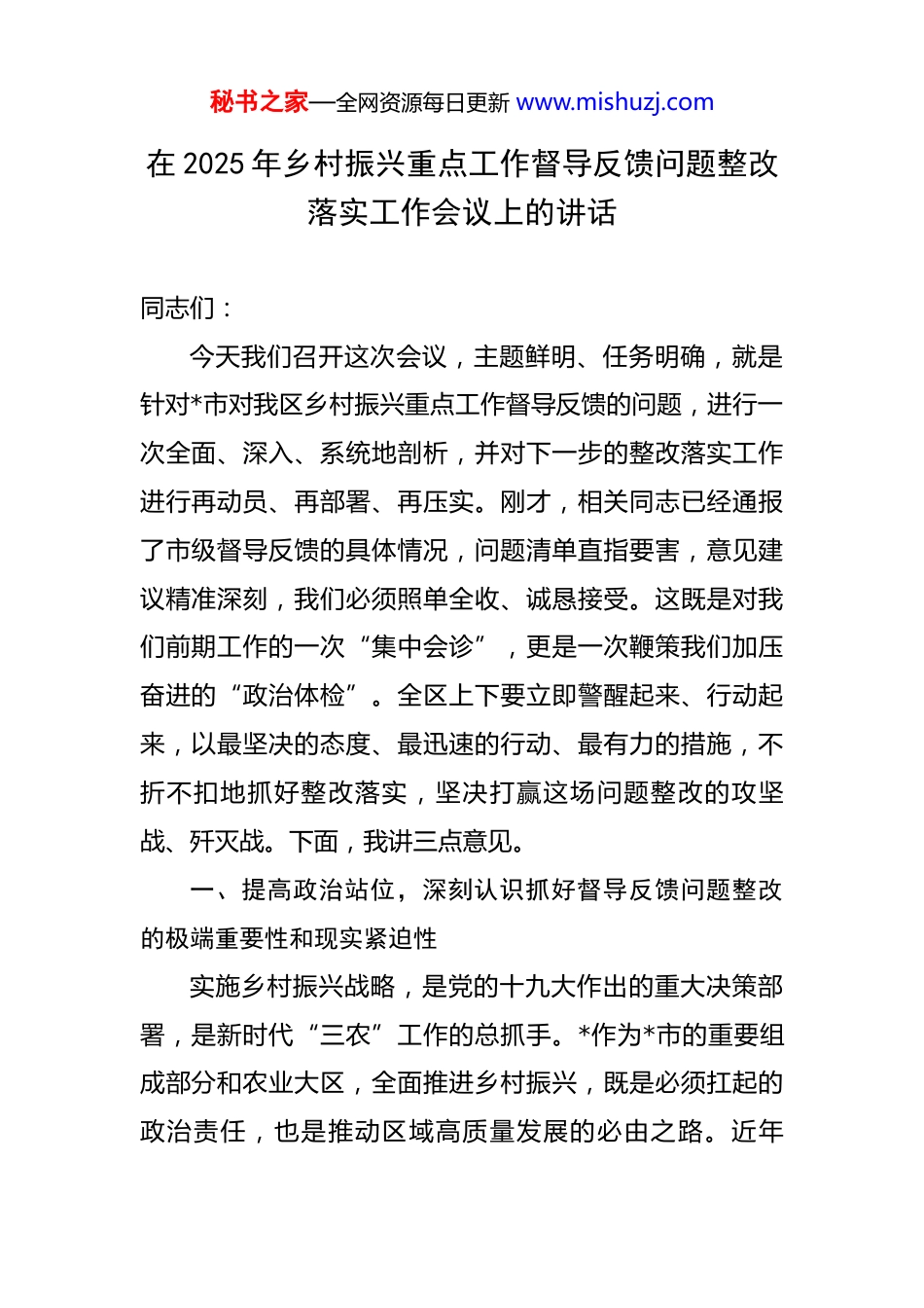 秘书之家—全网资源每日更新 www.mishuzj.com在 2025 年乡村振兴重点工作督导反馈问题整改落实工作会议上的讲话 同志们:今天我们召开这次会议,主题鲜明、任务明确,就是针对*市对我区乡村振兴重点工作督导反馈的问题,进行一次全面、深入、系统地剖析,并对下一步的整改落实工作进行再动员、再部署、再压实。刚才,相关同志已经通报了市级督导反馈的具体情况,问题清单直指要害,意见建议精准深刻,我们必须照单全收、诚恳接受。这既是对我们前期工作的一次“集中会诊”,更是一次鞭策我们加压奋进的“政治体检”。全区上下要立即警醒起来、行动起来,以最坚决的态度、最迅速的行动、最有力的措施,不折不扣地抓好整改落实,坚决打赢这场问题整改的攻坚战、歼灭战。下面,我讲三点意见。一、提高政治站位,深刻认识抓好督导反馈问题整改的极端重要性和现实紧迫性实施乡村振兴战略,是党的十九大作出的重大决策部署,是新时代“三农”工作的总抓手。*作为*市的重要组成部分和农业大区,全面推进乡村振兴,既是必须扛起的政治责任,也是推动区域高质量发展的必由之路。近年秘书之家—全网资源每日更新 www.mishuzj.com来,我们坚决贯彻落实中央和省、市委关于乡村振兴的各项决策部署,全区上下同心协力、攻坚克难,“三农”工作取得了显著成效。截至去年底,我们累计建成高标准农田 162.23 万亩,粮食生产能力稳步提升,农村人居环境持续改善,脱贫攻坚成果得到有效巩固,乡村治理效能不断增强。这些成绩的取得,是全区广大干部群众辛勤付出的结果,值得充分肯定。但是,我们必须清醒地认识到,成绩面前不能沾沾自喜,问题面前更不能回避退缩。市委的督导反馈,如同当头棒喝,给我们敲响了警钟。反馈指出的问题,无论是宏观层面的统筹谋划,还是具体工作中的短板弱项,都客观存在、不容忽视,甚至有些问题还相当突出。这充分暴露出我们在思想认识、工作作风、责任落实等方面还存在不小的差距。我们必须深刻认识到,抓好问题整改是一项严肃的政治任务。这次督导反馈,是对我们贯彻落实习近平总书记关于“三农”工作重要论述和党中央决策部署成效的一次重要检验。整改彻底不彻底、到位不到位,直接关系到我们的政治判断力、政治领悟力、政治执行力。全区各级党组织和广大党员干部,必须站在讲政治、顾大局的高度,把整改工作作为当前一项重大而紧迫的政治任务来抓,以实际行动体现对党忠诚、不负人民负责。我们必须秘书之家—全网资源每日更新 www.mishuzj.com深刻认识到,抓好问题整改是补齐发展短板的迫切需要。问题是时代的声音,也是工作进步的阶梯。督导反馈指出的高标准农田建设资金拨付进度、第一产业增加值增速乏力、巩固拓展脱贫攻坚成果长效机制不健全等问题,都是制约我区乡村振兴向纵深推进的“中梗阻”和“绊脚石”。如果我们对这些问题视而不见、麻木不仁,那么乡村产业的“根基”就不牢,农民增收的“渠道”就不宽,乡村建设的“底色”就不亮。我们必须坚持问题导向,把整改过程变成解决问题、堵塞漏洞、补齐短板的过程,真正实现“整改一个问题、提升一个领域”。我们必须深刻认识到,抓好问题整改是回应群众期盼的必然要求。乡村振兴,最终的落脚点是让广大农民过上更加美好的生活。群众的满意度、获得感,是检验我们工作成效的唯一标准。市级督导组发现的问题,很多都与群众的切身利益息息相关。比如,一些惠农政策落实不到位,一些基础设施建设滞后,一些富民产业带动能力不强等等。这些问题解决不好,就会直接影响群众对我们党委、政府的信任。我们必须始终坚持以人民为中心的发展思想,带着深厚的感情去抓整改,用心用情用力解决好群众的急难愁盼问题,确保乡村振兴的成果能够真正惠及千家万户,交出一份让人民群众满意的时代答卷。秘书之家—全网资源每日更新 www.mishuzj.com二、聚焦核心问题,以钉钉子精神全面彻底抓好整改任务落实问题已经摆在面前,回避没有出路,懈怠等于失职。全区上下必须立即行动,对照市级督导反馈意见,逐条逐项建立台账,制定“时间表”和“路线图”,实行销号管理,确保事事有回音、件件有着落。第一,要聚焦“硬任务”...