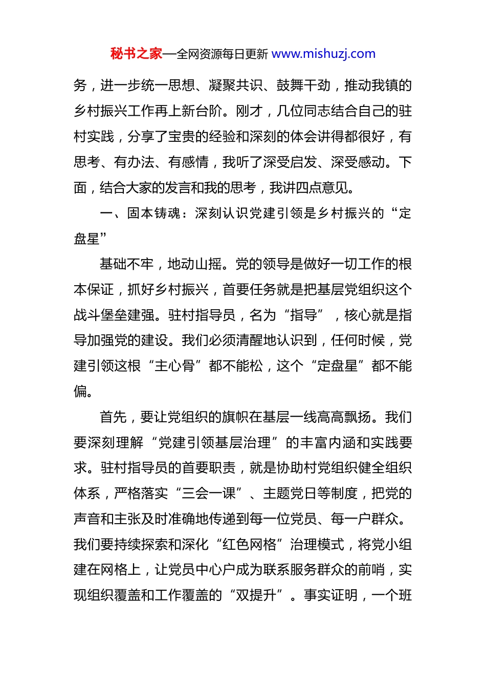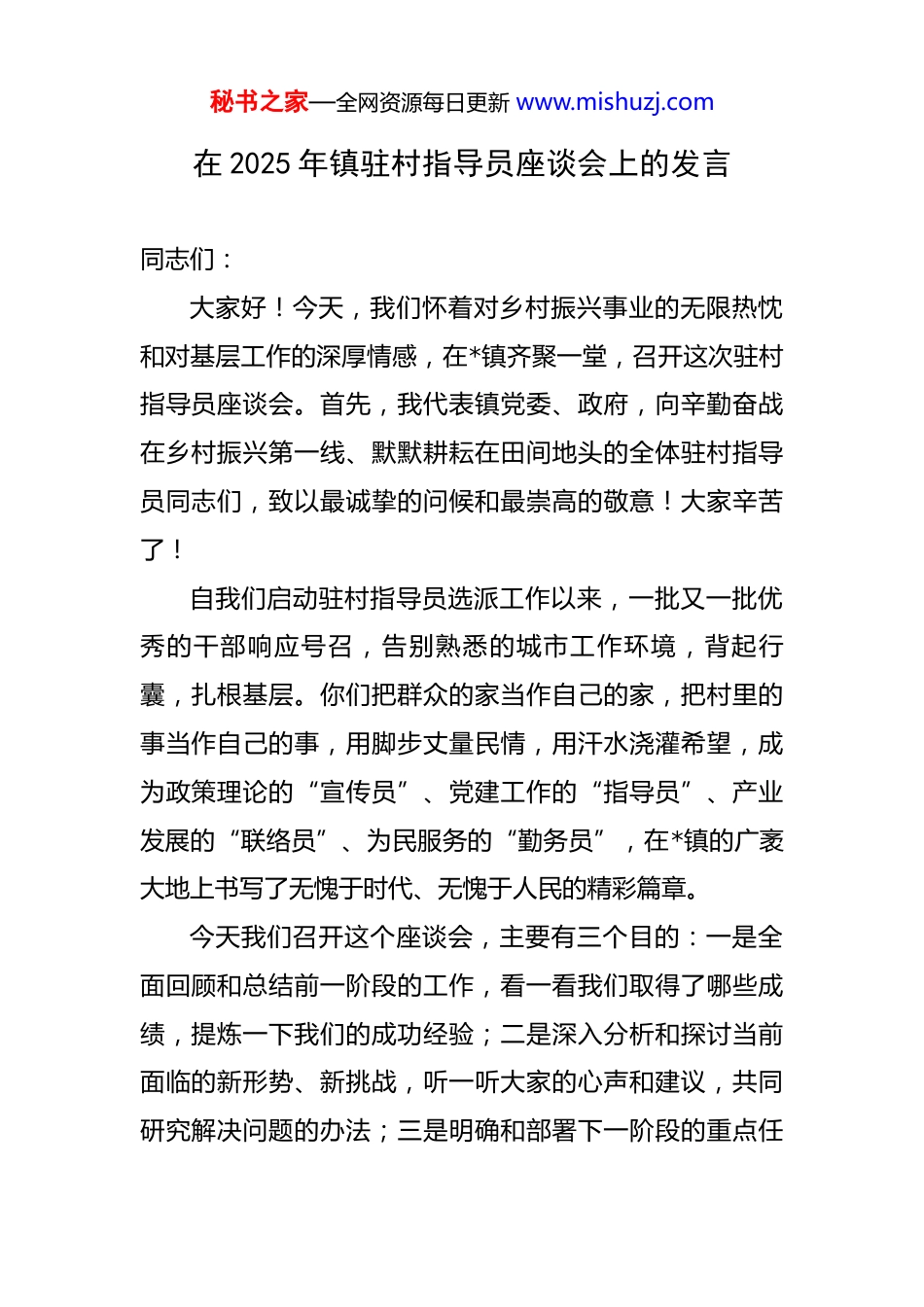秘书之家—全网资源每日更新 www.mishuzj.com在 2025 年镇驻村指导员座谈会上的发言 同志们:大家好!今天,我们怀着对乡村振兴事业的无限热忱和对基层工作的深厚情感,在*镇齐聚一堂,召开这次驻村指导员座谈会。首先,我代表镇党委、政府,向辛勤奋战在乡村振兴第一线、默默耕耘在田间地头的全体驻村指导员同志们,致以最诚挚的问候和最崇高的敬意!大家辛苦了!自我们启动驻村指导员选派工作以来,一批又一批优秀的干部响应号召,告别熟悉的城市工作环境,背起行囊,扎根基层。你们把群众的家当作自己的家,把村里的事当作自己的事,用脚步丈量民情,用汗水浇灌希望,成为政策理论的“宣传员”、党建工作的“指导员”、产业发展的“联络员”、为民服务的“勤务员”,在*镇的广袤大地上书写了无愧于时代、无愧于人民的精彩篇章。今天我们召开这个座谈会,主要有三个目的:一是全面回顾和总结前一阶段的工作,看一看我们取得了哪些成绩,提炼一下我们的成功经验;二是深入分析和探讨当前面临的新形势、新挑战,听一听大家的心声和建议,共同研究解决问题的办法;三是明确和部署下一阶段的重点任秘书之家—全网资源每日更新 www.mishuzj.com务,进一步统一思想、凝聚共识、鼓舞干劲,推动我镇的乡村振兴工作再上新台阶。刚才,几位同志结合自己的驻村实践,分享了宝贵的经验和深刻的体会讲得都很好,有思考、有办法、有感情,我听了深受启发、深受感动。下面,结合大家的发言和我的思考,我讲四点意见。一、固本铸魂:深刻认识党建引领是乡村振兴的“定盘星”基础不牢,地动山摇。党的领导是做好一切工作的根本保证,抓好乡村振兴,首要任务就是把基层党组织这个战斗堡垒建强。驻村指导员,名为“指导”,核心就是指导加强党的建设。我们必须清醒地认识到,任何时候,党建引领这根“主心骨”都不能松,这个“定盘星”都不能偏。首先,要让党组织的旗帜在基层一线高高飘扬。我们要深刻理解“党建引领基层治理”的丰富内涵和实践要求。驻村指导员的首要职责,就是协助村党组织健全组织体系,严格落实“三会一课”、主题党日等制度,把党的声音和主张及时准确地传递到每一位党员、每一户群众。我们要持续探索和深化“红色网格”治理模式,将党小组建在网格上,让党员中心户成为联系服务群众的前哨,实现组织覆盖和工作覆盖的“双提升”。事实证明,一个班秘书之家—全网资源每日更新 www.mishuzj.com子强、作风正的村党支部,其凝聚力、号召力和战斗力是无穷的。在疫情防控、防汛抗台等急难险重任务中,正是依靠坚强的党组织,我们才能迅速动员起像公安民警、社区工作者和广大志愿者这样强大的力量,筑起守护人民群众生命财产安全的坚固防线。其次,要将党建优势转化为治理效能和发展动能。党建工作不能搞“空对空”,必须与中心工作深度融合,做到同频共振。我们的驻村工作,本质上就是党建引领下的具体实践。大家要善于把党的政治优势、组织优势转化为推动发展的优势。例如,在推动“*市*生态新城重点建设项目”“*县‘两河四岸’综合开发项目”等重大项目落地时,驻村指导员就要发挥好桥梁纽带作用,协助村“两委”做好政策解释、群众动员、矛盾化解等工作,确保项目顺利推进。在发展集体经济上,要指导村党组织领办合作社,把分散的农户组织起来,形成发展合力。正如浙江“千万工程”和“枫桥经验”所揭示的,只有坚持党建引领,才能有效整合资源、凝聚人心,实现治理有效与经济发展的良性互动。我们必须牢牢抓住党建这个总抓手,真正把党的领导落实到乡村振兴的每一个角落、每一个环节。再者,要强化党员队伍教育管理,提升基层党组织的秘书之家—全网资源每日更新 www.mishuzj.com战斗力。党员是党组织的细胞,党员队伍的素质直接关系到党组织的凝聚力和战斗力。我们要通过定期开展党员培训、主题党日活动等形式,加强对党员的思想政治教育,提高党员的政治觉悟和业务能力。同时,要建立健全党员考核评价机制,对表现优秀的党员给予表彰和奖励,对不合格的党员进行批评教育和帮助整改,激发党员的积极性和主动性。通过强化党员队伍教育管理,我们可以打造一支忠诚干净担...