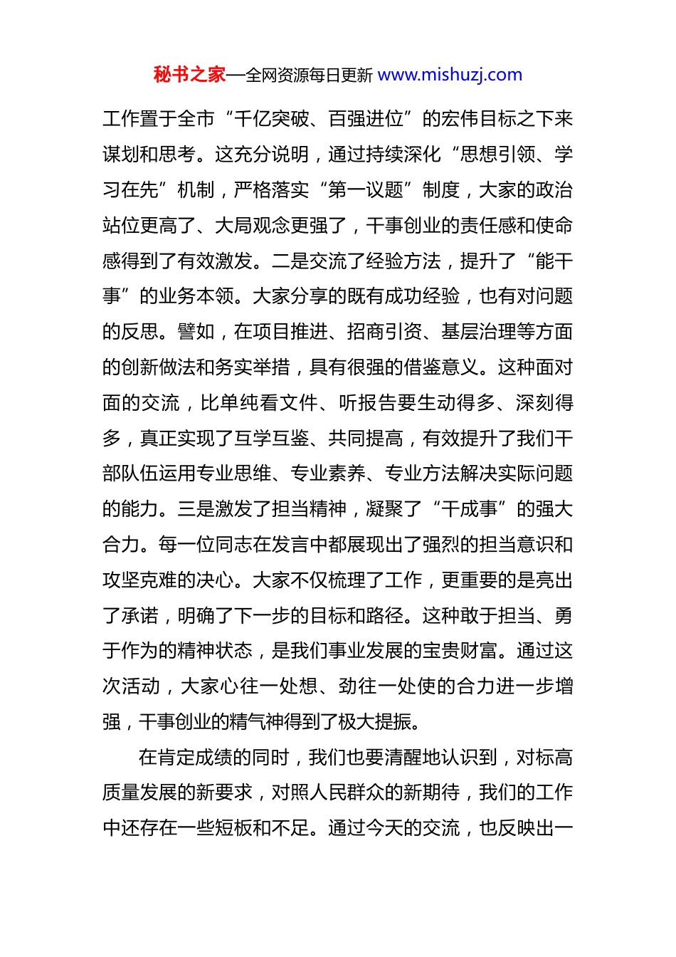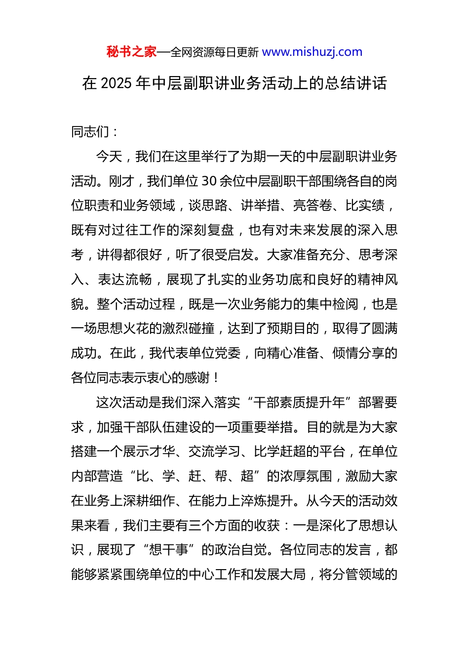 秘书之家—全网资源每日更新 www.mishuzj.com在 2025 年中层副职讲业务活动上的总结讲话 同志们:今天,我们在这里举行了为期一天的中层副职讲业务活动。刚才,我们单位 30 余位中层副职干部围绕各自的岗位职责和业务领域,谈思路、讲举措、亮答卷、比实绩,既有对过往工作的深刻复盘,也有对未来发展的深入思考,讲得都很好,听了很受启发。大家准备充分、思考深入、表达流畅,展现了扎实的业务功底和良好的精神风貌。整个活动过程,既是一次业务能力的集中检阅,也是一场思想火花的激烈碰撞,达到了预期目的,取得了圆满成功。在此,我代表单位党委,向精心准备、倾情分享的各位同志表示衷心的感谢!这次活动是我们深入落实“干部素质提升年”部署要求,加强干部队伍建设的一项重要举措。目的就是为大家搭建一个展示才华、交流学习、比学赶超的平台,在单位内部营造“比、学、赶、帮、超”的浓厚氛围,激励大家在业务上深耕细作、在能力上淬炼提升。从今天的活动效果来看,我们主要有三个方面的收获:一是深化了思想认识,展现了“想干事”的政治自觉。各位同志的发言,都能够紧紧围绕单位的中心工作和发展大局,将分管领域的秘书之家—全网资源每日更新 www.mishuzj.com工作置于全市“千亿突破、百强进位”的宏伟目标之下来谋划和思考。这充分说明,通过持续深化“思想引领、学习在先”机制,严格落实“第一议题”制度,大家的政治站位更高了、大局观念更强了,干事创业的责任感和使命感得到了有效激发。二是交流了经验方法,提升了“能干事”的业务本领。大家分享的既有成功经验,也有对问题的反思。譬如,在项目推进、招商引资、基层治理等方面的创新做法和务实举措,具有很强的借鉴意义。这种面对面的交流,比单纯看文件、听报告要生动得多、深刻得多,真正实现了互学互鉴、共同提高,有效提升了我们干部队伍运用专业思维、专业素养、专业方法解决实际问题的能力。三是激发了担当精神,凝聚了“干成事”的强大合力。每一位同志在发言中都展现出了强烈的担当意识和攻坚克难的决心。大家不仅梳理了工作,更重要的是亮出了承诺,明确了下一步的目标和路径。这种敢于担当、勇于作为的精神状态,是我们事业发展的宝贵财富。通过这次活动,大家心往一处想、劲往一处使的合力进一步增强,干事创业的精气神得到了极大提振。在肯定成绩的同时,我们也要清醒地认识到,对标高质量发展的新要求,对照人民群众的新期待,我们的工作中还存在一些短板和不足。通过今天的交流,也反映出一秘书之家—全网资源每日更新 www.mishuzj.com些共性问题需要我们高度重视、认真解决。一是发展思路的开阔性有待增强。我们在对标先进、谋划发展上,视野还不够开阔。虽然我们明确了对标*市*区*街道,学习其在产城融合、都市农业等方面的先进经验,并建立了“三张清单”,但在如何将先进经验与自身实际深度结合、创造性地转化为发展实效上,思考还不够深、办法还不够多。特别是在“工农并举、产城融合”这篇文章上,如何打破瓶颈、找准突破口,还需要我们进一步解放思想、大胆探索。二是服务举措的精准性有待提升。我们在服务企业、服务群众方面做了大量工作,也取得了一定成效,比如我们为 27 个重点企业及 21 个重点项目配备了包保服务专员,今年以来解决了企业困难 60 个。但有时候服务还停留在“被动响应”,对于企业和群众的深层次需求、潜在困难,主动发现、靠前服务的能力还需加强。如何让“一企一策”更具含金量,如何让便民服务更贴心、更暖心,需要我们下更精细的功夫。三是攻坚克难的坚韧性有待锤炼。当前,改革发展稳定任务异常繁重,我们面临的都是难啃的“硬骨头”。我们虽然在*大桥项目拆迁、*高速“四改八”工程坟墓迁移等工作中展现了战斗力,完成了365 座坟墓迁移和 5 户拆迁的艰巨任务,但也要看到,个别干部在面对复杂矛盾和棘手问题时,仍然存在畏难情绪秘书之家—全网资源每日更新 www.mishuzj.com和“绕道走”思想,缺乏“明知山有虎、偏向虎山行”的闯劲和韧劲。同志们,中层副职是单位的“中坚力量”,是承上启下的关键枢纽,是推动各项工作落实的“一线指挥...