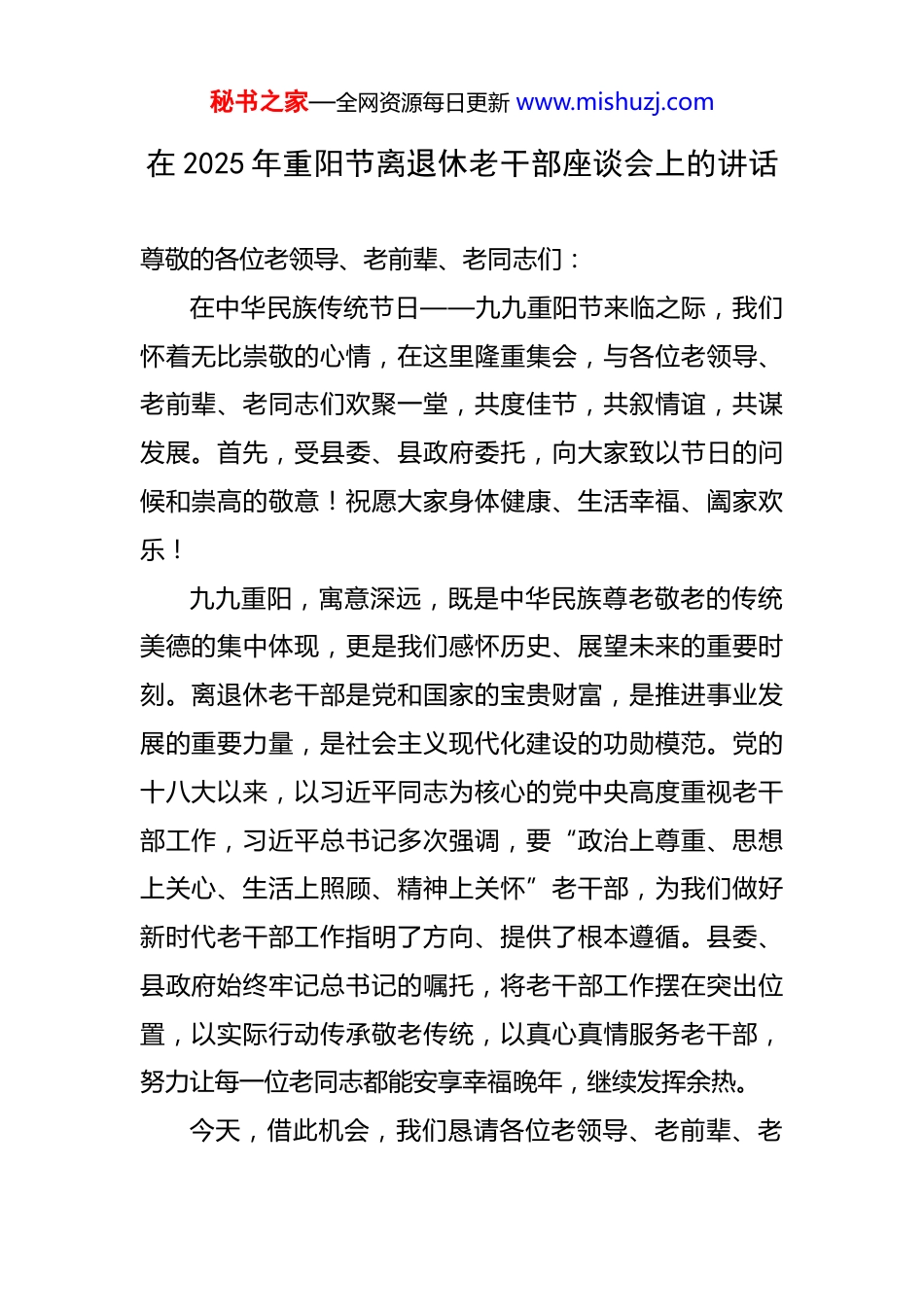 秘书之家—全网资源每日更新 www.mishuzj.com在 2025 年重阳节离退休老干部座谈会上的讲话 尊敬的各位老领导、老前辈、老同志们:在中华民族传统节日——九九重阳节来临之际,我们怀着无比崇敬的心情,在这里隆重集会,与各位老领导、老前辈、老同志们欢聚一堂,共度佳节,共叙情谊,共谋发展。首先,受县委、县政府委托,向大家致以节日的问候和崇高的敬意!祝愿大家身体健康、生活幸福、阖家欢乐!九九重阳,寓意深远,既是中华民族尊老敬老的传统美德的集中体现,更是我们感怀历史、展望未来的重要时刻。离退休老干部是党和国家的宝贵财富,是推进事业发展的重要力量,是社会主义现代化建设的功勋模范。党的十八大以来,以习近平同志为核心的党中央高度重视老干部工作,习近平总书记多次强调,要“政治上尊重、思想上关心、生活上照顾、精神上关怀”老干部,为我们做好新时代老干部工作指明了方向、提供了根本遵循。县委、县政府始终牢记总书记的嘱托,将老干部工作摆在突出位置,以实际行动传承敬老传统,以真心真情服务老干部,努力让每一位老同志都能安享幸福晚年,继续发挥余热。今天,借此机会,我们恳请各位老领导、老前辈、老秘书之家—全网资源每日更新 www.mishuzj.com同志们畅所欲言,为县域经济社会发展和老干部工作建言献策。一、薪火相传、感恩奋进,凝心聚力谱写高质量发展新篇章回顾过往,每一次进步、每一次突破,都离不开老领导、老前辈、老同志们打下的坚实基础和付出的辛勤汗水。你们是县域建设的开拓者、奉献者和见证者,在各自岗位上夙夜在公、殚精竭虑,为全县经济社会发展倾注了大量心血,贡献了卓越智慧和力量。历史不会忘记你们的功绩,全县人民不会忘记你们的贡献。在此,县委、县政府和全县人民向大家表示最衷心的感谢和最崇高的敬意!近年来,在习近平新时代中国特色社会主义思想的科学指引下,在各位老领导、老前辈、老同志们的关心支持下,县委、县政府团结带领全县广大干部群众,攻坚克难,砥砺前行,各项事业取得了长足发展,经济社会发展呈现出蓬勃向上的良好态势。(一)经济发展稳中有进,综合实力持续增强。一是产业结构优化升级。我们坚持把发展经济的着力点放在实体经济上,大力推进传统产业转型升级,积极培育战略性新兴产业,推动数字经济与实体经济深度融合。一批重大项目相继落地,工业经济质量效益同步提升,农秘书之家—全网资源每日更新 www.mishuzj.com业特色产业提质增效,现代服务业活力迸发,为县域经济高质量发展注入了强劲动能。二是城乡面貌焕然一新。我们深入实施乡村振兴战略,持续推进美丽乡村建设,农村人居环境整治成效显著。城市功能品质不断提升,老旧小区改造、基础设施建设、绿化亮化工程等扎实推进,城市品位和宜居水平显著提高,人民群众的获得感、幸福感、安全感持续增强。三是改革开放向纵深推进。我们坚定不移全面深化改革,优化营商环境,激发市场主体活力。招商引资成果丰硕,对外开放水平不断提高,市场化、法治化、国际化营商环境逐步形成,吸引了更多优质企业落户我县。(二)民生福祉持续增进,社会事业全面进步。一是居民收入稳步增长。我们始终坚持以人民为中心的发展思想,着力解决人民群众最关心最直接最现实的利益问题,千方百计增加城乡居民收入,努力让发展成果更多更公平惠及全县人民。二是公共服务优质均衡。教育事业优先发展,医疗卫生服务体系日益健全,文化体育设施不断完善,基本养老、基本医疗、社会救助等社会保障体系更加完善,真正做到了老有所养、老有所医、病有所看、学有所教。三是社会大局保持和谐稳定。我们牢固树立安全发展秘书之家—全网资源每日更新 www.mishuzj.com理念,持续加强社会治理体系和治理能力现代化建设,深入推进平安建设,有效防范化解各类风险隐患,人民群众安居乐业,社会大局持续和谐稳定。这些成绩的取得,是习近平新时代中国特色社会主义思想科学指引的结果,是党中央和上级党委、政府坚强领导的结果,是全县人民团结奋斗的结果,也凝聚着在座各位老领导、老前辈、老同志们的智慧和汗水,是你们为我们打下了坚实基础、提供了宝贵经验。借此机会,...