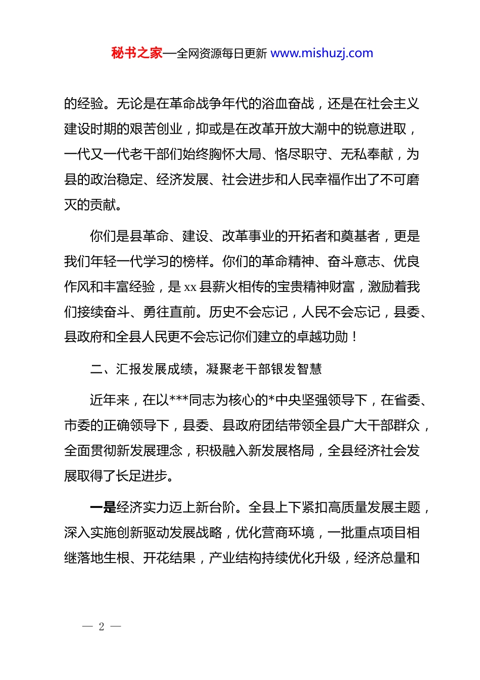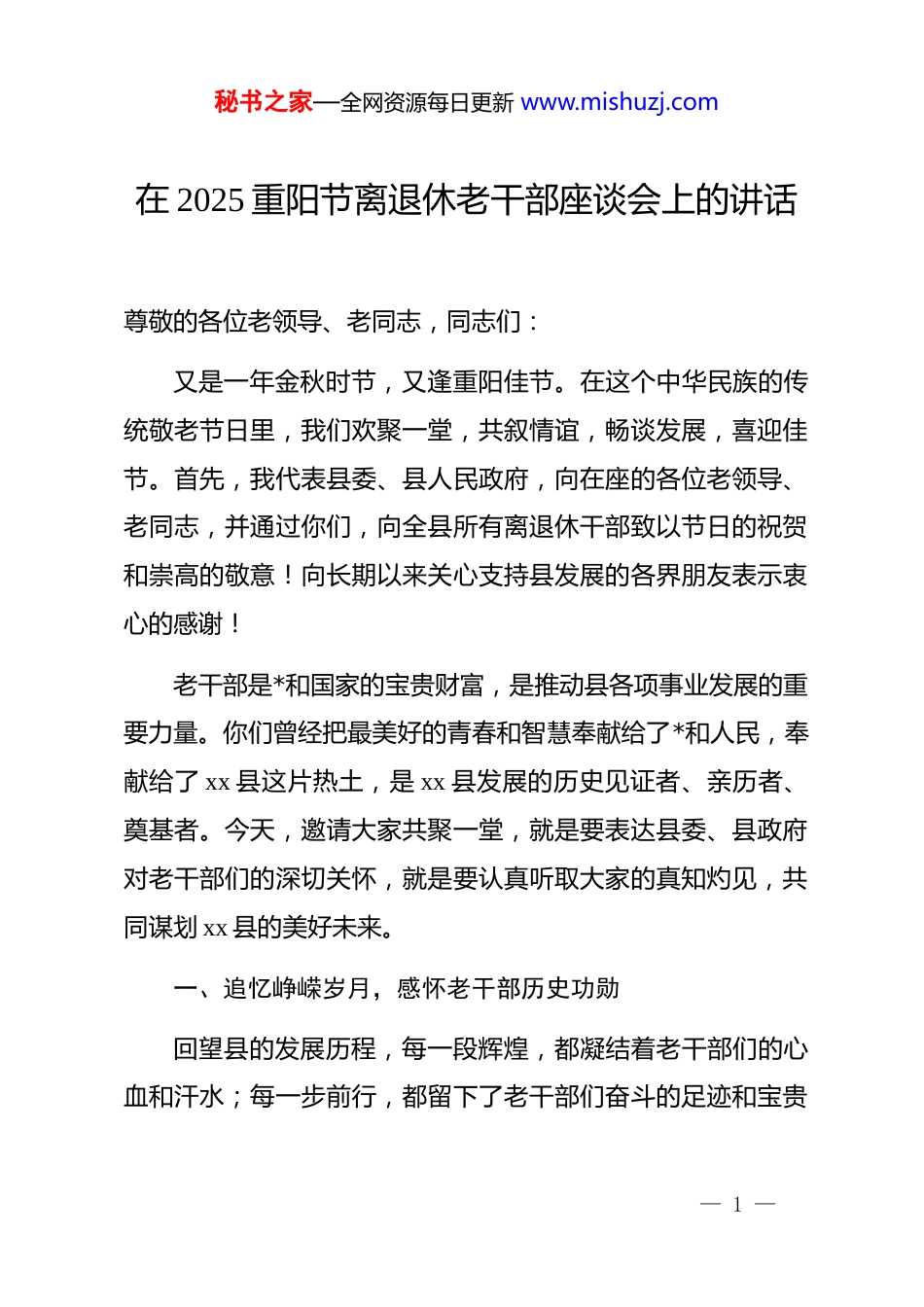 秘书之家—全网资源每日更新 www.mishuzj.com在 2025 重阳节离退休老干部座谈会上的讲话尊敬的各位老领导、老同志,同志们:又是一年金秋时节,又逢重阳佳节。在这个中华民族的传统敬老节日里,我们欢聚一堂,共叙情谊,畅谈发展,喜迎佳节。首先,我代表县委、县人民政府,向在座的各位老领导、老同志,并通过你们,向全县所有离退休干部致以节日的祝贺和崇高的敬意!向长期以来关心支持县发展的各界朋友表示衷心的感谢!老干部是*和国家的宝贵财富,是推动县各项事业发展的重要力量。你们曾经把最美好的青春和智慧奉献给了*和人民,奉献给了 xx 县这片热土,是 xx 县发展的历史见证者、亲历者、奠基者。今天,邀请大家共聚一堂,就是要表达县委、县政府对老干部们的深切关怀,就是要认真听取大家的真知灼见,共同谋划 xx 县的美好未来。一、追忆峥嵘岁月,感怀老干部历史功勋回望县的发展历程,每一段辉煌,都凝结着老干部们的心血和汗水;每一步前行,都留下了老干部们奋斗的足迹和宝贵— 1 —秘书之家—全网资源每日更新 www.mishuzj.com的经验。无论是在革命战争年代的浴血奋战,还是在社会主义建设时期的艰苦创业,抑或是在改革开放大潮中的锐意进取,一代又一代老干部们始终胸怀大局、恪尽职守、无私奉献,为县的政治稳定、经济发展、社会进步和人民幸福作出了不可磨灭的贡献。你们是县革命、建设、改革事业的开拓者和奠基者,更是我们年轻一代学习的榜样。你们的革命精神、奋斗意志、优良作风和丰富经验,是 xx 县薪火相传的宝贵精神财富,激励着我们接续奋斗、勇往直前。历史不会忘记,人民不会忘记,县委、县政府和全县人民更不会忘记你们建立的卓越功勋!二、汇报发展成绩,凝聚老干部银发智慧近年来,在以***同志为核心的*中央坚强领导下,在省委、市委的正确领导下,县委、县政府团结带领全县广大干部群众,全面贯彻新发展理念,积极融入新发展格局,全县经济社会发展取得了长足进步。一是经济实力迈上新台阶。全县上下紧扣高质量发展主题,深入实施创新驱动发展战略,优化营商环境,一批重点项目相继落地生根、开花结果,产业结构持续优化升级,经济总量和— 2 —秘书之家—全网资源每日更新 www.mishuzj.com质量实现双提升,发展韧性持续增强。二是城乡面貌展现新气象。我们坚持以人民为中心的发展思想,着力实施乡村振兴战略,持续推进城乡融合发展,基础设施日益完善,人居环境不断改善,美丽乡村建设亮点纷呈,城市品质不断提升,老百姓的获得感、幸福感、安全感日益增强。三是民生福祉实现新改善。我们始终把人民对美好生活的向往作为奋斗目标,持续加大民生投入,教育医疗服务水平不断提高,社会保障体系更加健全,困难群众得到有效帮扶,文化事业繁荣发展,社会大局和谐稳定。这些成绩的取得,是全县人民共同奋斗的结果,更是老干部们关心支持、倾囊相授、保驾护航的结果。正是有了老干部们打下的坚实基础,有了你们一如既往地关注和鼓励,才有了县今天蓬勃发展的良好局面。三、优化服务保障,营造老干部幸福生活*中央高度重视老干部工作,******多次强调,要满腔热情地做好老干部工作,让老同志们老有所养、老有所医、老有所乐、老有所为。县委、县政府始终牢记***的殷殷嘱托,把老干部工作摆在重要位置,不断健全工作机制,用心用情做好服务保障。— 3 —秘书之家—全网资源每日更新 www.mishuzj.com我们将一如既往地在政治上关心老干部。认真落实离退休干部政治待遇,加强理论学习和思想引导,为老干部阅文、看文件、参加重要会议等提供便利,让老干部们及时了解*中央大政方针和县域发展动态。同时,积极为老干部们搭建发挥作用的平台,鼓励引导有能力、有意愿的老干部们在社区治理、关心下一代、*史宣讲、志愿服务等领域继续发挥光热。我们将一如既往地在生活上照顾老干部。严格落实各项离退休干部政策待遇,确保老干部们在医疗、养老、福利等方面得到应有的保障。持续完善社区居家养老服务体系,加大适老化设施改造力度,提供更为便捷、优质的居家社区养老服务。对身体不便、家庭有特殊困难的老干部,我们将加大走访慰问力度,及时...