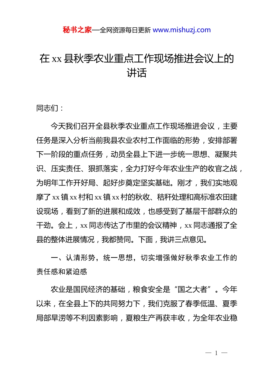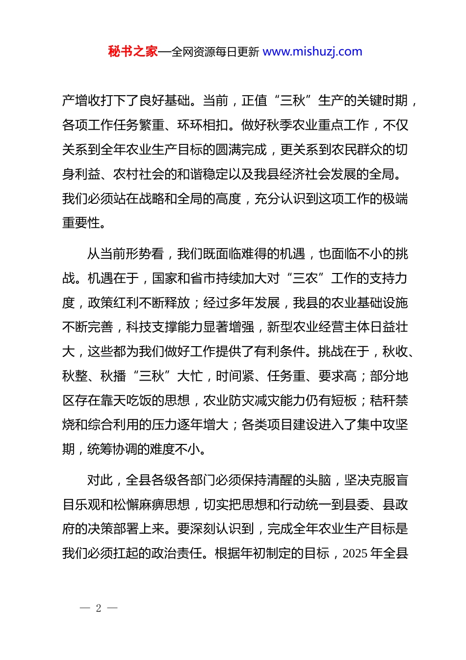 秘书之家—全网资源每日更新 www.mishuzj.com在 xx 县秋季农业重点工作现场推进会议上的讲话同志们:今天我们召开全县秋季农业重点工作现场推进会议,主要任务是深入分析当前我县农业农村工作面临的形势,安排部署下一阶段的重点任务,动员全县上下进一步统一思想、凝聚共识、压实责任、狠抓落实,全力打好今年农业生产的收官之战,为明年工作开好局、起好步奠定坚实基础。刚才,我们实地观摩了 xx 镇 xx 村和 xx 镇 xx 村的秋收、秸秆处理和高标准农田建设现场,看到了新的进展和成效,也感受到了基层干部群众的干劲。会上,xx 同志传达了市里的会议精神,xx 同志通报了全县的整体进展情况,我都赞同。下面,我讲三点意见。一、认清形势,统一思想,切实增强做好秋季农业工作的责任感和紧迫感农业是国民经济的基础,粮食安全是“国之大者”。今年以来,在全县上下的共同努力下,我们克服了春季低温、夏季局部旱涝等不利因素影响,夏粮生产再获丰收,为全年农业稳— 1 —秘书之家—全网资源每日更新 www.mishuzj.com产增收打下了良好基础。当前,正值“三秋”生产的关键时期,各项工作任务繁重、环环相扣。做好秋季农业重点工作,不仅关系到全年农业生产目标的圆满完成,更关系到农民群众的切身利益、农村社会的和谐稳定以及我县经济社会发展的全局。我们必须站在战略和全局的高度,充分认识到这项工作的极端重要性。从当前形势看,我们既面临难得的机遇,也面临不小的挑战。机遇在于,国家和省市持续加大对“三农”工作的支持力度,政策红利不断释放;经过多年发展,我县的农业基础设施不断完善,科技支撑能力显著增强,新型农业经营主体日益壮大,这些都为我们做好工作提供了有利条件。挑战在于,秋收、秋整、秋播“三秋”大忙,时间紧、任务重、要求高;部分地区存在靠天吃饭的思想,农业防灾减灾能力仍有短板;秸秆禁烧和综合利用的压力逐年增大;各类项目建设进入了集中攻坚期,统筹协调的难度不小。对此,全县各级各部门必须保持清醒的头脑,坚决克服盲目乐观和松懈麻痹思想,切实把思想和行动统一到县委、县政府的决策部署上来。要深刻认识到,完成全年农业生产目标是我们必须扛起的政治责任。根据年初制定的目标,2025 年全县— 2 —秘书之家—全网资源每日更新 www.mishuzj.com粮食播种面积要稳定在 80 万亩以上,总产量必须确保达到 21.5万吨以上;油料作物播种面积要力争突破 13.5 万亩;蔬菜年商品总产量要稳定在 60 万吨水平。这些都是硬指标、硬任务,没有任何讨价还价的余地。秋粮占全年粮食产量的绝大部分,秋收的成效直接决定了全年目标的实现。我们必须以“时时放心不下”的责任感,抓紧抓实抓好秋季农业生产各项工作,确保农业基本盘持续稳固。二、聚焦重点,精准发力,高质高效完成秋季农业各项核心任务做好当前和今后一个时期的农业工作,必须突出重点、抓住关键。根据会议安排和当前实际,我重点强调以下几个方面的工作。(一)全力以赴抓好秋收秋整,坚决做到颗粒归仓。秋收是当前农业生产的头等大事。据气象部门预测,未来一段时间天气总体晴好,为秋收创造了有利条件。各乡镇、各部门要抢抓农时,精心组织,科学调度,迅速掀起秋收高潮。一要加快收获进度。要充分发挥农业机械的主力军作用,科学调配全县的收割机、拖拉机等农机具,组织好跨区作业,开展好农机社会化服务,成熟一块、收获一块,确保玉米、大豆、水稻等秋— 3 —秘书之家—全网资源每日更新 www.mishuzj.com粮作物适时收获、颗粒归仓。农业农村部门要加强与气象部门的沟通会商,密切关注天气变化,及时发布预警信息,指导农民科学避灾、合理安排农事活动。二要保障收获质量。要大力推广应用减损收获技术,加强对农机手的培训和指导,规范操作流程,最大限度减少机收损失。同时,要积极做好秋粮烘干、晾晒、仓储等后续服务,防止出现霉变坏粮,切实保障种粮农民的收益。三要同步推进秋整地。秋整地是保证明年春耕顺利进行、提升耕地质量的重要环节。要将秋收与秋整地、秸秆还田紧密结合,做到收一块、整一块、还田一块,提高作业效率。要大力推广深松整地、...