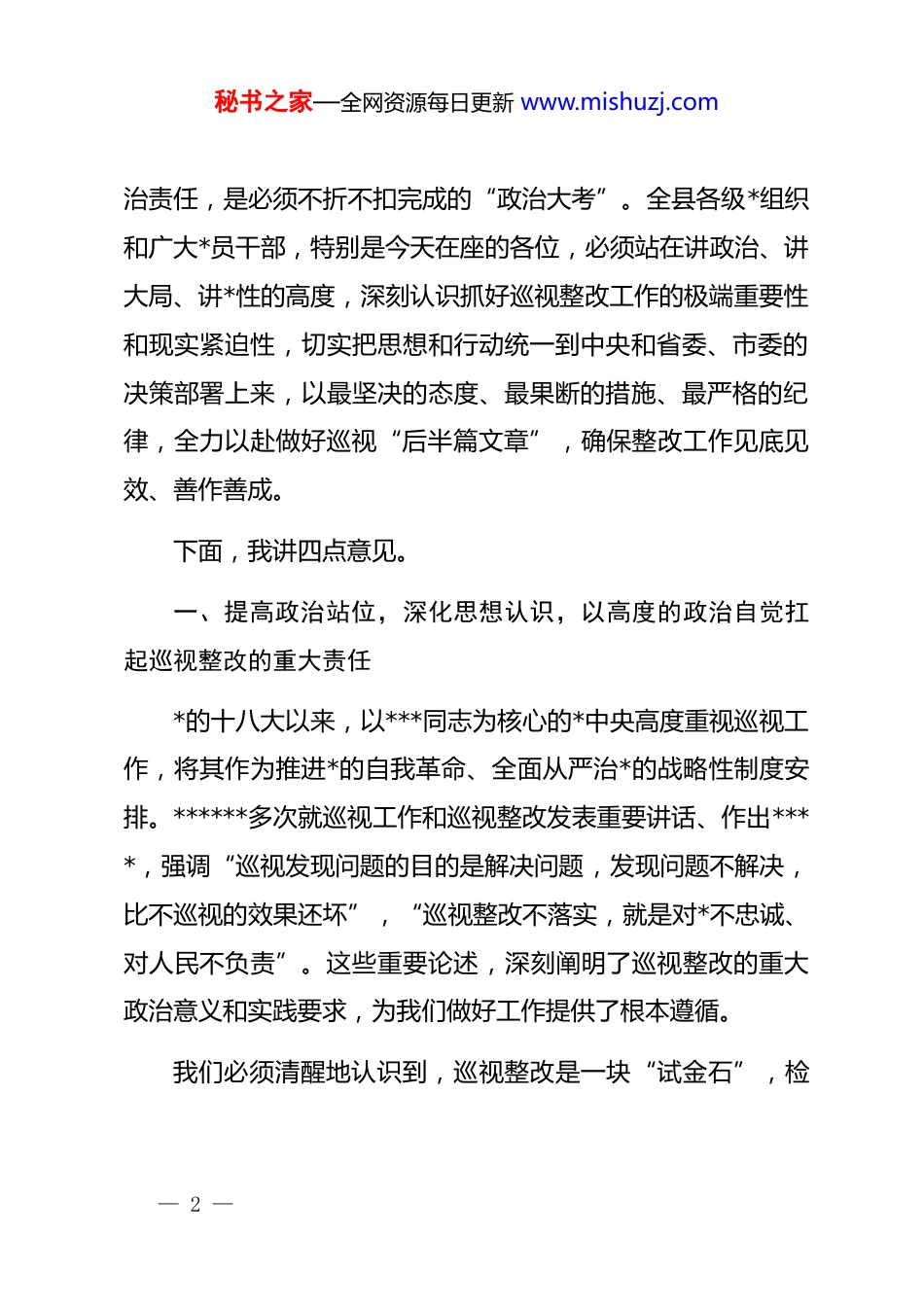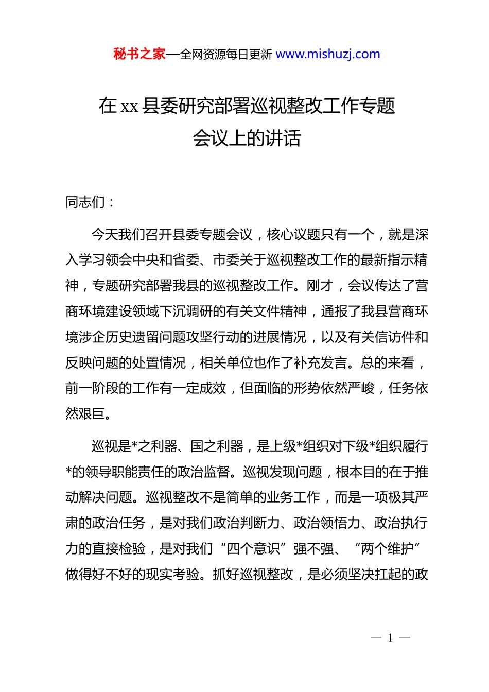 秘书之家—全网资源每日更新 www.mishuzj.com在 xx 县委研究部署巡视整改工作专题会议上的讲话同志们:今天我们召开县委专题会议,核心议题只有一个,就是深入学习领会中央和省委、市委关于巡视整改工作的最新指示精神,专题研究部署我县的巡视整改工作。刚才,会议传达了营商环境建设领域下沉调研的有关文件精神,通报了我县营商环境涉企历史遗留问题攻坚行动的进展情况,以及有关信访件和反映问题的处置情况,相关单位也作了补充发言。总的来看,前一阶段的工作有一定成效,但面临的形势依然严峻,任务依然艰巨。巡视是*之利器、国之利器,是上级*组织对下级*组织履行*的领导职能责任的政治监督。巡视发现问题,根本目的在于推动解决问题。巡视整改不是简单的业务工作,而是一项极其严肃的政治任务,是对我们政治判断力、政治领悟力、政治执行力的直接检验,是对我们“四个意识”强不强、“两个维护”做得好不好的现实考验。抓好巡视整改,是必须坚决扛起的政— 1 —秘书之家—全网资源每日更新 www.mishuzj.com治责任,是必须不折不扣完成的“政治大考”。全县各级*组织和广大*员干部,特别是今天在座的各位,必须站在讲政治、讲大局、讲*性的高度,深刻认识抓好巡视整改工作的极端重要性和现实紧迫性,切实把思想和行动统一到中央和省委、市委的决策部署上来,以最坚决的态度、最果断的措施、最严格的纪律,全力以赴做好巡视“后半篇文章”,确保整改工作见底见效、善作善成。下面,我讲四点意见。一、提高政治站位,深化思想认识,以高度的政治自觉扛起巡视整改的重大责任*的十八大以来,以***同志为核心的*中央高度重视巡视工作,将其作为推进*的自我革命、全面从严治*的战略性制度安排。******多次就巡视工作和巡视整改发表重要讲话、作出****,强调“巡视发现问题的目的是解决问题,发现问题不解决,比不巡视的效果还坏”,“巡视整改不落实,就是对*不忠诚、对人民不负责”。这些重要论述,深刻阐明了巡视整改的重大政治意义和实践要求,为我们做好工作提供了根本遵循。我们必须清醒地认识到,巡视整改是一块“试金石”,检— 2 —秘书之家—全网资源每日更新 www.mishuzj.com验的是我们的政治忠诚。巡视组代表上级*委开展监督,其反馈的意见就是上级*委的要求。能否做到闻过则喜、知错即改,能否做到真认账、真反思、真整改,直接体现着我们对*是否绝对忠诚。在整改问题上,决不能有丝毫的含糊和动摇,决不能搞选择性整改、应付性整改、表面性整改。我们必须把巡视整改作为践行“两个维护”的具体行动,以刀刃向内的勇气和自我革命的精神,全面认领、诚恳接受巡视反馈的每一个问题,确保*中央的政令畅通,确保省委、市委的工作部署在 xx 县落地生根。我们必须清醒地认识到,巡视整改是一场“攻坚战”,检验的是我们的责任担当。巡视反馈的问题,往往是制约本地本单位发展的顽瘴痼疾,是群众反映强烈的急难愁盼,是管*治*中存在的突出短板。这些问题不会自动消失,整改落实也不会一蹴而就。刚才通报的情况显示,我县在营商环境领域,自启动历史遗留问题攻坚行动以来,累计梳理出各类问题 85 个,虽然大部分已经办结,但仍有 20 个“硬骨头”没有啃下来。这些遗留问题,时间跨度长、牵涉部门多、法律关系复杂,解决起来难度很大。这正是考验我们担当精神和斗争本领的时候。全县各级领导干部要发扬斗争精神,敢于动真碰硬,敢于直面矛— 3 —秘书之家—全网资源每日更新 www.mishuzj.com盾,特别是对那些历史遗留问题、深层次矛盾,要主动向前站、责任往上扛,决不能当“甩手掌柜”,更不能搞“击鼓传花”,必须以“逢山开路、遇水架桥”的闯劲和“钉钉子”的精神,一个问题一个问题地解决,一个堡垒一个堡垒地攻克。我们必须清醒地认识到,巡视整改是一次“催化剂”,检验的是我们的发展成效。巡视整改的最终目的,是通过解决问题推动改革、促进发展。巡视反馈的问题,表面上看是具体业务上的偏差,但根子上反映的是我们的发展理念、工作作风和治理能力存在差距。比如,营商环境的问题,实质上是政府职能转变不到位、服务意识不强、工作效能不高的体现。...