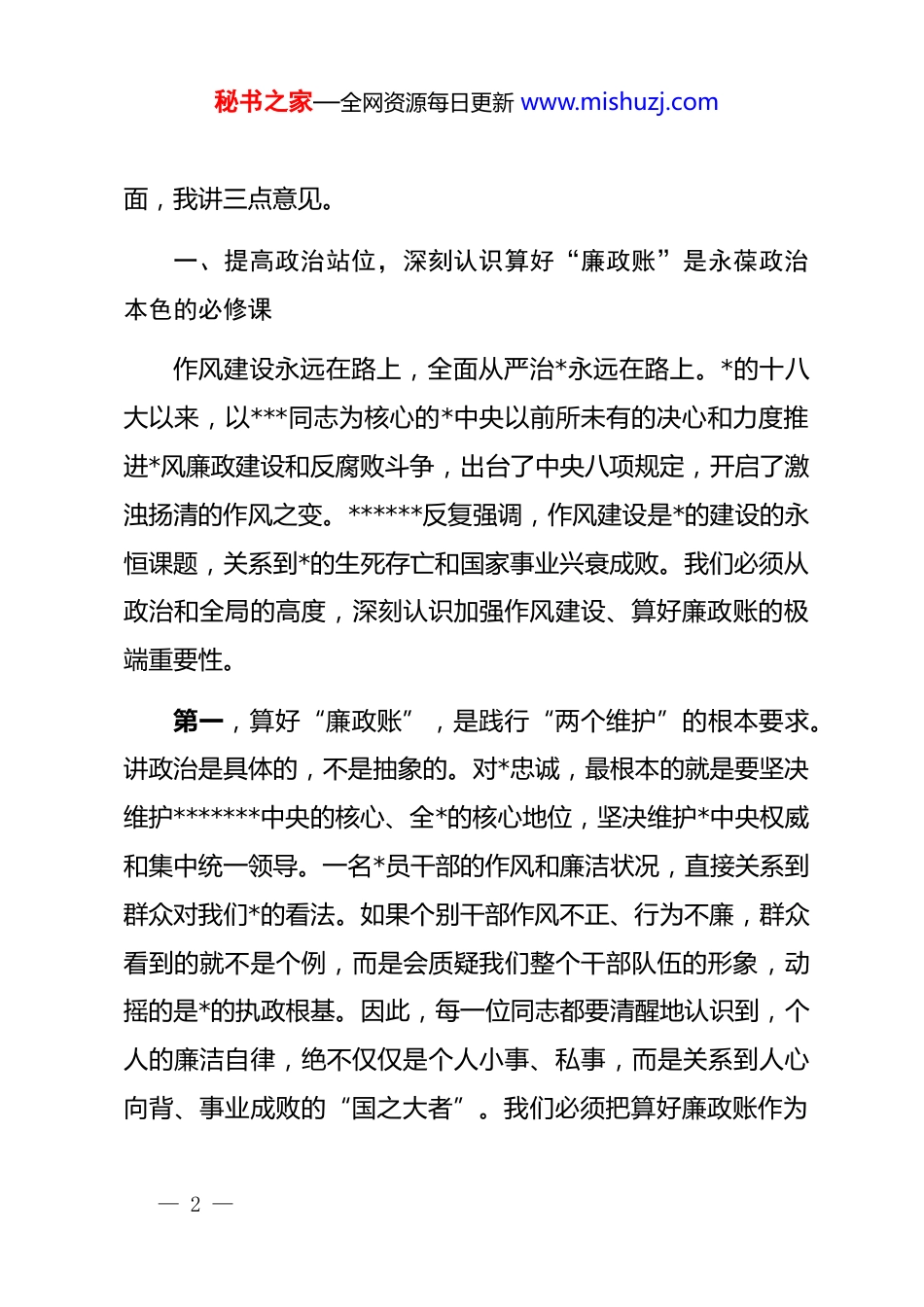 秘书之家—全网资源每日更新 www.mishuzj.com在 xx 镇“算好廉政账”专题教育和作风建设大会上的讲话同志们:今天,我们在这里召开全镇“算好廉政账”专题教育和作风建设大会,主要任务是深入学习贯彻******关于全面从严治*、加强作风建设的重要论述,认真落实中央、省委、市委和区委的最新部署要求,结合我们刚刚观看的警示教育片《纪法红线不可逾越》,引导全镇广大*员干部认真算好廉政账,时刻绷紧纪律弦,以风清气正的政治生态和求真务实的工作作风,为 xx镇高质量发展提供坚强保障。刚才,警示教育片中的一个个案例,一幕幕场景,令人警醒,发人深思。片中人曾经也是意气风发的干部,也曾有理想、有抱负,但最终因为理想信念滑坡、纪律意识淡薄,一步步走向了腐败的深渊,不仅葬送了自己的前程,也给家庭带来了无尽的痛苦,更严重损害了*和政府的形象。这些“片中人”的惨痛教训,就是我们“看片人”的前车之鉴。在中秋、国庆“双节”来临之际,我们召开这次大会,正当其时,十分必要。下— 1 —秘书之家—全网资源每日更新 www.mishuzj.com面,我讲三点意见。一、提高政治站位,深刻认识算好“廉政账”是永葆政治本色的必修课作风建设永远在路上,全面从严治*永远在路上。*的十八大以来,以***同志为核心的*中央以前所未有的决心和力度推进*风廉政建设和反腐败斗争,出台了中央八项规定,开启了激浊扬清的作风之变。******反复强调,作风建设是*的建设的永恒课题,关系到*的生死存亡和国家事业兴衰成败。我们必须从政治和全局的高度,深刻认识加强作风建设、算好廉政账的极端重要性。第一,算好“廉政账”,是践行“两个维护”的根本要求。讲政治是具体的,不是抽象的。对*忠诚,最根本的就是要坚决维护*******中央的核心、全*的核心地位,坚决维护*中央权威和集中统一领导。一名*员干部的作风和廉洁状况,直接关系到群众对我们*的看法。如果个别干部作风不正、行为不廉,群众看到的就不是个例,而是会质疑我们整个干部队伍的形象,动摇的是*的执政根基。因此,每一位同志都要清醒地认识到,个人的廉洁自律,绝不仅仅是个人小事、私事,而是关系到人心向背、事业成败的“国之大者”。我们必须把算好廉政账作为— 2 —秘书之家—全网资源每日更新 www.mishuzj.com检验政治忠诚度、体现政治执行力的试金石,时刻同*中央要求对标对表,确保*的路线方针政策在 xx 镇不折不扣地落地生根。第二,算好“廉-政-账”,是推动高质量发展的坚实保障。当前,xx 镇正处在转型升级、爬坡过坎的关键时期。无论是推进重大项目建设、优化营商环境,还是实施乡村振兴战略、增进民生福祉,都需要一支作风过硬、能打胜仗的干部队伍。实践反复证明,作风优良,则事业兴旺;作风败坏,则一事无成。一个地方的政治生态好不好,直接影响发展环境。如果一个地方吃拿卡要、推诿扯皮、不作为乱作为等歪风邪气盛行,再好的政策、再好的蓝图也无法实现,客商不敢来,人才留不住。我们必须通过算好廉-政-账,持续深化作风建设,着力营造公平公正、清朗清爽的发展环境,把风清气正的政治生态转化为推动 xx 镇高质量发展的强大动力。第三,算好“廉政账”,是关心爱护干部的具体体现。严管就是厚爱,监督就是保护。组织上对大家严格要求,经常开展警示教育,目的不是为了让大家“过不去”,恰恰是为了保护大家“能过去”,能够行得稳、走得远。今天的会议,既是一次警示教育会,也是一次集体谈心谈话会。*委把大家召集起来,观看警示片,通报身边案例,就是希望通过当头棒喝,让— 3 —秘书之家—全网资源每日更新 www.mishuzj.com可能处于“悬崖”边缘的同志及时悬崖勒马,让心存侥幸的同志立即收手收心,让所有同志都能在思想上再上一道“安全锁”。大家要深刻理解组织的良苦用心,把组织的严管和监督,看作是最直接、最有效的关心和爱护,自觉在监督下工作、在阳光下用权,确保职业生涯安全、家庭幸福美满。二、坚持以案为鉴,清醒算好人生“七笔账”,筑牢拒腐防变的思想堤坝人生有许多账本,廉洁从政这本账,是*员干部最重要的一本账。一旦算错了这本账,人生就会“满盘皆输”。希望大...