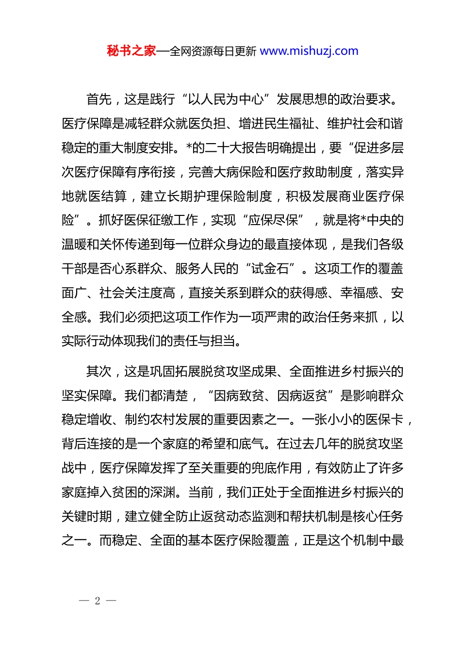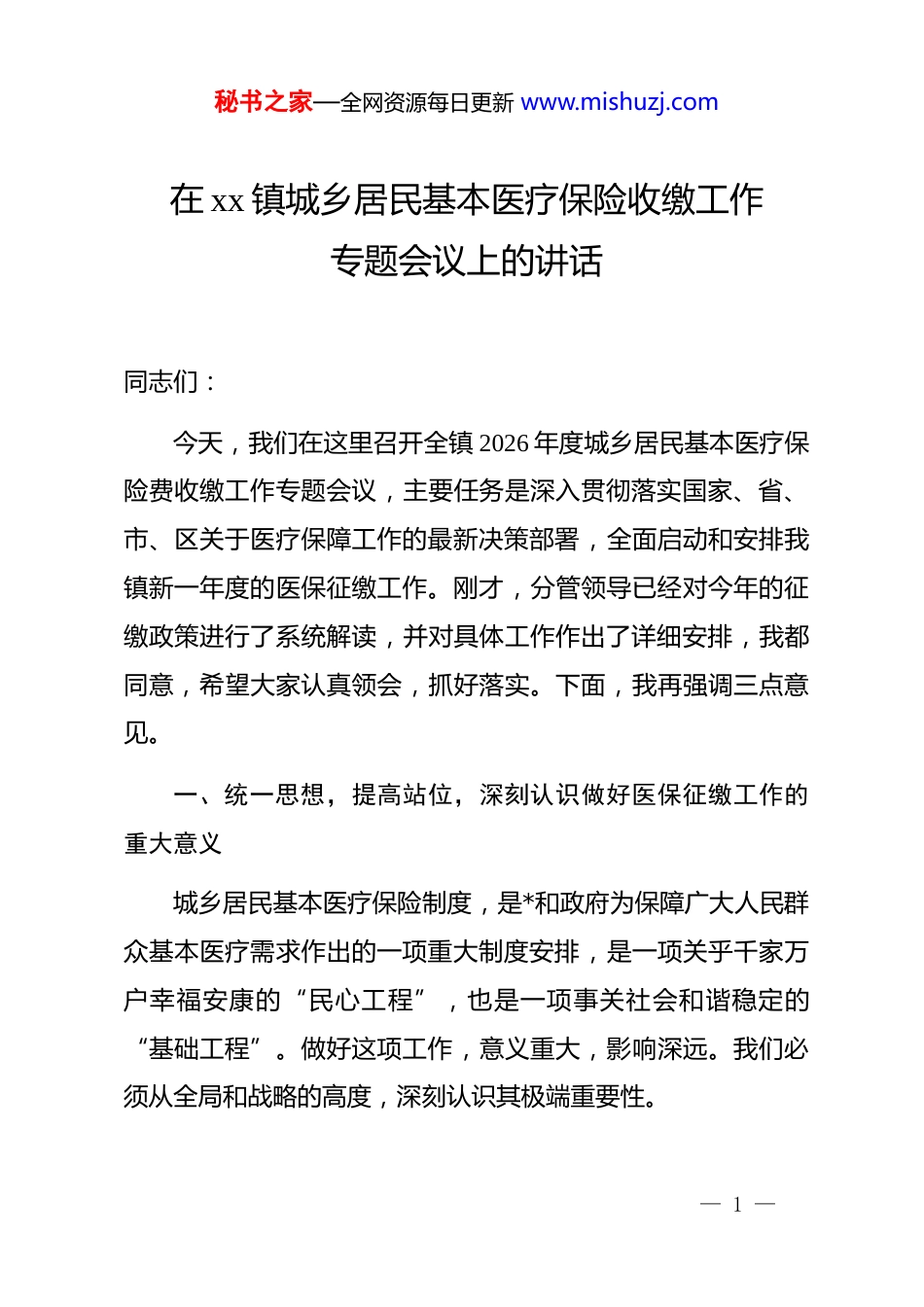 秘书之家—全网资源每日更新 www.mishuzj.com在 xx 镇城乡居民基本医疗保险收缴工作专题会议上的讲话同志们:今天,我们在这里召开全镇 2026 年度城乡居民基本医疗保险费收缴工作专题会议,主要任务是深入贯彻落实国家、省、市、区关于医疗保障工作的最新决策部署,全面启动和安排我镇新一年度的医保征缴工作。刚才,分管领导已经对今年的征缴政策进行了系统解读,并对具体工作作出了详细安排,我都同意,希望大家认真领会,抓好落实。下面,我再强调三点意见。一、统一思想,提高站位,深刻认识做好医保征缴工作的重大意义城乡居民基本医疗保险制度,是*和政府为保障广大人民群众基本医疗需求作出的一项重大制度安排,是一项关乎千家万户幸福安康的“民心工程”,也是一项事关社会和谐稳定的“基础工程”。做好这项工作,意义重大,影响深远。我们必须从全局和战略的高度,深刻认识其极端重要性。— 1 —秘书之家—全网资源每日更新 www.mishuzj.com首先,这是践行“以人民为中心”发展思想的政治要求。医疗保障是减轻群众就医负担、增进民生福祉、维护社会和谐稳定的重大制度安排。*的二十大报告明确提出,要“促进多层次医疗保障有序衔接,完善大病保险和医疗救助制度,落实异地就医结算,建立长期护理保险制度,积极发展商业医疗保险”。抓好医保征缴工作,实现“应保尽保”,就是将*中央的温暖和关怀传递到每一位群众身边的最直接体现,是我们各级干部是否心系群众、服务人民的“试金石”。这项工作的覆盖面广、社会关注度高,直接关系到群众的获得感、幸福感、安全感。我们必须把这项工作作为一项严肃的政治任务来抓,以实际行动体现我们的责任与担当。其次,这是巩固拓展脱贫攻坚成果、全面推进乡村振兴的坚实保障。我们都清楚,“因病致贫、因病返贫”是影响群众稳定增收、制约农村发展的重要因素之一。一张小小的医保卡,背后连接的是一个家庭的希望和底气。在过去几年的脱贫攻坚战中,医疗保障发挥了至关重要的兜底作用,有效防止了许多家庭掉入贫困的深渊。当前,我们正处于全面推进乡村振兴的关键时期,建立健全防止返贫动态监测和帮扶机制是核心任务之一。而稳定、全面的基本医疗保险覆盖,正是这个机制中最— 2 —秘书之家—全网资源每日更新 www.mishuzj.com关键、最有效的一道防线。如果我们的群众因为没有参保,一场大病就可能让一个家庭数年的奋斗成果化为乌有。因此,做好医保征缴工作,确保每一位村民,特别是低收入人口、易返贫致贫人口 100%参保,就是为乡村振兴战略筑起一道坚实的“健康长城”。最后,这是应对公共卫生风险、维护社会大局稳定的现实需要。近年来,各类突发公共卫生事件给我们的社会治理能力带来了巨大考验。实践证明,一个覆盖全民、保障有力的医疗保障体系,是社会抵御重大风险的“稳定器”。当群众手中有医保,心中就不慌,面对疾病时有信心、有依靠,整个社会才能保持安定有序。特别是对于农村地区,医疗资源相对薄弱,群众抵御疾病风险的能力更弱。只有通过全民参保,汇聚全社会的力量,形成强大的风险共担机制,才能有效化解个体家庭难以承受的医疗费用压力,维护社会公平,促进社会和谐。因此,我们绝不能将医保征缴看作是简单的收费任务,而要将其视为一项构建社会风险共同体、提升基层治理水平的基础性工作来抓。二、明确政策,精准施策,准确把握今年征缴工作的核心要求— 3 —秘书之家—全网资源每日更新 www.mishuzj.com今年的征缴工作,政策上有一些新的调整和优化,工作要求也更加具体。我们必须准确理解、全面把握,确保政策宣传不走样、工作执行不偏差。第一,要准确把握“一个核心标准”。根据上级部门的统一部署,2026 年度我镇城乡居民基本医疗保险的个人缴费标准确定为每人每年 400 元。在宣传和解释这项政策时,我们不能简单地只告诉群众要交 400 元,而要学会“算大账、算明账、算长远账”。要清晰地向群众说明,这 400 元背后,是国家财政不低于 700 元的人均补助。也就是说,每位参保群众实际上享受的是超过 1100 元的医疗保障资金支持。这是国家给予人民群众实实在在的健康投资和民生红...
