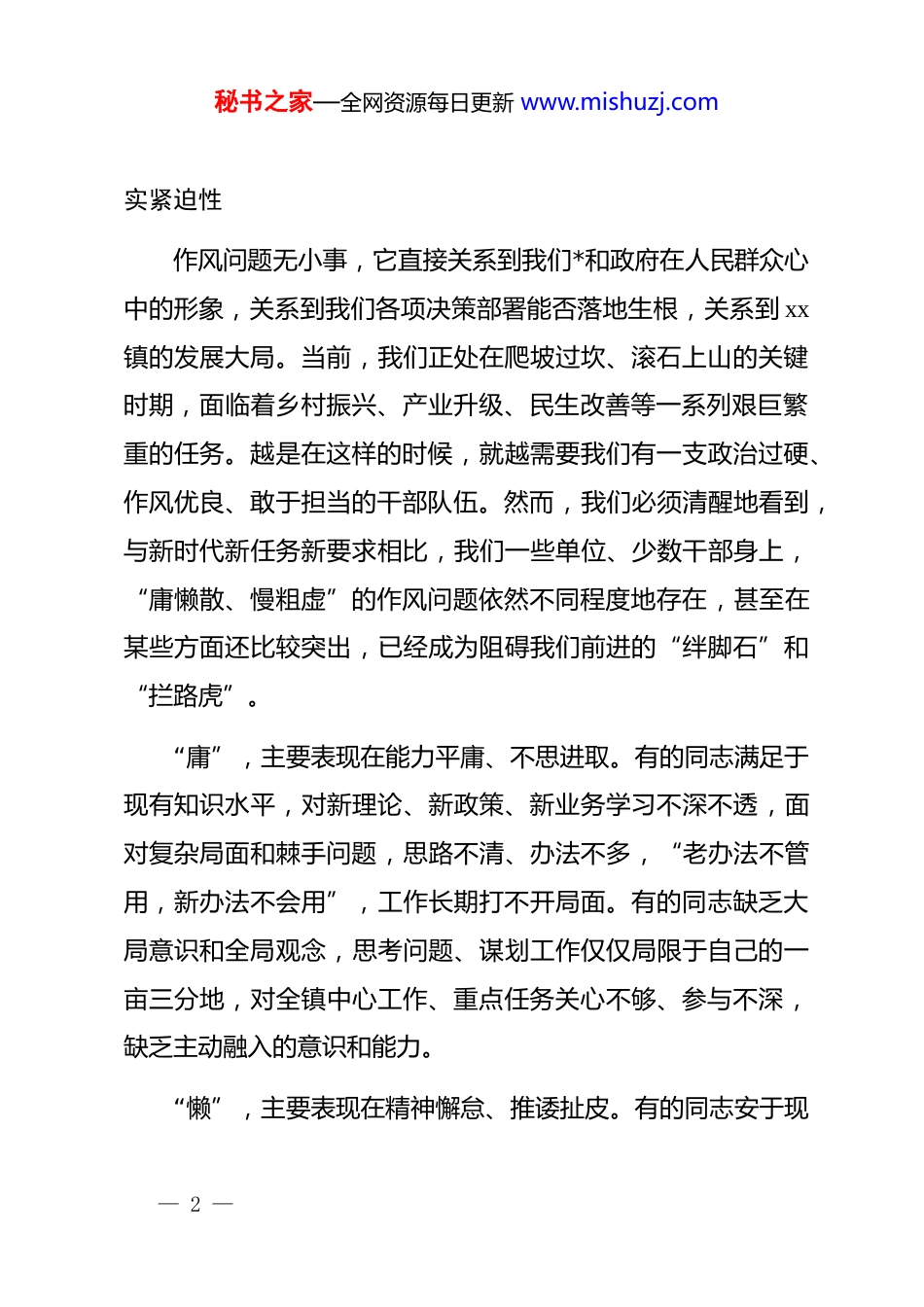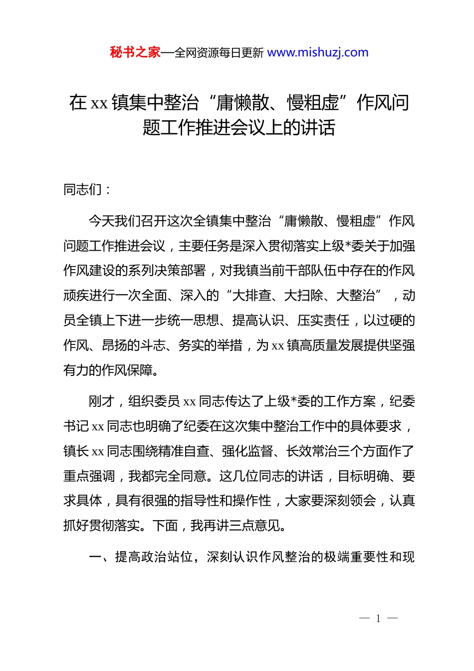 秘书之家—全网资源每日更新 www.mishuzj.com在 xx 镇集中整治“庸懒散、慢粗虚”作风问题工作推进会议上的讲话同志们:今天我们召开这次全镇集中整治“庸懒散、慢粗虚”作风问题工作推进会议,主要任务是深入贯彻落实上级*委关于加强作风建设的系列决策部署,对我镇当前干部队伍中存在的作风顽疾进行一次全面、深入的“大排查、大扫除、大整治”,动员全镇上下进一步统一思想、提高认识、压实责任,以过硬的作风、昂扬的斗志、务实的举措,为 xx 镇高质量发展提供坚强有力的作风保障。刚才,组织委员 xx 同志传达了上级*委的工作方案,纪委书记 xx 同志也明确了纪委在这次集中整治工作中的具体要求,镇长 xx 同志围绕精准自查、强化监督、长效常治三个方面作了重点强调,我都完全同意。这几位同志的讲话,目标明确、要求具体,具有很强的指导性和操作性,大家要深刻领会,认真抓好贯彻落实。下面,我再讲三点意见。一、提高政治站位,深刻认识作风整治的极端重要性和现— 1 —秘书之家—全网资源每日更新 www.mishuzj.com实紧迫性作风问题无小事,它直接关系到我们*和政府在人民群众心中的形象,关系到我们各项决策部署能否落地生根,关系到 xx镇的发展大局。当前,我们正处在爬坡过坎、滚石上山的关键时期,面临着乡村振兴、产业升级、民生改善等一系列艰巨繁重的任务。越是在这样的时候,就越需要我们有一支政治过硬、作风优良、敢于担当的干部队伍。然而,我们必须清醒地看到,与新时代新任务新要求相比,我们一些单位、少数干部身上,“庸懒散、慢粗虚”的作风问题依然不同程度地存在,甚至在某些方面还比较突出,已经成为阻碍我们前进的“绊脚石”和“拦路虎”。“庸”,主要表现在能力平庸、不思进取。有的同志满足于现有知识水平,对新理论、新政策、新业务学习不深不透,面对复杂局面和棘手问题,思路不清、办法不多,“老办法不管用,新办法不会用”,工作长期打不开局面。有的同志缺乏大局意识和全局观念,思考问题、谋划工作仅仅局限于自己的一亩三分地,对全镇中心工作、重点任务关心不够、参与不深,缺乏主动融入的意识和能力。“懒”,主要表现在精神懈怠、推诿扯皮。有的同志安于现— 2 —秘书之家—全网资源每日更新 www.mishuzj.com状,“躺平”思想严重,工作拈轻怕重,任务来了就推,责任面前就躲,信奉“多做多错、少做少错、不做不错”的处世哲学。有的同志工作热情消退,满足于“当一天和尚撞一天钟”,出工不出力,在位不尽责,群众找上门来,也是能拖就拖、能敷衍就敷衍。“散”,主要表现在纪律松散、我行我素。有的同志组织纪律观念淡薄,迟到早退、随意脱岗现象时有发生;有的同志在工作中自由散漫,不按程序办事、不按规矩办事,甚至搞“上有政策、下有对策”;有的同志大局意识差,部门之间协作不力,相互掣肘,形不成工作合力。“慢”,主要表表示在效率低下、办事拖拉。有的同志习惯于慢节奏,对上级部署的工作、群众反映的问题,反应迟缓,行动拖沓,今天能办的事拖到明天,一个简单的问题反复研究,错失解决问题的最佳时机。有的同志服务意识不强,门好进、脸好看,但就是事难办,让群众和企业来回跑路,严重影响了我们的营商环境和政府公信力。“粗”,主要表现在作风粗糙、标准不高。有的同志工作满足于“差不多”,满足于一般化,满足于不出事,标准不高,要求不严。文件起草、数据报送,粗枝大叶、错漏百出;项目— 3 —秘书之家—全网资源每日更新 www.mishuzj.com推进、工作落实,只求过得去,不求过得硬,缺乏精益求精的“工匠精神”。“虚”,主要表现在工作漂浮、弄虚作假。有的同志习惯于做表面文章,工作汇报、总结材料写得天花乱坠,但实际效果却乏善可陈。有的同志热衷于“以会议落实会议、以文件落实文件”,调查研究走马观花,不深入基层、不了解实情,决策部署脱离实际。更有甚者,为了应付检查,搞“盆景式”典型,数据造假,欺上瞒下。同志们,以上这些问题,虽然只存在于少数干部身上,但其危害是巨大的,影响是恶劣的。它像病毒一样侵蚀着我们干部队伍的肌体,败坏着我们的政治生态,损害着我们与人民...