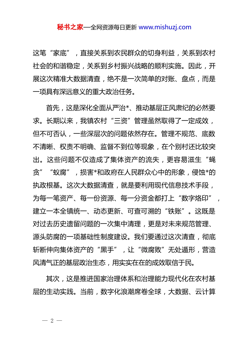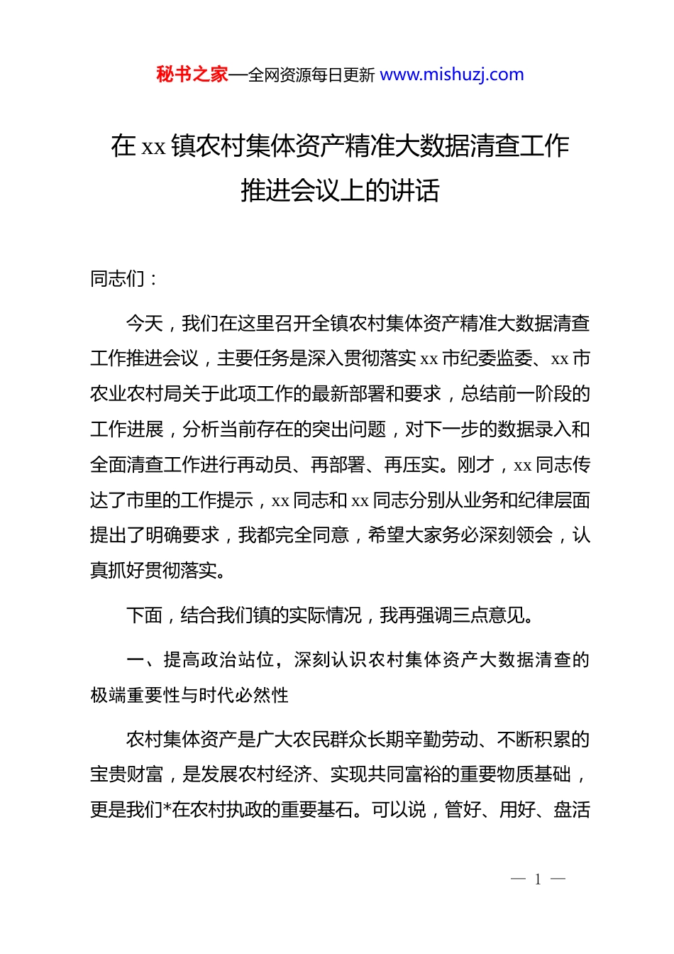 秘书之家—全网资源每日更新 www.mishuzj.com在 xx 镇农村集体资产精准大数据清查工作推进会议上的讲话同志们:今天,我们在这里召开全镇农村集体资产精准大数据清查工作推进会议,主要任务是深入贯彻落实 xx 市纪委监委、xx 市农业农村局关于此项工作的最新部署和要求,总结前一阶段的工作进展,分析当前存在的突出问题,对下一步的数据录入和全面清查工作进行再动员、再部署、再压实。刚才,xx 同志传达了市里的工作提示,xx 同志和 xx 同志分别从业务和纪律层面提出了明确要求,我都完全同意,希望大家务必深刻领会,认真抓好贯彻落实。下面,结合我们镇的实际情况,我再强调三点意见。一、提高政治站位,深刻认识农村集体资产大数据清查的极端重要性与时代必然性农村集体资产是广大农民群众长期辛勤劳动、不断积累的宝贵财富,是发展农村经济、实现共同富裕的重要物质基础,更是我们*在农村执政的重要基石。可以说,管好、用好、盘活— 1 —秘书之家—全网资源每日更新 www.mishuzj.com这笔“家底”,直接关系到农民群众的切身利益,关系到农村社会的和谐稳定,关系到乡村振兴战略的顺利实施。因此,开展这次精准大数据清查,绝不是一次简单的对账、盘点,而是一项具有深远意义的重大政治任务。首先,这是深化全面从严治*、推动基层正风肃纪的必然要求。长期以来,我镇农村“三资”管理虽然取得了一定成效,但不可否认,一些深层次的问题依然存在。管理不规范、底数不清晰、权责不明确、监督不到位等现象,在个别村还比较突出。这些问题不仅造成了集体资产的流失,更容易滋生“蝇贪”“蚁腐”,损害*和政府在人民群众心中的形象,侵蚀*的执政根基。这次大数据清查,就是要利用现代信息技术手段,为每一笔资产、每一份资源、每一分资金都打上“数字烙印”,建立一本全镇统一、动态更新、可查可溯的“铁账”。这既是对过去历史遗留问题的一次集中清理,更是对未来规范管理、源头防腐的一项基础性制度建设。我们要通过这次清查,彻底斩断伸向集体资产的“黑手”,让“微腐败”无处遁形,营造风清气正的基层政治生态,用实实在在的成效取信于民。其次,这是推进国家治理体系和治理能力现代化在农村基层的生动实践。当前,数字化浪潮席卷全球,大数据、云计算— 2 —秘书之家—全网资源每日更新 www.mishuzj.com等信息技术正在深刻改变着社会治理的模式。将大数据技术应用于农村集体资产管理,是顺应时代发展的潮流,是提升乡村治理效能的“金钥匙”。通过构建精准、高效、智能的监管平台,我们可以实现对集体资产从形成、运营到处置的全生命周期动态监管。这不仅能大幅提高管理效率,更能为上级决策提供精准的数据支撑,为我镇的产业发展规划、资源优化配置、民生项目布局提供科学依据。这本质上是一场深刻的治理革命,是从传统“人管人、人管物”的模式,向“数据管人、数据管物”的现代治理模式的转型升级。我们必须紧跟时代步伐,主动拥抱变革,把这项工作作为提升我镇基层治理水平的突破口来抓。最后,这是保障农民合法权益、夯实乡村振兴根基的固本之举。乡村振兴,产业兴旺是重点,农民富裕是根本。集体资产的保值增值,是发展壮大村级集体经济、带动农民增收致富的“源头活水”。家底不清,发展就无从谈起;资产不明,权益就无法保障。只有把集体资产的每一分钱都查清楚、管明白,才能让广大农民群众真正成为集体资产的知情者、参与者、监督者和受益者。这次清查,就是要明晰产权归属,摸清资产存量、结构和效益,为下一步深化农村集体产权制度改革、盘活— 3 —秘书之家—全网资源每日更新 www.mishuzj.com闲置资源、发展新型集体经济奠定坚实基础。这本账,不仅是经济账,更是民心账。账算清了,群众的心就顺了,干事创业的劲头就足了,我们推进乡村振兴的底气也就更足了。全镇各级干部,特别是各村的*组织书记,必须从这个高度来认识和把握这次清查工作。要彻底摒弃“无所谓”“走过场”“怕麻烦”等错误思想,切实增强责任感、使命感和紧迫感,把思想和行动统一到市委、市政府和镇*委的决策部署上来,以对*、对人民、对历史高度负责的态度,把这项利...