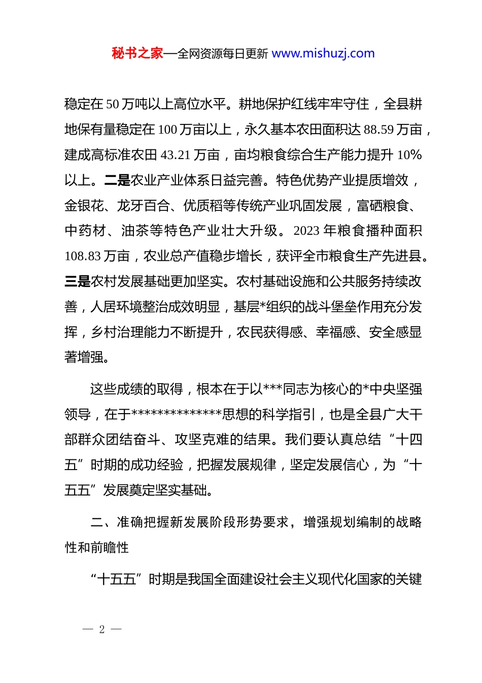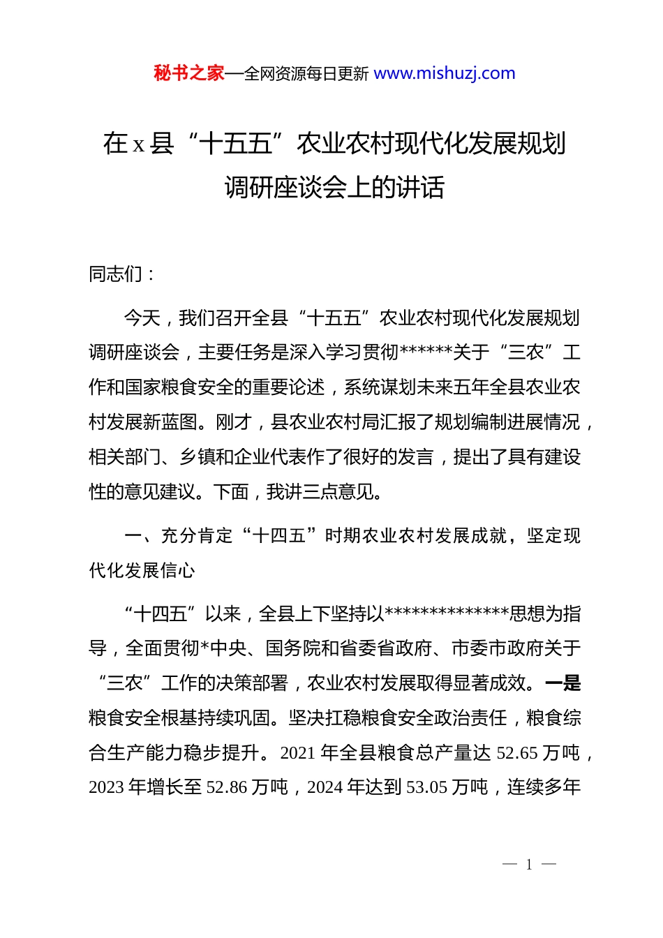 秘书之家—全网资源每日更新 www.mishuzj.com在 x 县“十五五”农业农村现代化发展规划调研座谈会上的讲话同志们:今天,我们召开全县“十五五”农业农村现代化发展规划调研座谈会,主要任务是深入学习贯彻******关于“三农”工作和国家粮食安全的重要论述,系统谋划未来五年全县农业农村发展新蓝图。刚才,县农业农村局汇报了规划编制进展情况,相关部门、乡镇和企业代表作了很好的发言,提出了具有建设性的意见建议。下面,我讲三点意见。一、充分肯定“十四五”时期农业农村发展成就,坚定现代化发展信心“十四五”以来,全县上下坚持以**************思想为指导,全面贯彻*中央、国务院和省委省政府、市委市政府关于“三农”工作的决策部署,农业农村发展取得显著成效。一是粮食安全根基持续巩固。坚决扛稳粮食安全政治责任,粮食综合生产能力稳步提升。2021 年全县粮食总产量达 52.65 万吨,2023 年增长至 52.86 万吨,2024 年达到 53.05 万吨,连续多年— 1 —秘书之家—全网资源每日更新 www.mishuzj.com稳定在 50 万吨以上高位水平。耕地保护红线牢牢守住,全县耕地保有量稳定在 100 万亩以上,永久基本农田面积达 88.59 万亩,建成高标准农田 43.21 万亩,亩均粮食综合生产能力提升 10%以上。二是农业产业体系日益完善。特色优势产业提质增效,金银花、龙牙百合、优质稻等传统产业巩固发展,富硒粮食、中药材、油茶等特色产业壮大升级。 2023 年粮食播种面积108.83 万亩,农业总产值稳步增长,获评全市粮食生产先进县。三是农村发展基础更加坚实。农村基础设施和公共服务持续改善,人居环境整治成效明显,基层*组织的战斗堡垒作用充分发挥,乡村治理能力不断提升,农民获得感、幸福感、安全感显著增强。这些成绩的取得,根本在于以***同志为核心的*中央坚强领导,在于**************思想的科学指引,也是全县广大干部群众团结奋斗、攻坚克难的结果。我们要认真总结“十四五”时期的成功经验,把握发展规律,坚定发展信心,为“十五五”发展奠定坚实基础。二、准确把握新发展阶段形势要求,增强规划编制的战略性和前瞻性“十五五”时期是我国全面建设社会主义现代化国家的关键— 2 —秘书之家—全网资源每日更新 www.mishuzj.com时期,也是我县加快推进农业农村现代化的重要机遇期。我们要立足新发展阶段,贯彻新发展理念,构建新发展格局,深刻认识农业农村发展面临的新形势新要求。从战略全局看,国家高度重视农业农村发展。******强调,民族要复兴,乡村必振兴。*中央坚持把解决好“三农”问题作为全*工作重中之重,持续加大强农惠农富农政策力度,为我们推进农业农村现代化提供了根本遵循和强大动力。国家实施粮食安全战略、乡村振兴战略,出台一系列支持政策措施,为农业农村发展创造了有利条件。从区域发展看,我省我市对农业农村工作提出新要求。省委省政府明确要求坚决扛稳粮食安全重任,落实粮食安全*政同责,稳定发展粮食生产,巩固提升传统双季稻产区产能。市委市政府部署推进农业产业兴旺,构建农村创业服务体系和农村电商服务体系,发展智慧农业,实施数字农业项目,为我县农业农村发展指明了方向。从自身发展看,我县农业农村既具备良好基础,也面临挑战。一方面,我县是国家商品粮基地县,农业资源丰富,产业特色鲜明,发展潜力巨大。另一方面,农业基础设施仍需加强,产业链条有待延伸,品牌影响力需要提升,农民持续增收机制— 3 —秘书之家—全网资源每日更新 www.mishuzj.com尚需完善。面对新形势新任务,我们要增强机遇意识和风险意识,准确识变、科学应变、主动求变,在危机中育先机、于变局中开新局。三、聚焦重点任务,高质量编制“十五五”农业农村现代化发展规划做好“十五五”规划编制工作,要坚持以**************思想为指导,全面贯彻*的二十大和二十届二中、三中全会精神,落实中央和省市委部署要求,紧密结合 xx 实际,科学确定发展目标、重点任务和重大举措。一要坚决保障粮食和重要农产品供给安全。始终绷紧粮食安全这根弦,落实藏粮于地、藏粮于技战略。严守耕地保护红线,坚决遏制耕地“非农化”、...