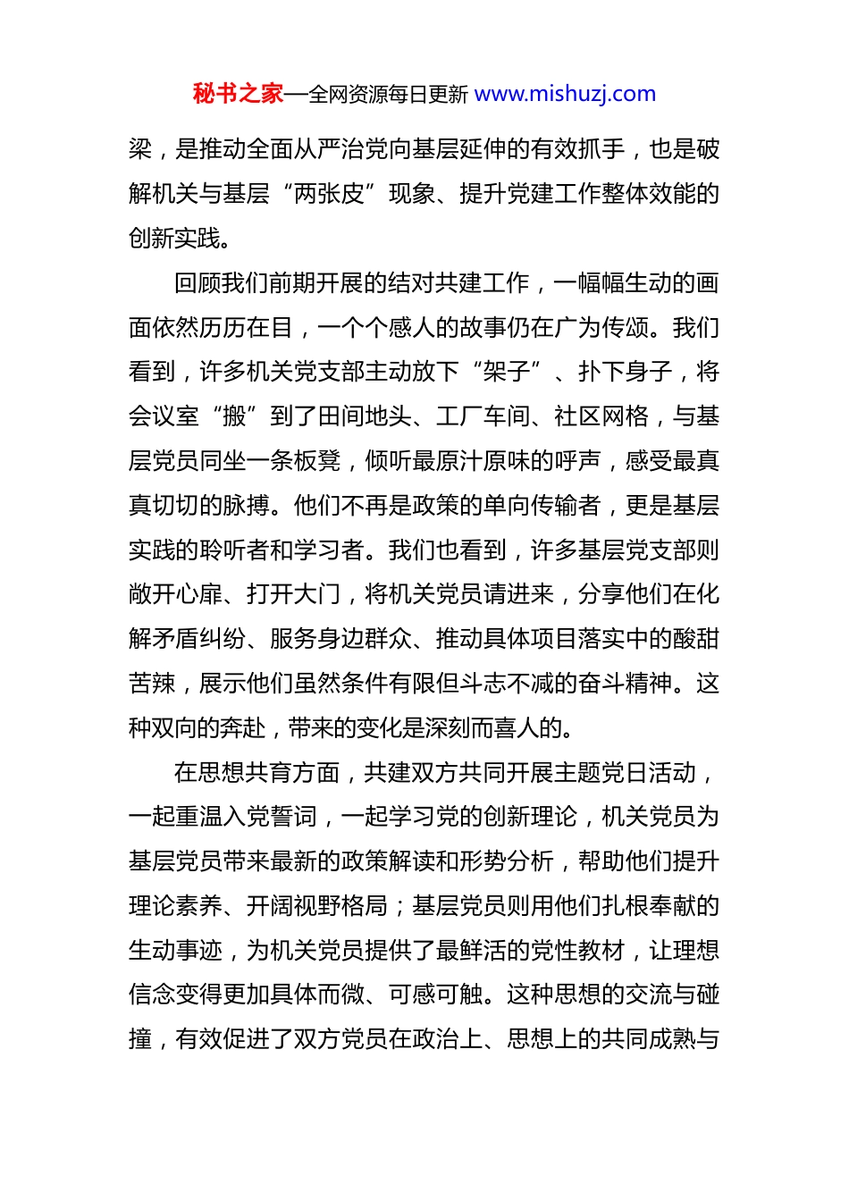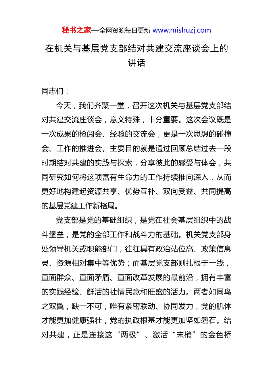 秘书之家—全网资源每日更新 www.mishuzj.com在机关与基层党支部结对共建交流座谈会上的讲话 同志们:今天,我们齐聚一堂,召开这次机关与基层党支部结对共建交流座谈会,意义特殊,十分重要。这次会议既是一次成果的检阅会、经验的交流会,更是一次思想的碰撞会、工作的推进会。主要目的就是通过回顾总结过去一段时期结对共建的实践与探索,分享彼此的感受与体会,共同研究如何将这项富有生命力的工作持续推向深入,从而更好地构建起资源共享、优势互补、双向受益、共同提高的基层党建工作新格局。党支部是党的基础组织,是党在社会基层组织中的战斗堡垒,是党的全部工作和战斗力的基础。机关党支部身处领导机关或职能部门,往往具有政治站位高、政策信息灵、资源相对集中等优势;而基层党支部则扎根于一线,直面群众、直面矛盾、直面改革发展的最前沿,拥有丰富的实践经验、鲜活的社情民意和旺盛的活力。两者如同鸟之双翼,缺一不可,唯有紧密联动、协同发力,党的肌体才能更加健康强壮,党的执政根基才能更加坚如磐石。结对共建,正是连接这“两极”、激活“末梢”的金色桥秘书之家—全网资源每日更新 www.mishuzj.com梁,是推动全面从严治党向基层延伸的有效抓手,也是破解机关与基层“两张皮”现象、提升党建工作整体效能的创新实践。回顾我们前期开展的结对共建工作,一幅幅生动的画面依然历历在目,一个个感人的故事仍在广为传颂。我们看到,许多机关党支部主动放下“架子”、扑下身子,将会议室“搬”到了田间地头、工厂车间、社区网格,与基层党员同坐一条板凳,倾听最原汁原味的呼声,感受最真真切切的脉搏。他们不再是政策的单向传输者,更是基层实践的聆听者和学习者。我们也看到,许多基层党支部则敞开心扉、打开大门,将机关党员请进来,分享他们在化解矛盾纠纷、服务身边群众、推动具体项目落实中的酸甜苦辣,展示他们虽然条件有限但斗志不减的奋斗精神。这种双向的奔赴,带来的变化是深刻而喜人的。在思想共育方面,共建双方共同开展主题党日活动,一起重温入党誓词,一起学习党的创新理论,机关党员为基层党员带来最新的政策解读和形势分析,帮助他们提升理论素养、开阔视野格局;基层党员则用他们扎根奉献的生动事迹,为机关党员提供了最鲜活的党性教材,让理想信念变得更加具体而微、可感可触。这种思想的交流与碰撞,有效促进了双方党员在政治上、思想上的共同成熟与秘书之家—全网资源每日更新 www.mishuzj.com进步。在资源共享方面,机关党支部发挥其信息、政策、人才等方面的优势,为基层党支部送去了他们亟需的培训资源、专业指导,甚至在项目引进、技术帮扶、基础设施建设等方面提供了有力的支持,实实在在地帮助基层解决了一些长期想解决而未能解决的难题。而基层党支部则以其广阔的实践舞台,为机关党员干部提供了深入了解国情、体察民意的宝贵机会,成为了机关干部转变作风、增长才干的“练兵场”和“实验田”。许多年轻机关干部反映,正是在基层的摸爬滚打中,才真正理解了“纸上得来终觉浅,绝知此事要躬行”的深刻含义。在组织共建方面,通过联合开展“三会一课”、共同过组织生活、互派党员参与对方活动等形式,打破了组织壁垒,激发了组织活力。机关党支部规范、严谨的工作流程,对提升基层支部组织生活的标准化、规范化水平起到了良好的示范作用;而基层党支部灵活、务实、充满创造力的工作方法,也为改进机关工作作风、提升服务效能提供了有益的借鉴。双方在相互学习、相互促进中,实现了党建水平的共同提升。在发展共谋方面,围绕中心工作和重点任务,共建支部组建联合攻坚团队,共同研判形势,共同谋划思路,共秘书之家—全网资源每日更新 www.mishuzj.com同解决难题。无论是在推动乡村振兴、优化营商环境,还是在加强基层治理、服务民生改善等方面,都涌现出了一批合作成功、成效显著的典型案例。这充分证明,结对共建绝非“花架子”,而是能够转化为推动发展、服务群众的强大“生产力”。在肯定成绩的同时,我们也要以清醒的眼光审视当前工作中存在的一些不足和值得深入思考的问题。比如,个别结对活动还存在“形式化”倾向,满足于签...