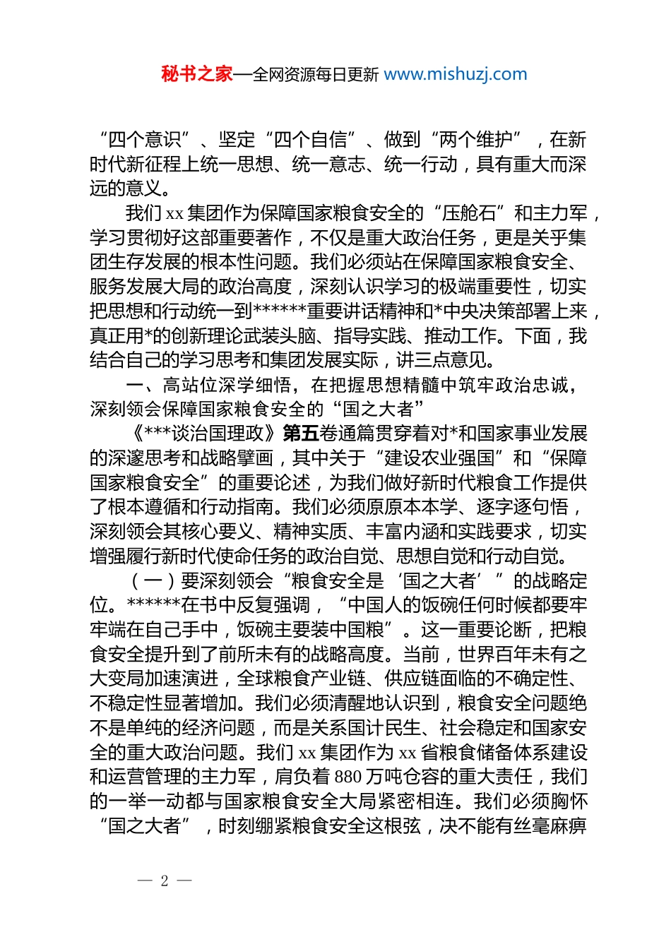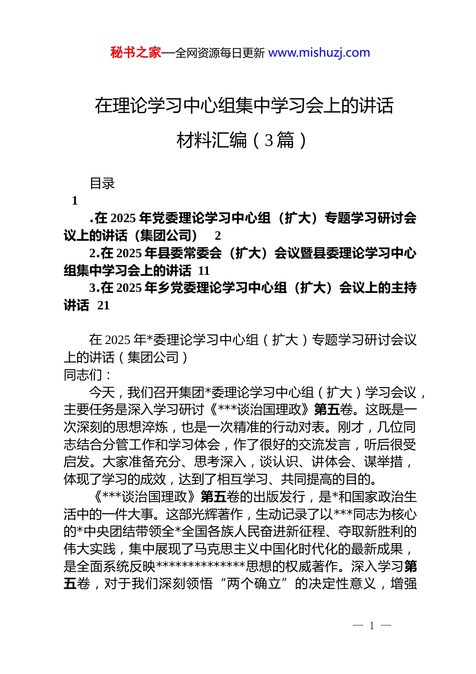 秘书之家—全网资源每日更新 www.mishuzj.com在理论学习中心组集中学习会上的讲话材料汇编(3 篇)目录1.在 2025 年党委理论学习中心组(扩大)专题学习研讨会议上的讲话(集团公司)22.在 2025 年县委常委会(扩大)会议暨县委理论学习中心组集中学习会上的讲话 113.在 2025 年乡党委理论学习中心组(扩大)会议上的主持讲话 21在 2025 年*委理论学习中心组(扩大)专题学习研讨会议上的讲话(集团公司)同志们:今天,我们召开集团*委理论学习中心组(扩大)学习会议,主要任务是深入学习研讨《***谈治国理政》第五卷。这既是一次深刻的思想淬炼,也是一次精准的行动对表。刚才,几位同志结合分管工作和学习体会,作了很好的交流发言,听后很受启发。大家准备充分、思考深入,谈认识、讲体会、谋举措,体现了学习的成效,达到了相互学习、共同提高的目的。《***谈治国理政》第五卷的出版发行,是*和国家政治生活中的一件大事。这部光辉著作,生动记录了以***同志为核心的*中央团结带领全*全国各族人民奋进新征程、夺取新胜利的伟大实践,集中展现了马克思主义中国化时代化的最新成果,是全面系统反映**************思想的权威著作。深入学习第五卷,对于我们深刻领悟“两个确立”的决定性意义,增强— 1 —秘书之家—全网资源每日更新 www.mishuzj.com“四个意识”、坚定“四个自信”、做到“两个维护”,在新时代新征程上统一思想、统一意志、统一行动,具有重大而深远的意义。我们 xx 集团作为保障国家粮食安全的“压舱石”和主力军,学习贯彻好这部重要著作,不仅是重大政治任务,更是关乎集团生存发展的根本性问题。我们必须站在保障国家粮食安全、服务发展大局的政治高度,深刻认识学习的极端重要性,切实把思想和行动统一到******重要讲话精神和*中央决策部署上来,真正用*的创新理论武装头脑、指导实践、推动工作。下面,我结合自己的学习思考和集团发展实际,讲三点意见。一、高站位深学细悟,在把握思想精髓中筑牢政治忠诚,深刻领会保障国家粮食安全的“国之大者”《***谈治国理政》第五卷通篇贯穿着对*和国家事业发展的深邃思考和战略擘画,其中关于“建设农业强国”和“保障国家粮食安全”的重要论述,为我们做好新时代粮食工作提供了根本遵循和行动指南。我们必须原原本本学、逐字逐句悟,深刻领会其核心要义、精神实质、丰富内涵和实践要求,切实增强履行新时代使命任务的政治自觉、思想自觉和行动自觉。(一)要深刻领会“粮食安全是‘国之大者’”的战略定位。******在书中反复强调,“中国人的饭碗任何时候都要牢牢端在自己手中,饭碗主要装中国粮”。这一重要论断,把粮食安全提升到了前所未有的战略高度。当前,世界百年未有之大变局加速演进,全球粮食产业链、供应链面临的不确定性、不稳定性显著增加。我们必须清醒地认识到,粮食安全问题绝不是单纯的经济问题,而是关系国计民生、社会稳定和国家安全的重大政治问题。我们 xx 集团作为 xx 省粮食储备体系建设和运营管理的主力军,肩负着 880 万吨仓容的重大责任,我们的一举一动都与国家粮食安全大局紧密相连。我们必须胸怀“国之大者”,时刻绷紧粮食安全这根弦,决不能有丝毫麻痹— 2 —秘书之家—全网资源每日更新 www.mishuzj.com和懈怠。要不断提高政治判断力、政治领悟力、政治执行力,自觉把集团的工作放到*和国家事业发展全局中去思考、去定位、去摆布,确保*中央关于粮食安全的各项决策部署在集团不折不扣地落地生根。(二)要深刻领会“藏粮于地、藏粮于技”的根本路径。***指出,保障粮食安全,关键在于落实藏粮于地、藏粮于技战略。这为我们从根本上保障粮食供给提供了科学指引。虽然我们集团的主业是粮食收储、贸易和加工,不直接参与前端种植,但我们是连接生产与消费的关键枢纽,是推动农业技术应用和产业升级的重要力量。我们要思考,如何通过我们的市场化运作,反哺农业生产端?如何利用我们的仓储物流优势,引导和激励广大农户采用更先进的种植技术、种植更优质的粮食品种?例如,我们可以深化“订单种植”模式,与合作社、种植大户建立更紧密的利益联结机制...