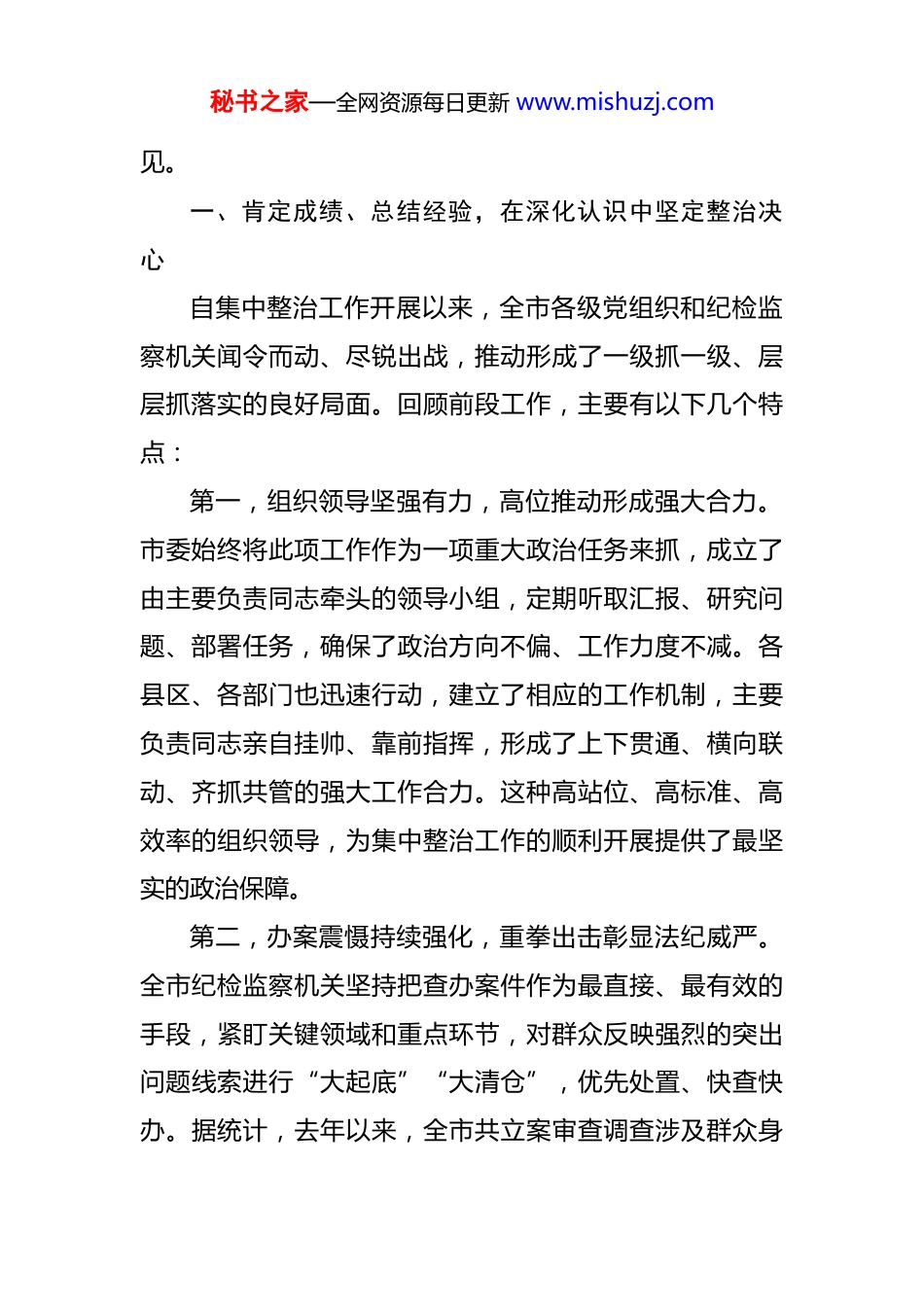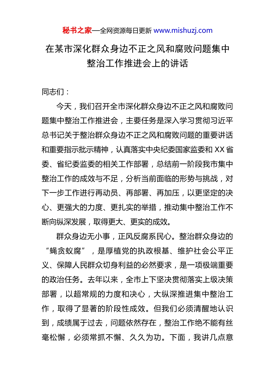 秘书之家—全网资源每日更新 www.mishuzj.com在某市深化群众身边不正之风和腐败问题集中整治工作推进会上的讲话 同志们:今天,我们召开全市深化群众身边不正之风和腐败问题集中整治工作推进会,主要任务是深入学习贯彻习近平总书记关于整治群众身边不正之风和腐败问题的重要讲话和重要指示批示精神,认真落实中央纪委国家监委和 XX 省委、省纪委监委的相关工作部署,总结前一阶段我市集中整治工作的成效与不足,分析当前面临的形势与挑战,对下一步工作进行再动员、再部署、再加压,以更坚定的决心、更强大的力度、更扎实的举措,推动集中整治工作不断向纵深发展,取得更大、更实的成效。群众身边无小事,正风反腐系民心。整治群众身边的“蝇贪蚁腐”,是厚植党的执政根基、维护社会公平正义、保障人民群众切身利益的必然要求,是一项极端重要的政治任务。去年以来,全市上下坚决贯彻落实上级决策部署,以超常规的力度和决心,大纵深推进集中整治工作,取得了显著的阶段性成效。但我们必须清醒地认识到,成绩属于过去,问题依然存在,整治工作绝不能有丝毫松懈,必须常抓不懈、久久为功。下面,我讲几点意秘书之家—全网资源每日更新 www.mishuzj.com见。一、肯定成绩、总结经验,在深化认识中坚定整治决心自集中整治工作开展以来,全市各级党组织和纪检监察机关闻令而动、尽锐出战,推动形成了一级抓一级、层层抓落实的良好局面。回顾前段工作,主要有以下几个特点:第一,组织领导坚强有力,高位推动形成强大合力。市委始终将此项工作作为一项重大政治任务来抓,成立了由主要负责同志牵头的领导小组,定期听取汇报、研究问题、部署任务,确保了政治方向不偏、工作力度不减。各县区、各部门也迅速行动,建立了相应的工作机制,主要负责同志亲自挂帅、靠前指挥,形成了上下贯通、横向联动、齐抓共管的强大工作合力。这种高站位、高标准、高效率的组织领导,为集中整治工作的顺利开展提供了最坚实的政治保障。第二,办案震慑持续强化,重拳出击彰显法纪威严。全市纪检监察机关坚持把查办案件作为最直接、最有效的手段,紧盯关键领域和重点环节,对群众反映强烈的突出问题线索进行“大起底”“大清仓”,优先处置、快查快办。据统计,去年以来,全市共立案审查调查涉及群众身秘书之家—全网资源每日更新 www.mishuzj.com边不正之风和腐败问题的案件 1200 余件,给予党纪政务处分 1150 人,移送司法机关 98 人。通过严肃查处一批隐藏在群众身边的“蝇贪”“蚁腐”,释放了“莫伸手、伸手必被捉”的强烈信号,形成了强有力的震慑效应,有效遏制了基层微腐败的蔓延势头。第三,专项整治有力推进,靶向施治破解顽瘴痼疾。我们坚持问题导向,聚焦群众最关心、最直接、最现实的利益问题,系统抓好中央及省里统一部署的各项专项整治任务。特别是在乡村振兴资金监管、养老服务、医保基金使用等重点领域,我们集中精锐力量,打好了一场场“突击战”和“攻坚战”。例如,在乡村振兴领域,我们对近三年的项目资金进行了全面审计和排查,追回被套取、挪用的资金超过 3000 万元;在医保领域,严厉打击欺诈骗保行为,查处违规医疗机构 50 余家,守护好了人民群众的“看病钱”“救命钱”。这些专项整治,切口小、发力准、效果实,有力地推动了行业风气的净化和治理能力的提升。第四,民生实事可圈可点,成果惠民赢得群众赞誉。我们始终坚持整治的最终目的是为了人民,将解决群众急难愁盼问题贯穿于集中整治全过程。通过进一步完善“群众点题、部门答题、纪委监督、社会评价”的工作机制,秘书之家—全网资源每日更新 www.mishuzj.com我们打通了服务群众的“最后一公里”。去年以来,通过线上平台和线下走访,累计收集群众“点题”诉求 8000 余条,相关职能部门积极“答题”,成功推动解决了一大批涉及教育医疗、养老社保、生态环保、安全生产等领域的民生难题,群众的获得感、幸福感、安全感得到实实在在的提升。在肯定成绩的同时,我们更要正视工作中存在的短板和不足。从当前情况看,一些地方和单位的思想认识还不够到位,存在“上热下冷”的现象;一些领域的腐败问题手段更加...
