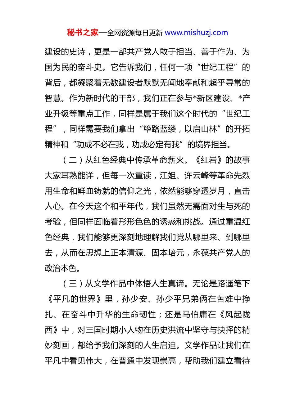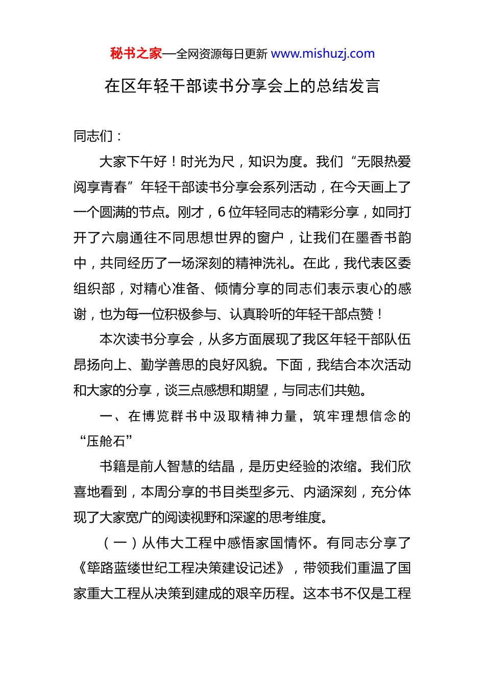 秘书之家—全网资源每日更新 www.mishuzj.com在区年轻干部读书分享会上的总结发言 同志们:大家下午好!时光为尺,知识为度。我们“无限热爱阅享青春”年轻干部读书分享会系列活动,在今天画上了一个圆满的节点。刚才,6 位年轻同志的精彩分享,如同打开了六扇通往不同思想世界的窗户,让我们在墨香书韵中,共同经历了一场深刻的精神洗礼。在此,我代表区委组织部,对精心准备、倾情分享的同志们表示衷心的感谢,也为每一位积极参与、认真聆听的年轻干部点赞!本次读书分享会,从多方面展现了我区年轻干部队伍昂扬向上、勤学善思的良好风貌。下面,我结合本次活动和大家的分享,谈三点感想和期望,与同志们共勉。一、在博览群书中汲取精神力量,筑牢理想信念的“压舱石”书籍是前人智慧的结晶,是历史经验的浓缩。我们欣喜地看到,本周分享的书目类型多元、内涵深刻,充分体现了大家宽广的阅读视野和深邃的思考维度。(一)从伟大工程中感悟家国情怀。有同志分享了《筚路蓝缕世纪工程决策建设记述》,带领我们重温了国家重大工程从决策到建成的艰辛历程。这本书不仅是工程秘书之家—全网资源每日更新 www.mishuzj.com建设的史诗,更是一部共产党人敢于担当、善于作为、为国为民的奋斗史。它告诉我们,任何一项“世纪工程”的背后,都凝聚着无数建设者默默无闻地奉献和超乎寻常的智慧。作为新时代的干部,我们正在参与*新区建设、*产业升级等重点工作,同样是属于我们这个时代的“世纪工程”,同样需要我们拿出“筚路蓝缕,以启山林”的开拓精神和“功成不必在我,功成必定有我”的境界担当。(二)从红色经典中传承革命薪火。《红岩》的故事大家耳熟能详,但每一次重读,江姐、许云峰等革命先烈用生命和鲜血铸就的信仰之光,依然能够穿透岁月,直击人心。在今天这个和平年代,我们虽然无需面对生与死的考验,但同样面临着形形色色的诱惑和挑战。通过重温红色经典,我们能够更深刻地理解我们党从哪里来、到哪里去,从而在思想上正本清源、固本培元,永葆共产党人的政治本色。(三)从文学作品中体悟人生真谛。无论是路遥笔下《平凡的世界》里,孙少安、孙少平兄弟俩在苦难中挣扎、在奋斗中升华的生命韧性;还是马伯庸在《风起陇西》中,对三国时期小人物在历史洪流中坚守与抉择的精妙刻画,都给予我们深刻的人生启迪。文学作品让我们在平凡中看见伟大,在普通中发现崇高,帮助我们建立看待秘书之家—全网资源每日更新 www.mishuzj.com世界和人生的正确坐标系,以更加豁达、坚韧的心态面对工作和生活中的顺境与逆境。二、在学思践悟中练就过硬本领,打造干事创业的“金刚钻”读书的最终目的在于应用。习近平总书记强调,要“依靠学习走向未来”。对于肩负着*区高质量发展重任的年轻干部而言,读书学习更是我们克服“本领恐慌”、成长为栋“梁之才”的根本途径。(一)以读书提升政治能力。有同志分享了《治大国若烹小鲜》,这本书用通俗的语言阐释了国家治理的宏大主题。这启示我们,无论是治理一个国家,还是管理一个部门、推进一项工作,其底层逻辑是相通的。我们年轻干部要通过广泛阅读政治、经济、管理等方面的书籍,不断提高自己的政治判断力、政治领悟力、政治执行力。要善于从书中学习观察问题、分析问题、解决问题的立场、观点和方法,真正做到胸怀“国之大者”,把上级的决策部署与*区的具体实际紧密结合,创造性地开展工作。(二)以读书提升专业素养。当前,新知识、新技术、新业态层出不穷,对干部的专业能力提出了前所未有的高要求。根据我区 2025 年上半年的人才发展状况调研数据显示,每周坚持阅读超过 5 小时的年轻干部,在年度考秘书之家—全网资源每日更新 www.mishuzj.com核中获得“优秀”等次的比例,比平均水平高出 18 个百分点。这充分说明,阅读与个人成长、工作业绩之间存在着强关联。希望大家都能把阅读作为一种刚需,聚焦自己的业务领域,进行系统性、专业化的主题阅读,努力成为本职工作的“活字典”和“业务通”,用专业的精神、专业的标准、专业的能力,推动各项工作提质增效。(三)以读书提升综合本领。本次活动中,除了分享阅读体会,我...