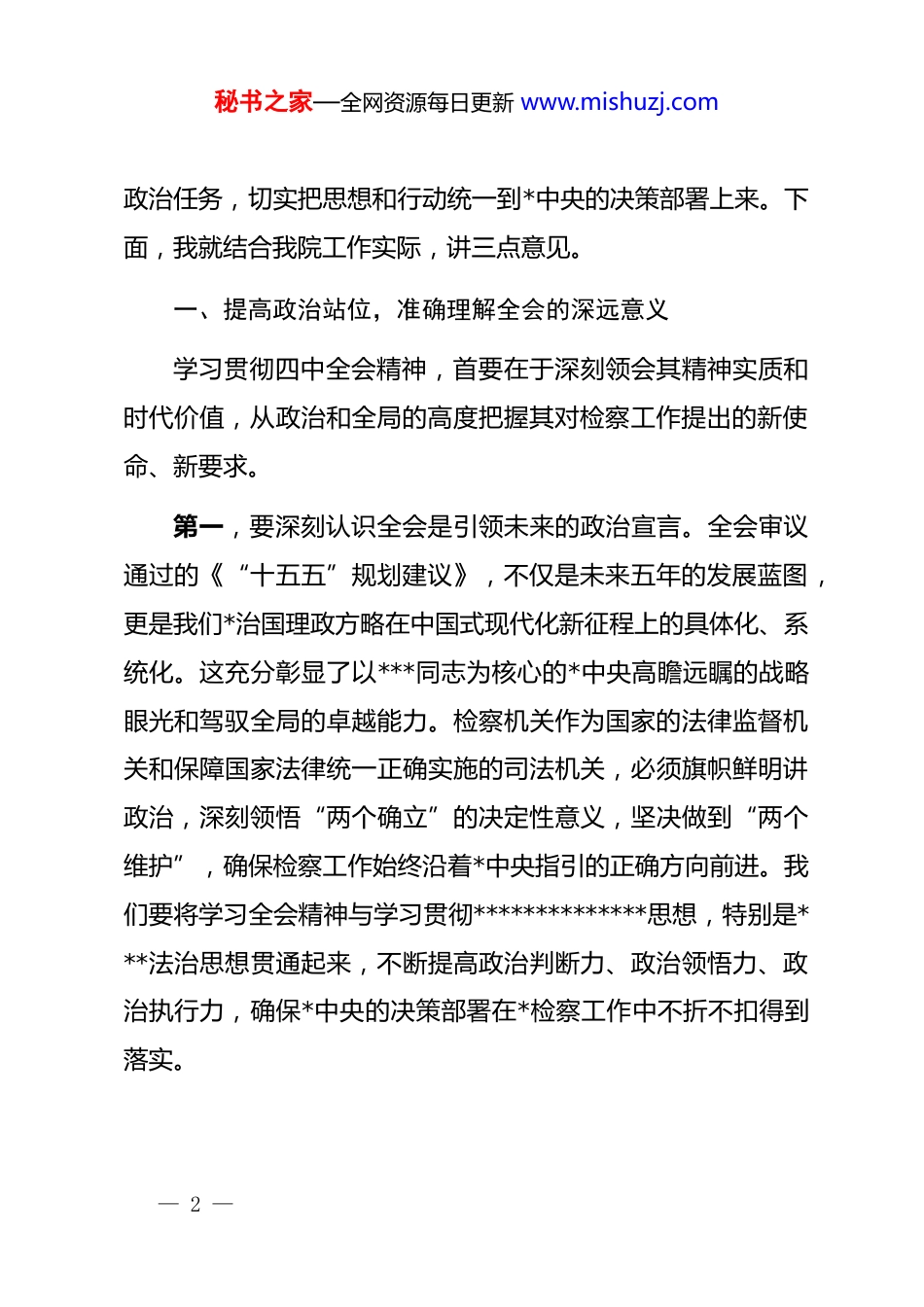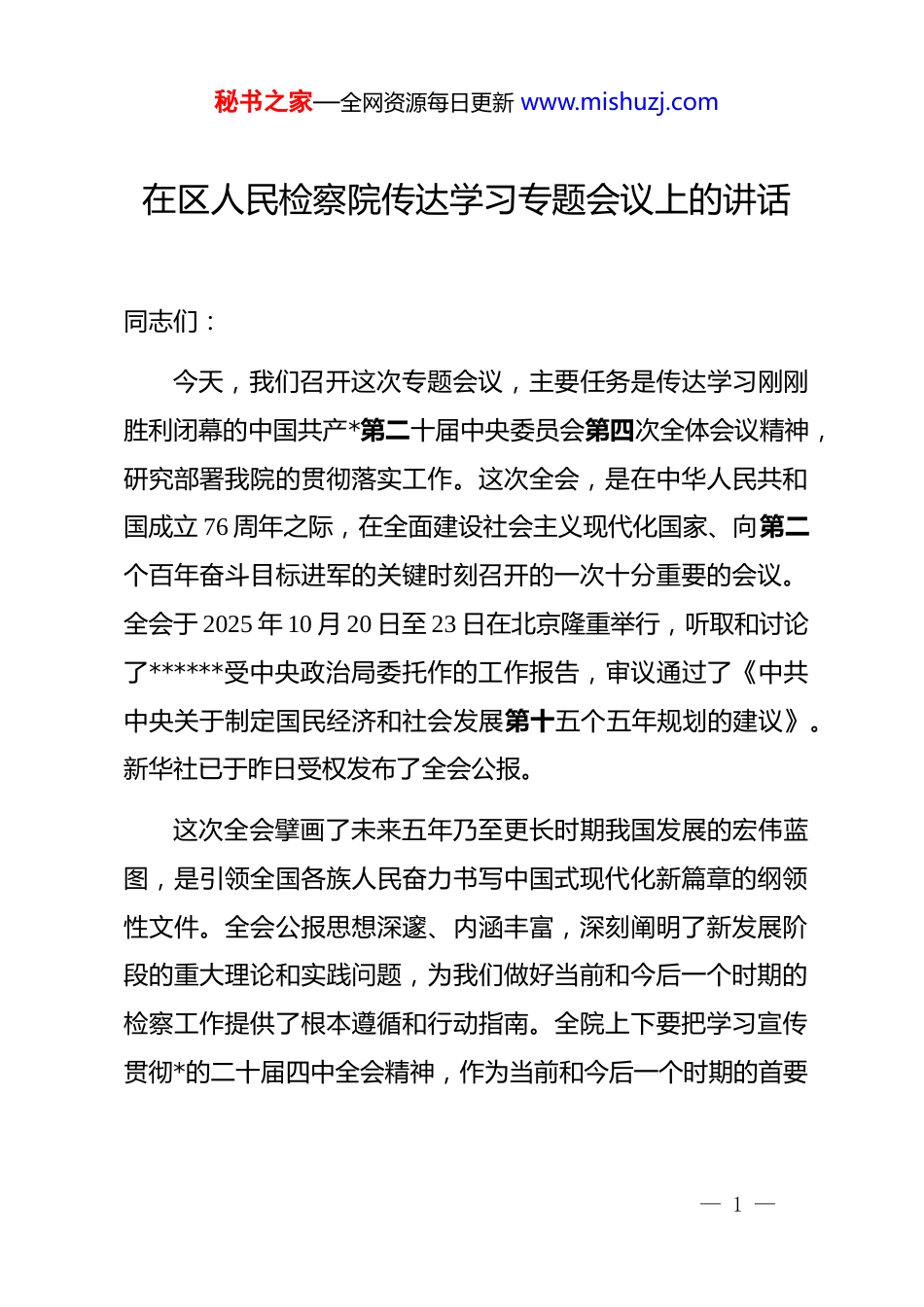 秘书之家—全网资源每日更新 www.mishuzj.com在区人民检察院传达学习专题会议上的讲话同志们:今天,我们召开这次专题会议,主要任务是传达学习刚刚胜利闭幕的中国共产*第二十届中央委员会第四次全体会议精神,研究部署我院的贯彻落实工作。这次全会,是在中华人民共和国成立 76 周年之际,在全面建设社会主义现代化国家、向第二个百年奋斗目标进军的关键时刻召开的一次十分重要的会议。全会于 2025 年 10 月 20 日至 23 日在北京隆重举行,听取和讨论了******受中央政治局委托作的工作报告,审议通过了《中共中央关于制定国民经济和社会发展第十五个五年规划的建议》。新华社已于昨日受权发布了全会公报。这次全会擘画了未来五年乃至更长时期我国发展的宏伟蓝图,是引领全国各族人民奋力书写中国式现代化新篇章的纲领性文件。全会公报思想深邃、内涵丰富,深刻阐明了新发展阶段的重大理论和实践问题,为我们做好当前和今后一个时期的检察工作提供了根本遵循和行动指南。全院上下要把学习宣传贯彻*的二十届四中全会精神,作为当前和今后一个时期的首要— 1 —秘书之家—全网资源每日更新 www.mishuzj.com政治任务,切实把思想和行动统一到*中央的决策部署上来。下面,我就结合我院工作实际,讲三点意见。一、提高政治站位,准确理解全会的深远意义学习贯彻四中全会精神,首要在于深刻领会其精神实质和时代价值,从政治和全局的高度把握其对检察工作提出的新使命、新要求。第一,要深刻认识全会是引领未来的政治宣言。全会审议通过的《“十五五”规划建议》,不仅是未来五年的发展蓝图,更是我们*治国理政方略在中国式现代化新征程上的具体化、系统化。这充分彰显了以***同志为核心的*中央高瞻远瞩的战略眼光和驾驭全局的卓越能力。检察机关作为国家的法律监督机关和保障国家法律统一正确实施的司法机关,必须旗帜鲜明讲政治,深刻领悟“两个确立”的决定性意义,坚决做到“两个维护”,确保检察工作始终沿着*中央指引的正确方向前进。我们要将学习全会精神与学习贯彻**************思想,特别是***法治思想贯通起来,不断提高政治判断力、政治领悟力、政治执行力,确保*中央的决策部署在*检察工作中不折不扣得到落实。— 2 —秘书之家—全网资源每日更新 www.mishuzj.com第二,要深刻认识全会是推动发展的行动纲领。“十五五”时期是我国全面建成小康社会后,乘势而上开启全面建设社会主义现代化国家新征程的第一个五年。全会提出的发展目标、指导原则和重大举措,聚焦于推动高质量发展,构建新发展格局。高质量发展离不开高水平安全,更离不开高质量的法治保障。检察工作是法治建设的重要组成部分,服务经济社会高质量发展是检察机关的重大政治责任和法律责任。全会提出要推进国家治理体系和治理能力现代化,建设中国特色社会主义法治体系。这就要求我们必须更加自觉地将检察工作融入经济社会发展大局,找准服务“十五五”规划实施的切入点和着力点。例如,围绕建设现代化产业体系,我们就需要加大对知识产权的司法保护力度;围绕推进全国统一大市场建设,我们就需要依法平等保护各类市场主体合法权益,严厉打击破坏市场经济秩序犯罪;围绕绿色转型,我们就需要持续做优做实生态环境领域的公益诉讼检察。必须将全会擘画的宏伟蓝图转化为检察履职的“施工图”,以法治“含金量”提升发展“含金量”。第三,要深刻认识全面深化改革的强大动力。全会强调,要坚定不移推进全面深化改革。*的十八届四中全会开启了全面— 3 —秘书之家—全网资源每日更新 www.mishuzj.com依法治国的新时代,部署了深化司法体制改革的宏伟蓝图。*的二十大报告则进一步要求“加强检察机关法律监督工作”。*的二十届四中全会必将在已有基础上,对包括司法体制改革在内的各领域改革作出新的战略部署。检察改革是司法体制改革的重要组成部分,我们必须有“逆水行舟、不进则退”的紧迫感。要对标全会关于全面深化改革、推进国家治理体系和治理能力现代化的新要求持续深化司法责任制综合配套改革,健全检察权运行制约监督体系,完善“四大检察”法律监督新格局,以改革之力破解发展之困,以...