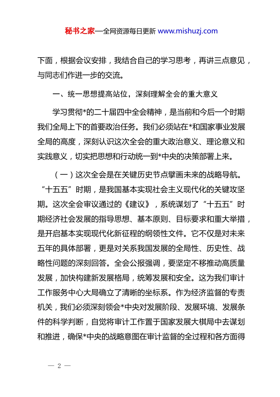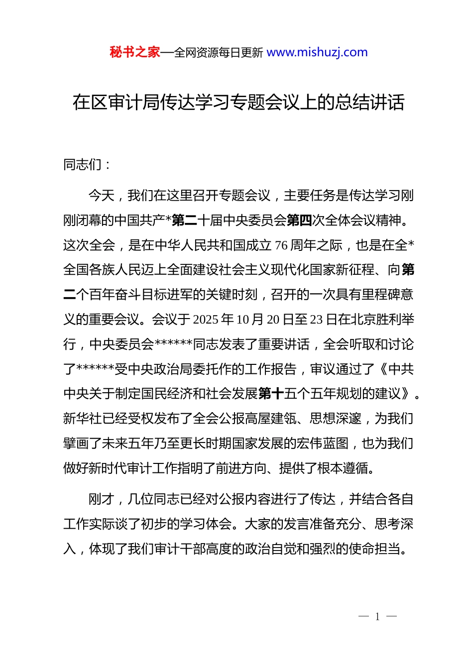 秘书之家—全网资源每日更新 www.mishuzj.com在区审计局传达学习专题会议上的总结讲话同志们:今天,我们在这里召开专题会议,主要任务是传达学习刚刚闭幕的中国共产*第二十届中央委员会第四次全体会议精神。这次全会,是在中华人民共和国成立 76 周年之际,也是在全*全国各族人民迈上全面建设社会主义现代化国家新征程、向第二个百年奋斗目标进军的关键时刻,召开的一次具有里程碑意义的重要会议。会议于 2025 年 10 月 20 日至 23 日在北京胜利举行,中央委员会******同志发表了重要讲话,全会听取和讨论了******受中央政治局委托作的工作报告,审议通过了《中共中央关于制定国民经济和社会发展第十五个五年规划的建议》。新华社已经受权发布了全会公报高屋建瓴、思想深邃,为我们擘画了未来五年乃至更长时期国家发展的宏伟蓝图,也为我们做好新时代审计工作指明了前进方向、提供了根本遵循。刚才,几位同志已经对公报内容进行了传达,并结合各自工作实际谈了初步的学习体会。大家的发言准备充分、思考深入,体现了我们审计干部高度的政治自觉和强烈的使命担当。— 1 —秘书之家—全网资源每日更新 www.mishuzj.com下面,根据会议安排,我结合自己的学习思考,再讲三点意见,与同志们作进一步的交流。一、统一思想提高站位,深刻理解全会的重大意义学习贯彻*的二十届四中全会精神,是当前和今后一个时期我们全局上下的首要政治任务。我们必须站在*和国家事业发展全局的高度,深刻认识这次全会的重大政治意义、理论意义和实践意义,切实把思想和行动统一到*中央的决策部署上来。(一)这次全会是在关键历史节点擘画未来的战略导航。“十五五”时期,是我国基本实现社会主义现代化的关键攻坚期。这次全会审议通过的《建议》,系统谋划了“十五五”时期经济社会发展的指导思想、基本原则、目标要求和重大举措,是开启基本实现现代化新征程的纲领性文件。它不仅是对未来五年的具体部署,更是对关系我国发展的全局性、历史性、战略性问题的深刻回答。全会公报强调,要坚定不移推动高质量发展,加快构建新发展格局,统筹发展和安全。这为我们审计工作服务中心大局确立了清晰的坐标系。作为经济监督的专责机关,我们必须深刻领会*中央对发展阶段、发展环境、发展条件的科学判断,自觉将审计工作置于国家发展大棋局中去谋划和推进,确保*中央的战略意图在审计监督的全过程和各方面得— 2 —秘书之家—全网资源每日更新 www.mishuzj.com到不折不扣的贯彻落实。(二)这次全会是坚持和发展中国特色社会主义的理论升华。全会公报全面总结了*的二十大以来中央政治局的工作,高度评价了在以***同志为核心的*中央坚强领导下,我们国家在应对复杂国际环境和艰巨改革发展稳定任务中取得的新的重大成就。这些成就的取得,根本在于“两个确立”的决定性意义,在于**************思想的科学指引。全会提出的一系列新思想、新观点、新论断,特别是在高质量发展、国家治理体系和治理能力现代化、全面从严治*等方面的新部署进一步丰富和发展了马克思主义中国化时代化的最新成果。我们审计干部,作为国家治理体系的重要组成部分,必须带头学习好、领会好这些理论创新,用*的创新理论武装头脑、指导实践,不断提升从政治上看待和处理经济社会问题的能力,确保审计工作始终沿着正确的政治方向前进。(三)这次全会是推进国家治理现代化的实践号令。全会强调,要进一步全面深化改革,推进国家治理体系和治理能力现代化。而审计,作为*和国家监督体系的重要组成部分,在推进国家治理现代化中扮演着不可或缺的角色。******曾深刻指出,审计监督是国家治理的基石和重要保障。*的二十届四中全— 3 —秘书之家—全网资源每日更新 www.mishuzj.com会公报对完善监督体系、强化权力运行制约和监督提出了新的更高要求。这实质上就是对我们审计工作赋予了更重的责任和更高的期望。我们要深刻认识到,做好审计工作,不仅仅是查错纠弊、核查账目,更是通过常态化的“经济体检”,推动政策落地见效、促进深化改革、维护国家经济安全、推进反腐败斗争,最终服务于国家治理效能的提升。这要求我们必须...