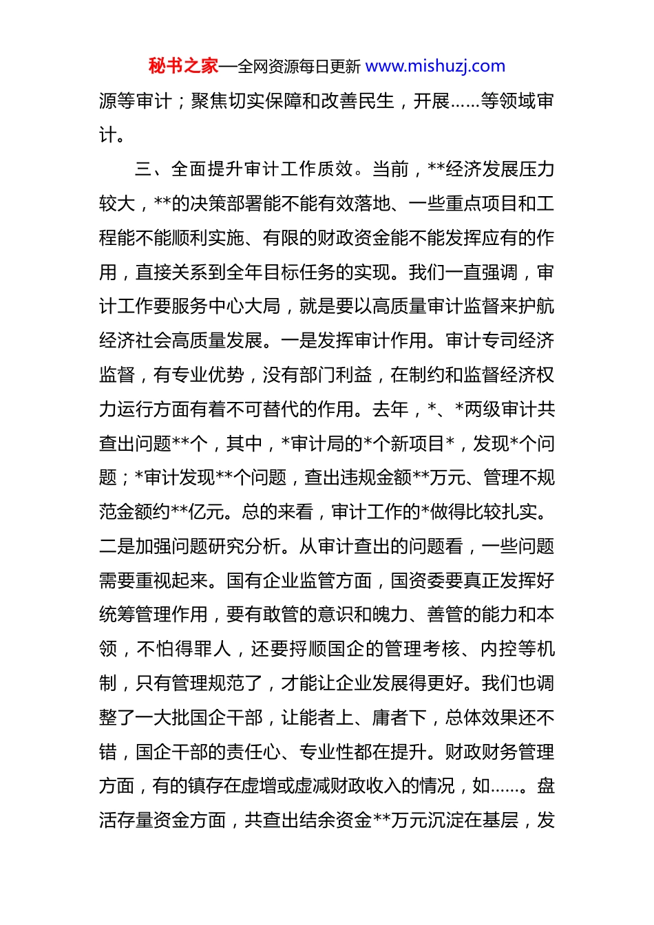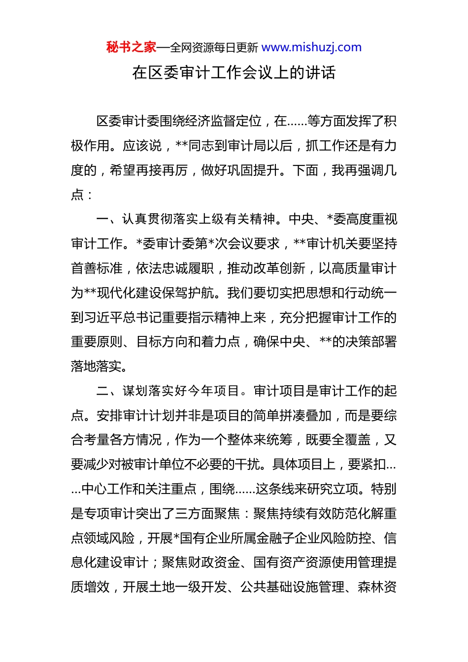 秘书之家—全网资源每日更新 www.mishuzj.com在区委审计工作会议上的讲话 区委审计委围绕经济监督定位,在……等方面发挥了积极作用。应该说,**同志到审计局以后,抓工作还是有力度的,希望再接再厉,做好巩固提升。下面,我再强调几点:一、认真贯彻落实上级有关精神。中央、*委高度重视审计工作。*委审计委第*次会议要求,**审计机关要坚持首善标准,依法忠诚履职,推动改革创新,以高质量审计为**现代化建设保驾护航。我们要切实把思想和行动统一到习近平总书记重要指示精神上来,充分把握审计工作的重要原则、目标方向和着力点,确保中央、**的决策部署落地落实。二、谋划落实好今年项目。审计项目是审计工作的起点。安排审计计划并非是项目的简单拼凑叠加,而是要综合考量各方情况,作为一个整体来统筹,既要全覆盖,又要减少对被审计单位不必要的干扰。具体项目上,要紧扣……中心工作和关注重点,围绕……这条线来研究立项。特别是专项审计突出了三方面聚焦:聚焦持续有效防范化解重点领域风险,开展*国有企业所属金融子企业风险防控、信息化建设审计;聚焦财政资金、国有资产资源使用管理提质增效,开展土地一级开发、公共基础设施管理、森林资秘书之家—全网资源每日更新 www.mishuzj.com源等审计;聚焦切实保障和改善民生,开展……等领域审计。三、全面提升审计工作质效。当前,**经济发展压力较大,**的决策部署能不能有效落地、一些重点项目和工程能不能顺利实施、有限的财政资金能不能发挥应有的作用,直接关系到全年目标任务的实现。我们一直强调,审计工作要服务中心大局,就是要以高质量审计监督来护航经济社会高质量发展。一是发挥审计作用。审计专司经济监督,有专业优势,没有部门利益,在制约和监督经济权力运行方面有着不可替代的作用。去年,*、*两级审计共查出问题**个,其中,*审计局的*个新项目*,发现*个问题;*审计发现**个问题,查出违规金额**万元、管理不规范金额约**亿元。总的来看,审计工作的*做得比较扎实。二是加强问题研究分析。从审计查出的问题看,一些问题需要重视起来。国有企业监管方面,国资委要真正发挥好统筹管理作用,要有敢管的意识和魄力、善管的能力和本领,不怕得罪人,还要捋顺国企的管理考核、内控等机制,只有管理规范了,才能让企业发展得更好。我们也调整了一大批国企干部,让能者上、庸者下,总体效果还不错,国企干部的责任心、专业性都在提升。财政财务管理方面,有的镇存在虚增或虚减财政收入的情况,如……。盘活存量资金方面,共查出结余资金**万元沉淀在基层,发秘书之家—全网资源每日更新 www.mishuzj.com挥不了作用,在财政收支紧平衡和过“紧日子”的背景下,亟待盘活各类存量资金保大事、保要事。镇级工作方面,对镇属企业监管有盲区,制度不完善、绩效考核和清产核资缺失。分析原因,可以归纳为两个方面:一是部分单位思想意识上不重视、责任压的不实。意识是行动的先导,如果思想上不重视,就会导致弄虚作假、敷衍塞责的问题。二是部分单位的制度机制不健全、缺乏约束力。制度是行为的规范,如果制度不完善,就会导致钻空子、搞投机的问题。可以说,“意识”和“机制”是解决好其他问题的基础。*审计局要加强研究,从强化责任意识、完善制度机制的角度给各部门提建议,提高针对性有效性。**要虚心接受审计发现的问题,认真采纳审计提出的建议。三是做好审计发现问题整改。审计整改“下半篇文章”与审计揭示问题“上半篇文章”同样重要,必须一体推进。要压实整改责任,目前,市审计局发现的*个问题和*发现的**多个立行立改类问题均已完成整改,剩下的问题*都要制定整改责任清单,持续推进整改。各整改责任单位要担起主体责任,主管部门要落实监管责任,*审计局要加强跟踪检查、严把销账关口。要坚持常态长效,把整改贯穿于审计工作始终,完善整改闭环机制,对频发问题开展专项整治,对重大问题盯住不放,常态化开展整改回头看,发挥审计“治已病、防未病”作用,举一反三推动源头治秘书之家—全网资源每日更新 www.mishuzj.com理,达到“审计一点、整改一批、规范一片”的效果。要做好督办问效,对审...