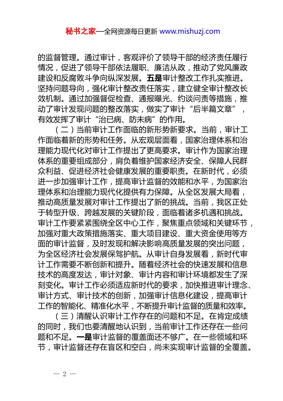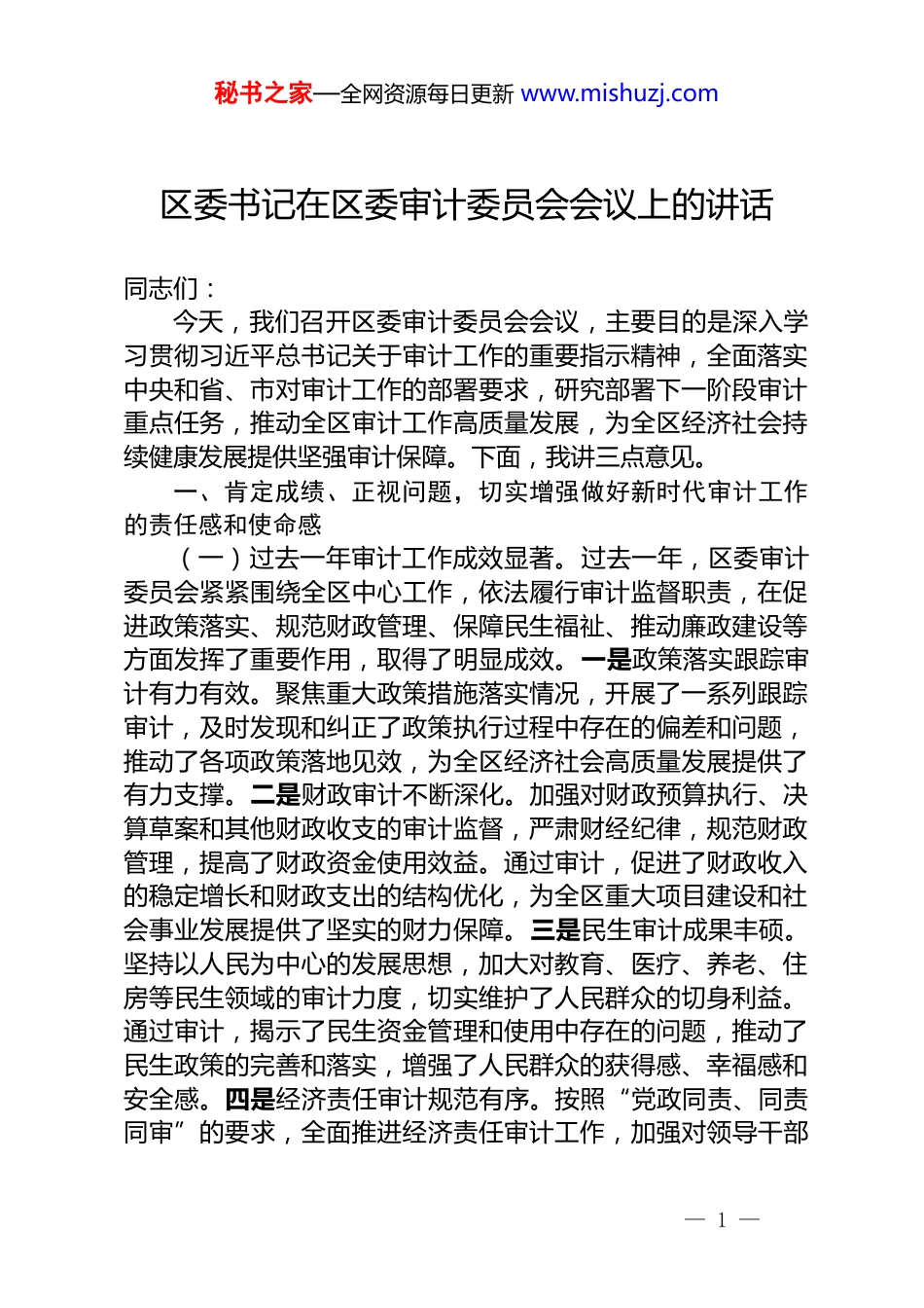 秘书之家—全网资源每日更新 www.mishuzj.com区委书记在区委审计委员会会议上的讲话同志们:今天,我们召开区委审计委员会会议,主要目的是深入学习贯彻习近平总书记关于审计工作的重要指示精神,全面落实中央和省、市对审计工作的部署要求,研究部署下一阶段审计重点任务,推动全区审计工作高质量发展,为全区经济社会持续健康发展提供坚强审计保障。下面,我讲三点意见。一、肯定成绩、正视问题,切实增强做好新时代审计工作的责任感和使命感(一)过去一年审计工作成效显著。过去一年,区委审计委员会紧紧围绕全区中心工作,依法履行审计监督职责,在促进政策落实、规范财政管理、保障民生福祉、推动廉政建设等方面发挥了重要作用,取得了明显成效。一是政策落实跟踪审计有力有效。聚焦重大政策措施落实情况,开展了一系列跟踪审计,及时发现和纠正了政策执行过程中存在的偏差和问题,推动了各项政策落地见效,为全区经济社会高质量发展提供了有力支撑。二是财政审计不断深化。加强对财政预算执行、决算草案和其他财政收支的审计监督,严肃财经纪律,规范财政管理,提高了财政资金使用效益。通过审计,促进了财政收入的稳定增长和财政支出的结构优化,为全区重大项目建设和社会事业发展提供了坚实的财力保障。三是民生审计成果丰硕。坚持以人民为中心的发展思想,加大对教育、医疗、养老、住房等民生领域的审计力度,切实维护了人民群众的切身利益。通过审计,揭示了民生资金管理和使用中存在的问题,推动了民生政策的完善和落实,增强了人民群众的获得感、幸福感和安全感。四是经济责任审计规范有序。按照“党政同责、同责同审”的要求,全面推进经济责任审计工作,加强对领导干部— 1 —秘书之家—全网资源每日更新 www.mishuzj.com的监督管理。通过审计,客观评价了领导干部的经济责任履行情况,促进了领导干部依法履职、廉洁从政,推动了党风廉政建设和反腐败斗争向纵深发展。五是审计整改工作扎实推进。坚持问题导向,强化审计整改责任落实,建立健全审计整改长效机制。通过加强督促检查、通报曝光、约谈问责等措施,推动了审计发现问题的整改落实,做实了审计“后半篇文章”,有效发挥了审计“治已病、防未病”的作用。(二)当前审计工作面临的新形势新要求。当前,审计工作面临着新的形势和任务。从宏观层面看,国家治理体系和治理能力现代化对审计工作提出了更高要求。审计作为国家治理体系的重要组成部分,肩负着维护国家经济安全、保障人民群众利益、促进经济社会健康发展的重要职责。在新时代,必须进一步加强审计工作,提高审计监督的效能和水平,为国家治理体系和治理能力现代化提供有力保障。从全区发展大局看,推动高质量发展对审计工作提出了新的挑战。当前,我区正处于转型升级、跨越发展的关键阶段,面临着诸多机遇和挑战。审计工作要紧紧围绕全区中心工作,聚焦重点领域和关键环节,加强对重大政策措施落实、重大项目建设、重大资金使用等方面的审计监督,及时发现和解决影响高质量发展的突出问题,为全区经济社会发展保驾护航。从审计自身发展看,新时代审计工作需要不断创新和提升。随着经济社会的快速发展和信息技术的高度发达,审计对象、审计内容和审计环境都发生了深刻变化。审计工作必须适应新时代的要求,加快推进审计理念、审计方式、审计技术的创新,加强审计信息化建设,提高审计工作的智能化、精准化水平,不断提升审计监督的质量和效率。(三)清醒认识审计工作存在的问题和不足。在肯定成绩的同时,我们也要清醒地认识到,当前审计工作还存在一些问题和不足。一是审计监督的覆盖面还不够广。在一些领域和环节,审计监督还存在盲区和空白,尚未实现审计监督的全覆盖。— 2 —秘书之家—全网资源每日更新 www.mishuzj.com特别是对一些新兴领域和重点资金的审计监督还不够及时、深入,需要进一步加大审计力度。二是审计质量和效率还有待提高。部分审计项目存在审计方案不够科学、审计方法不够先进、审计证据不够充分等问题,影响了审计质量。同时,审计工作效率不高的问题也较为突出,审计周期过长,不能及时为党委、政府决策提供参考依...