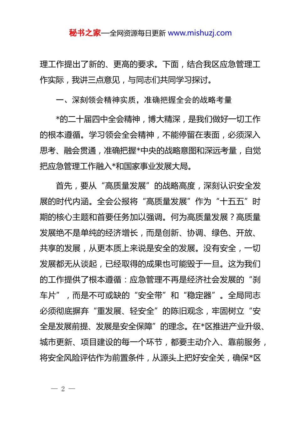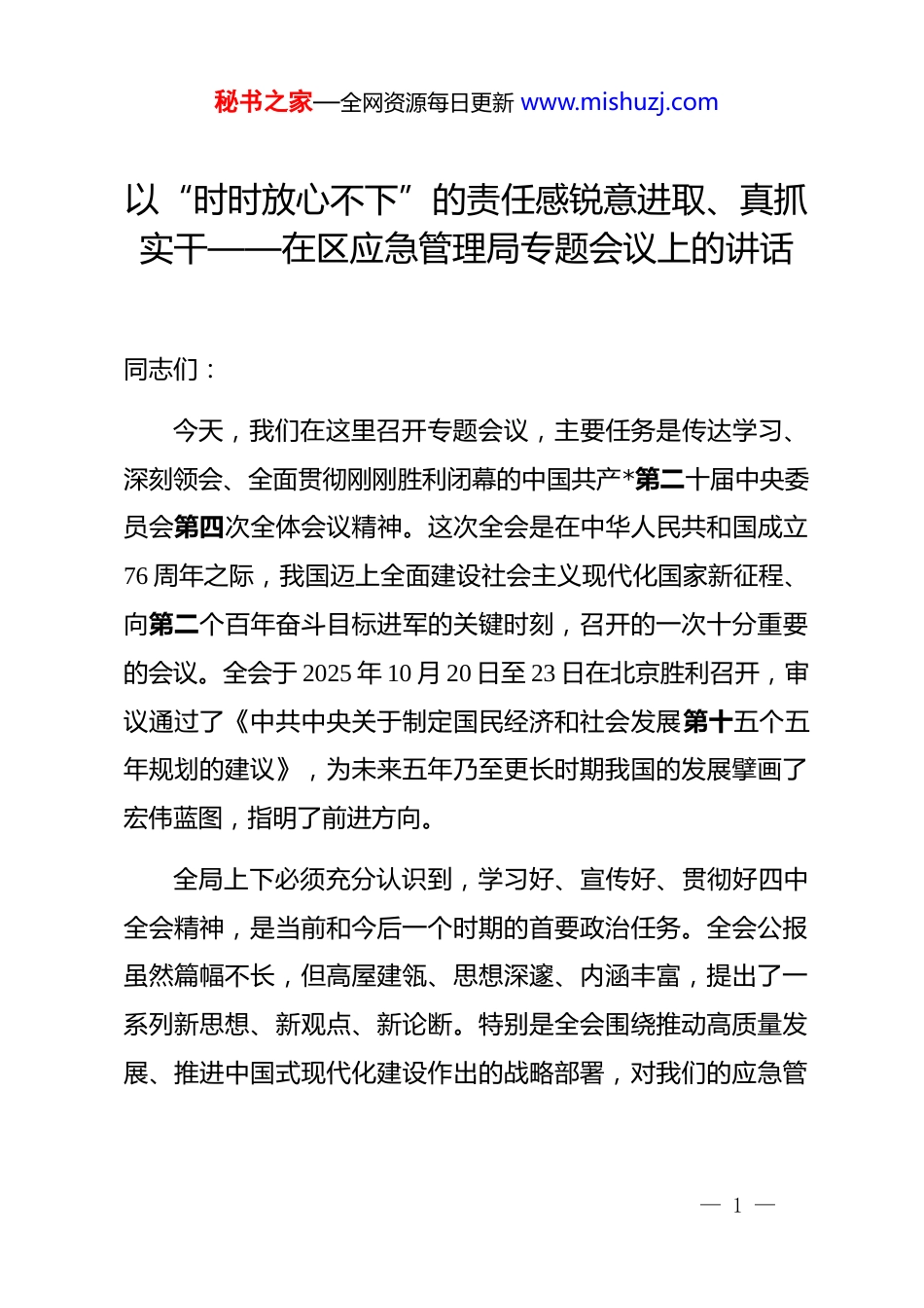 秘书之家—全网资源每日更新 www.mishuzj.com以“时时放心不下”的责任感锐意进取、真抓实干——在区应急管理局专题会议上的讲话同志们:今天,我们在这里召开专题会议,主要任务是传达学习、深刻领会、全面贯彻刚刚胜利闭幕的中国共产*第二十届中央委员会第四次全体会议精神。这次全会是在中华人民共和国成立76 周年之际,我国迈上全面建设社会主义现代化国家新征程、向第二个百年奋斗目标进军的关键时刻,召开的一次十分重要的会议。全会于 2025 年 10 月 20 日至 23 日在北京胜利召开,审议通过了《中共中央关于制定国民经济和社会发展第十五个五年规划的建议》,为未来五年乃至更长时期我国的发展擘画了宏伟蓝图,指明了前进方向。全局上下必须充分认识到,学习好、宣传好、贯彻好四中全会精神,是当前和今后一个时期的首要政治任务。全会公报虽然篇幅不长,但高屋建瓴、思想深邃、内涵丰富,提出了一系列新思想、新观点、新论断。特别是全会围绕推动高质量发展、推进中国式现代化建设作出的战略部署,对我们的应急管— 1 —秘书之家—全网资源每日更新 www.mishuzj.com理工作提出了新的、更高的要求。下面,结合我区应急管理工作实际,我讲三点意见,与同志们共同学习探讨。一、深刻领会精神实质,准确把握全会的战略考量*的二十届四中全会精神,博大精深,是我们做好一切工作的根本遵循。学习领会全会精神,不能停留在表面,必须深入思考、融会贯通,准确把握*中央的战略意图和深远考量,自觉把应急管理工作融入*和国家事业发展大局。首先,要从“高质量发展”的战略高度,深刻认识安全发展的时代内涵。全会公报将“高质量发展”作为“十五五”时期的核心主题和首要任务加以强调。何为高质量发展?高质量发展绝不是单纯的经济增长,而是创新、协调、绿色、开放、共享的发展,从更本质上来说是安全的发展。没有安全,一切发展都无从谈起,已经取得的成果也可能毁于一旦。这为我们的工作提供了根本遵循:应急管理不再是经济社会发展的“刹车片”,而是不可或缺的“安全带”和“稳定器”。全局同志必须彻底摒弃“重发展、轻安全”的陈旧观念,牢固树立“安全是发展前提、发展是安全保障”的理念。在*区推进产业升级、城市更新、项目建设的每一个环节,都要主动介入、靠前服务,将安全风险评估作为前置条件,从源头上把好安全关,确保*区— 2 —秘书之家—全网资源每日更新 www.mishuzj.com的发展是健康可持续、经得起历史检验的高质量发展。其次,要从“推进国家安全体系和能力现代化”的全局维度,深刻认识应急管理的战略定位。全会公报再次强调了统筹发展和安全,建设更高水平的平安中国。*的二十大报告和二十届三中全会已经明确提出,要健全国家安全体系,完善公共安全治理机制。四中全会部署“十五五”规划,更是将这一要求具体化、实践化。这标志着*中央正以前所未有的力度,构建“大安全、大应急”格局。应急管理作为国家治理体系和治理能力现代化的重要组成部分,其职能已远远超越了传统意义上的安全生产监督和抢险救灾的范畴。它关乎人民群众生命财产安全,关乎社会大局稳定,是国家安全的重要基石。因此,我们的工作视野要更加开阔,工作格局要更加宏大。不能仅仅满足于“就事故抓事故”,而是要站在维护政治安全、经济安全、社会安全的战略高度,审视和谋划*区的应急管理工作,将防范化解重大安全风险作为核心任务,切实担负起“促一方发展、保一方平安”的政治责任。再次,要从“以中国式现代化全面推进强国建设”的历史进程中,深刻认识应急管理现代化的必然要求。全会描绘了以中国式现代化全面推进强国建设、民族复兴伟业的宏伟前景。— 3 —秘书之家—全网资源每日更新 www.mishuzj.com一个现代化的强国,必然拥有一流的应急管理体系和能力。回顾应急管理部组建以来的历程,我国应急管理事业实现了系统性、整体性、重构性变革。面向“十五五”,我们的现代化建设必须提速升级。这意味着我们的理念、制度、装备、技术和人才都要向现代化标准看齐。要积极拥抱新一轮科技革命,将大数据、人工智能、物联网等前沿技术深度应用于风险监测、预警发布...