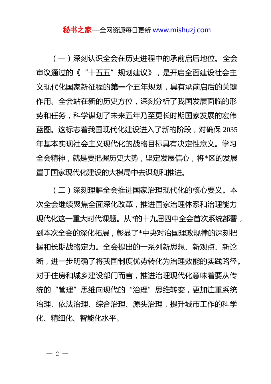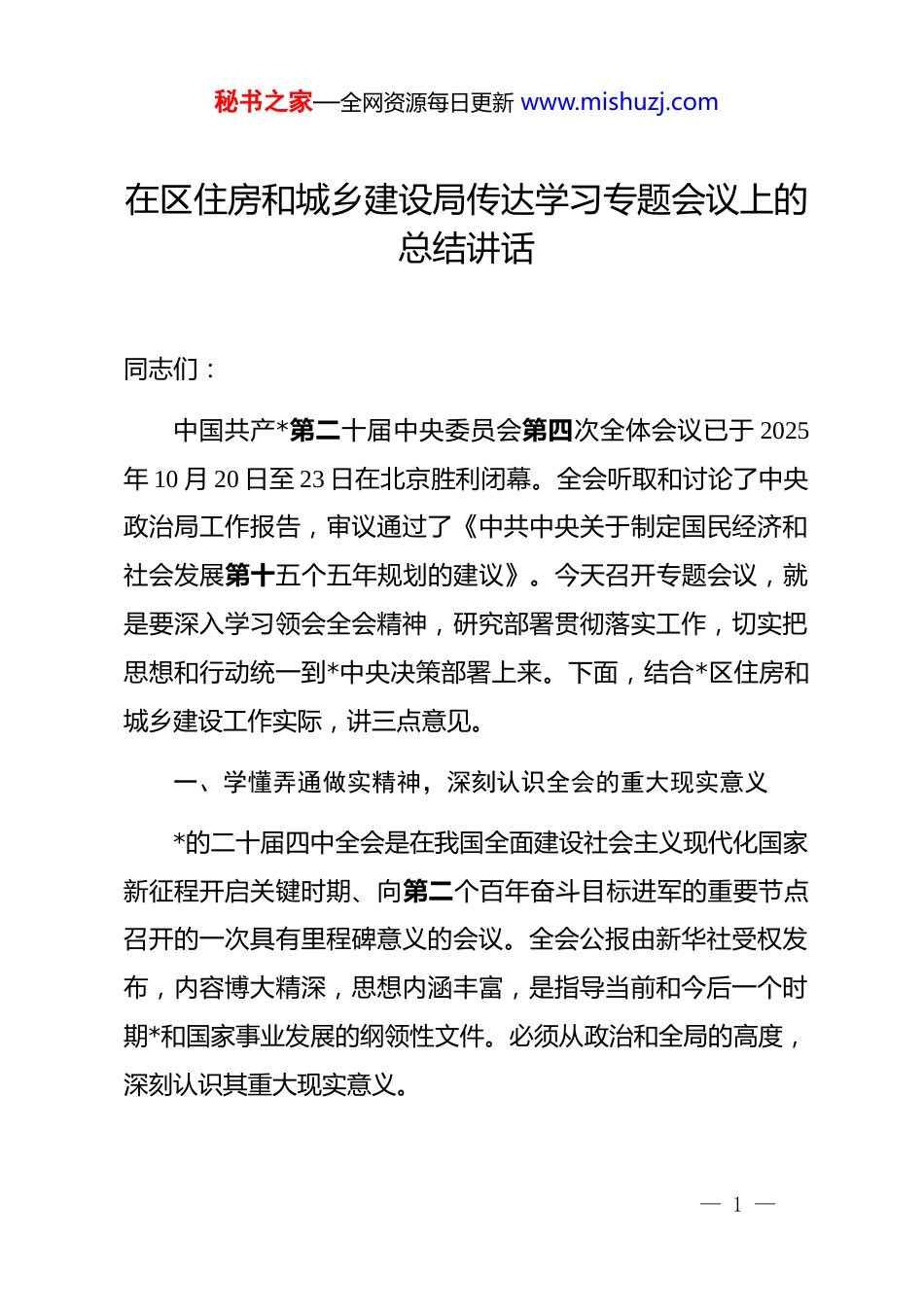 秘书之家—全网资源每日更新 www.mishuzj.com在区住房和城乡建设局传达学习专题会议上的总结讲话同志们:中国共产*第二十届中央委员会第四次全体会议已于 2025年 10 月 20 日至 23 日在北京胜利闭幕。全会听取和讨论了中央政治局工作报告,审议通过了《中共中央关于制定国民经济和社会发展第十五个五年规划的建议》。今天召开专题会议,就是要深入学习领会全会精神,研究部署贯彻落实工作,切实把思想和行动统一到*中央决策部署上来。下面,结合*区住房和城乡建设工作实际,讲三点意见。一、学懂弄通做实精神,深刻认识全会的重大现实意义*的二十届四中全会是在我国全面建设社会主义现代化国家新征程开启关键时期、向第二个百年奋斗目标进军的重要节点召开的一次具有里程碑意义的会议。全会公报由新华社受权发布,内容博大精深,思想内涵丰富,是指导当前和今后一个时期*和国家事业发展的纲领性文件。必须从政治和全局的高度,深刻认识其重大现实意义。— 1 —秘书之家—全网资源每日更新 www.mishuzj.com(一)深刻认识全会在历史进程中的承前启后地位。全会审议通过的《“十五五”规划建议》,是开启全面建设社会主义现代化国家新征程的第一个五年规划,具有承前启后的关键作用。全会站在新的历史方位,深刻分析了我国发展面临的形势和任务,科学谋划了未来五年乃至更长时期国家发展的宏伟蓝图。这标志着我国现代化建设进入了新的阶段,对确保 2035年基本实现社会主义现代化的战略目标具有决定性意义。学习全会精神,就是要把握历史大势,坚定发展信心,将*区的发展置于国家现代化建设的大棋局中去谋划和推进。(二)深刻理解全会推进国家治理现代化的核心要义。本次全会继续聚焦全面深化改革,推进国家治理体系和治理能力现代化这一重大时代课题。从*的十九届四中全会首次系统部署,到本次全会的深化拓展,彰显了*中央对治国理政规律的深刻把握和长期战略定力。全会提出的一系列新思想、新观点、新论断,进一步明确了将我国制度优势转化为治理效能的实践路径。对于住房和城乡建设部门而言,推进治理现代化意味着要从传统的“管理”思维向现代的“治理”思维转变,更加注重系统治理、依法治理、综合治理、源头治理,提升城市工作的科学化、精细化、智能化水平。— 2 —秘书之家—全网资源每日更新 www.mishuzj.com(三)深刻把握全会对基层治理工作的实践要求。国家治理的根基在基层,治理现代化的难点和重点也在基层。全会精神最终要落脚于基层的生动实践。作为城市建设和管理的具体执行部门,*区住房和城乡建设局的工作直接关系群众的切身利益,是展现“中国之治”优越性的重要窗口。全会精神为基层工作提供了根本遵循,要求必须坚持人民至上,把解决群众急难愁盼问题作为出发点和落脚点,通过一件件具体的民生工程、城市更新项目,让群众真切感受到治理现代化带来的实惠和变化。必须将全会精神内化于心、外化于行,转化为推动*区城乡建设的强大动力和实际成效。二、聚焦城乡建设重点,全力推动城市品质提升工程学习贯彻全会精神,关键在于落实。要把全会的战略部署与*区住房和城乡建设工作的具体实际紧密结合,以推动城市高质量发展为主题,以城市品质提升工程为总抓手,奋力开创工作新局面。(一)以城市更新行动为牵引,优化城市空间布局与功能全会强调全面深化改革,为城市更新工作提供了政策机遇和方向指引。要坚持“留、改、拆”并举,以保留利用提升为主,防止大拆大建。要聚焦*区中心城区功能疏解、老旧工业区转型、— 3 —秘书之家—全网资源每日更新 www.mishuzj.com历史文脉传承等重点区域,系统谋划,成片推进。通过城市更新,不仅要改善城市面貌,更要植入新产业、新业态,完善公共服务设施,增强城市活力和竞争力。要探索建立可持续的城市更新模式,健全政策法规体系,吸引社会资本参与,形成政府引导、市场运作、公众参与的多方共建格局。这既是城市发展到新阶段的必然要求,也是推进城市治理现代化的具体实践。(二)以基础设施建设为支撑,筑牢城市安全运行底线。城市基础设施是城市运行的命脉,是城市品质的物质基础。要聚焦全会提出的提...