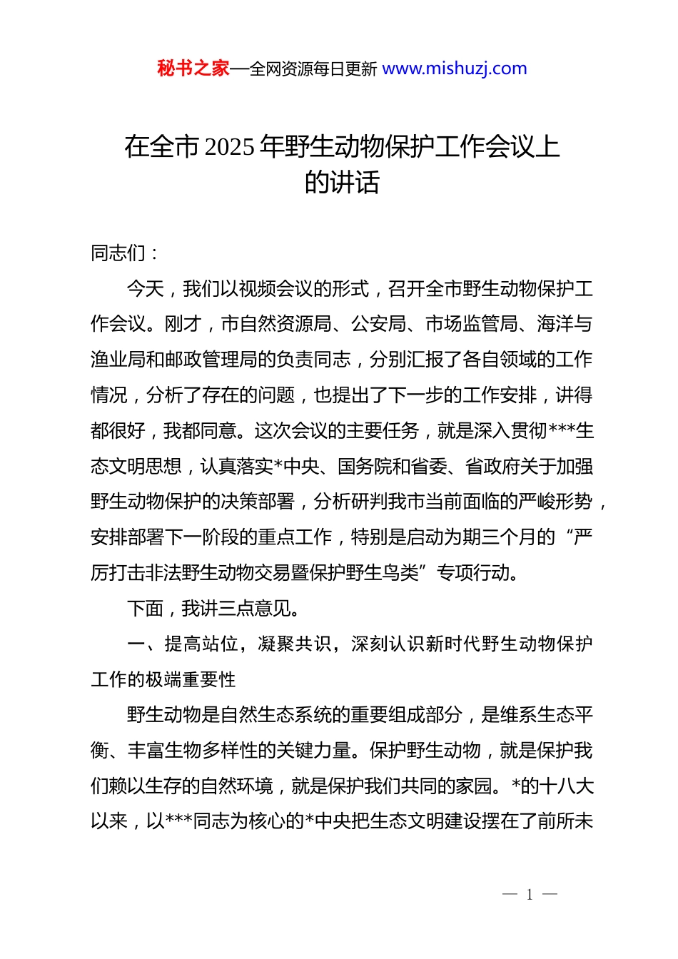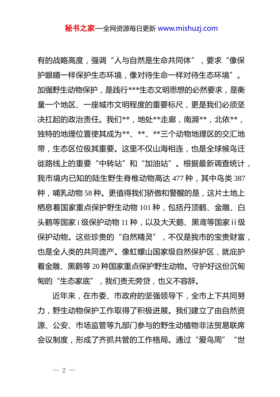 秘书之家—全网资源每日更新 www.mishuzj.com在全市 2025 年野生动物保护工作会议上的讲话同志们:今天,我们以视频会议的形式,召开全市野生动物保护工作会议。刚才,市自然资源局、公安局、市场监管局、海洋与渔业局和邮政管理局的负责同志,分别汇报了各自领域的工作情况,分析了存在的问题,也提出了下一步的工作安排,讲得都很好,我都同意。这次会议的主要任务,就是深入贯彻***生态文明思想,认真落实*中央、国务院和省委、省政府关于加强野生动物保护的决策部署,分析研判我市当前面临的严峻形势,安排部署下一阶段的重点工作,特别是启动为期三个月的“严厉打击非法野生动物交易暨保护野生鸟类”专项行动。下面,我讲三点意见。一、提高站位,凝聚共识,深刻认识新时代野生动物保护工作的极端重要性野生动物是自然生态系统的重要组成部分,是维系生态平衡、丰富生物多样性的关键力量。保护野生动物,就是保护我们赖以生存的自然环境,就是保护我们共同的家园。*的十八大以来,以***同志为核心的*中央把生态文明建设摆在了前所未— 1 —秘书之家—全网资源每日更新 www.mishuzj.com有的战略高度,强调“人与自然是生命共同体”,要求“像保护眼睛一样保护生态环境,像对待生命一样对待生态环境”。加强野生动物保护,是践行***生态文明思想的必然要求,是衡量一个地区、一座城市文明程度的重要标尺,更是我们必须坚决扛起的政治责任。我们**,地处**走廊,南濒**,北依**,独特的地理位置使其成为**、**、**三个动物地理区的交汇地带,生态区位极其重要。这里不仅山海相连,也是全球候鸟迁徙路线上的重要“中转站”和“加油站”。根据最新调查统计,我市境内已知的陆生野生脊椎动物高达 477 种,其中鸟类 387种,哺乳动物 58 种。更值得我们骄傲和警醒的是,这片土地上栖息着国家重点保护野生动物 101 种,包括丹顶鹤、金雕、白头鹤等国家 i 级保护动物 11 种,以及大天鹅、黑鸢等国家ⅱ级保护动物。这些珍贵的“自然精灵”,不仅是我市的宝贵财富,也是全人类的共同遗产。像虹螺山国家级自然保护区,就庇护着金雕、黑鹳等 20 种国家重点保护野生动物。守护好这份沉甸甸的“生态家底”,我们责无旁贷,也义不容辞。近年来,在市委、市政府的坚强领导下,全市上下共同努力,野生动物保护工作取得了积极进展。我们建立了由自然资源、公安、市场监管等九部门参与的野生动植物非法贸易联席会议制度,形成了齐抓共管的工作格局。通过“爱鸟周”“世— 2 —秘书之家—全网资源每日更新 www.mishuzj.com界野生动植物日”等主题宣传活动,我们持续将保护知识送进校园、乡村和社区,市民的保护意识显著增强。我们的执法部门利剑高悬,仅 2024 年就破获各类涉野生动物案件 52 起,抓获犯罪嫌疑人 17 名,解救放飞了大量珍贵鸟类和蟾蜍,有力震慑了违法犯罪分子的嚣张气焰。我们还与鸟类保护协会等社会组织紧密合作,开展野外巡护、清网清套、伤病救助等工作,去年成功救助了白鹳、秃鹫等一批国家保护动物,这些成绩值得充分肯定。但是,我们必须清醒地看到,成绩面前不容乐观,挑战依然严峻。一方面,受经济利益驱使,非法猎捕、交易、食用野生动物的现象仍未禁绝,一些不法分子顶风作案,手段更加隐蔽,组织更加严密。另一方面,我们的工作中还存在一些短板和漏洞。比如,部分地区和部门的重视程度还不够,存在“说起来重要、做起来次要”的现象;部门间的协作机制还不够顺畅,信息共享、联合执法有时还停留在表面;市场监管、物流寄递等环节还存在盲区,给了不法分子可乘之机;基层管护力量薄弱,巡护监测网络尚未完全覆盖;部分区域的水土流失问题,仍在潜移默化地侵蚀着野生动物的栖息环境。这些问题,都直接威胁着我市的生物多样性和生态安全。特别是,新修订的《中华人民共和国野生动物保护法》已施行,这部法律进一步强化了政府的主体责任,对栖息地保护、人工繁育管理、— 3 —秘书之家—全网资源每日更新 www.mishuzj.com应急救助、联合执法等方面提出了更高、更严的要求。法律的生命力在于实施。我们必须将思想和行动统一到中央的决策部署...