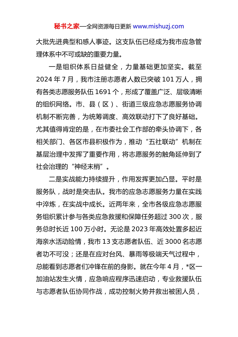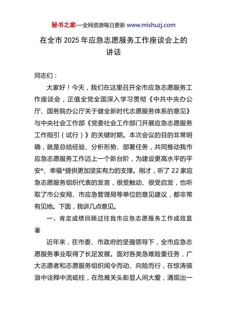 秘书之家—全网资源每日更新 www.mishuzj.com在全市 2025 年应急志愿服务工作座谈会上的讲话 同志们:大家好!今天,我们在这里召开全市应急志愿服务工作座谈会,正值全党全国深入学习贯彻《中共中央办公厅、国务院办公厅关于健全新时代志愿服务体系的意见》与中央社会工作部《党委社会工作部门开展应急志愿服务工作指引(试行)》的关键时期。本次会议的目的非常明确,就是总结经验、分析形势、部署任务,共同推动我市应急志愿服务工作迈上一个新台阶,为建设更高水平的平安*、幸福*提供更加坚实有力的支撑。刚才,听了 22 家应急志愿服务组织代表的发言,很受触动、很受启发,也听取了市公安局、市应急管理局等单位的意见建议,都非常有见地。下面,我讲几点意见。一、肯定成绩回顾过往我市应急志愿服务工作成效显著近年来,在市委、市政府的坚强领导下,全市应急志愿服务事业取得了长足发展。面对各类急难险重任务,广大志愿者和志愿服务组织闻令而动、向险而行,在惊涛骇浪中诠释中流砥柱,在危难关头彰显人间大爱,涌现出一秘书之家—全网资源每日更新 www.mishuzj.com大批先进典型和感人事迹。这支队伍已经成为我市应急管理体系中不可或缺的重要力量。一是组织体系日益健全,力量基础更加坚实。截至2024 年 7 月,我市注册志愿者人数已突破 101 万人,拥有各类志愿服务队伍 1691 个,形成了覆盖广泛、层级清晰的组织网络。市、县(区)、街道三级应急志愿服务协调机制不断完善,为统筹调度、高效联动打下了良好基础。尤其值得肯定的是,在市委社会工作部的牵头协调下,各相关部门、各区市县积极作为,推动“五社联动”机制在基层治理中发挥了重要作用,将志愿服务的触角延伸到了社会治理的“神经末梢”。二是实战能力持续提升,作用发挥更加凸显。平时是服务队,战时是突击队。我市的应急志愿服务力量在实践中淬炼,在实战中成长。近两年来,全市各级应急志愿服务组织累计参与各类应急救援和保障任务超过 300 次,服务总时长近 100 万小时。无论是 2023 年高效处置多起近海亲水活动险情,我市 13 支志愿者队伍、近 3000 名志愿者功不可没;还是在应对台风、暴雨等极端天气过程中,总能看到志愿者们冲锋在前的身影。就在今年 4 月,*区一加油站发生火情,应急响应程序迅速启动,专业救援队伍与志愿者队伍协同作战,成功控制火势并救出被困人员,秘书之家—全网资源每日更新 www.mishuzj.com展现了高效的协同配合能力。这些行动充分证明,我市的应急志愿服务队伍是一支拉得出、冲得上、打得赢的可靠力量。三是服务领域不断拓展,品牌效应更加彰显。我市的应急志愿服务已经从传统的抢险救灾,逐步拓展到安全知识宣传、应急技能培训、大型活动保障、社区风险排查、灾后心理疏导等多个领域。市红十字会持续普及应急救护知识和技能,显著提升了全社会的自救互救能力。“滨城卫士”平安志愿者队伍等一批专业化队伍的建设,有效壮大了基层社会治理的群防群治力量。这些富有特色、卓有成效的品牌项目,不仅提升了城市的安全韧性,更擦亮了*市“爱在大连·志愿有我”的城市文明名片,弘扬了奉献、友爱、互助、进步的志愿精神。四是奉献精神广为弘扬,社会影响更加深远。在危急时刻,总有一种精神让我们感动,总有一种力量催我们奋进。今年 2 月 7 日,*区一处民宅发生火灾,消防员*同志在救援中英勇牺牲。他的事迹感动了整座城市,也激励着无数志愿者以他为榜样,奋不顾身地投身到守护人民群众生命财产安全的事业中。正是因为有千千万万个像*同志一样无私奉献的英雄,以及广大志愿者的默默坚守,我们的城市才更加温暖、更加安全。这些成绩的取得,是市委、秘书之家—全网资源每日更新 www.mishuzj.com市政府坚强领导的结果,是各相关部门通力协作的结果,更是全市广大应急志愿者无私奉献、辛勤付出的结果。在此,我代表市委社会工作部,向长期以来奋战在应急志愿服务一线的全体志愿者、志愿服务工作者,以及所有关心支持这项事业的社会各界人士,表示衷心的感谢和崇高的敬意!二、审视当下准确把握应急志愿服务工作面临的新形势新要求在肯定成绩的同时...