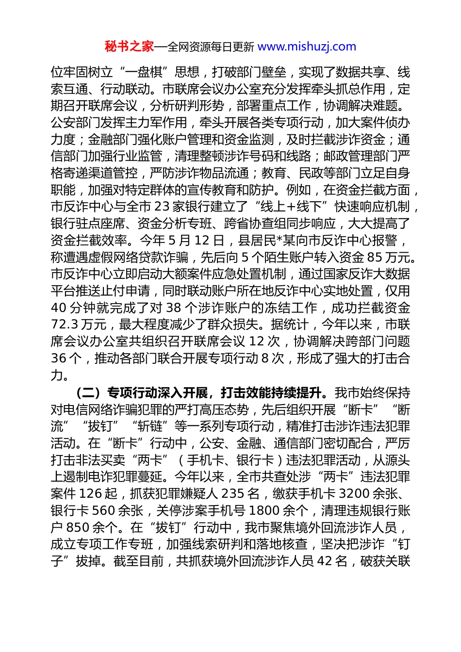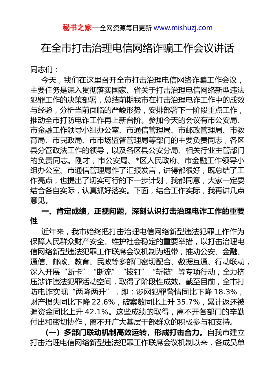 秘书之家—全网资源每日更新 www.mishuzj.com在全市打击治理电信网络诈骗工作会议讲话同志们:今天,我们在这里召开全市打击治理电信网络诈骗工作会议,主要任务是深入贯彻落实国家、省关于打击治理电信网络新型违法犯罪工作的决策部署,总结前期我市在打击治理电诈工作中的成效与经验,分析当前面临的严峻形势,安排部署下一阶段重点工作,推动全市打防电诈工作再上新台阶。参加今天的会议有市公安局、市金融工作领导小组办公室、市通信管理局、市邮政管理局、市教育局、市民政局、市市场监督管理局等部门的主要负责同志,各区县分管政法工作的领导,以及各区县公安分局、相关行业主管部门的负责同志。刚才,市公安局、*区人民政府、市金融工作领导小组办公室、市通信管理局作了汇报发言,讲得都很好,既总结了工作亮点,也提出了切实可行的下一步计划,我都同意,大家一定要结合各自实际,认真抓好落实。下面,结合工作实际,我再讲几点意见。一、肯定成绩,正视问题,深刻认识打击治理电诈工作的重要性近年来,我市始终把打击治理电信网络新型违法犯罪工作作为保障人民群众财产安全、维护社会稳定的重要举措,以打击治理电信网络新型违法犯罪工作联席会议机制为纽带,推动公安、金融、通信、邮政、教育、民政等多部门密切配合、数据互通、行动联动,深入开展“断卡”“断流”“拔钉”“斩链”等专项行动,全力挤压涉诈违法犯罪活动空间,取得了阶段性成效。截至目前,全市打防电诈实现“两降两升”,即:涉网犯罪警情同比下降 18.3%,财产损失同比下降 22.6%,破案数同比上升 35.7%,累计返还被骗资金同比上升 42.1%。这些成绩的取得,离不开各部门的辛勤付出和密切协作,离不开广大基层干部群众的积极参与和支持。(一)多部门联动机制高效运转,形成打击合力。自我市建立打击治理电信网络新型违法犯罪工作联席会议机制以来,各成员单秘书之家—全网资源每日更新 www.mishuzj.com位牢固树立“一盘棋”思想,打破部门壁垒,实现了数据共享、线索互通、行动联动。市联席会议办公室充分发挥牵头抓总作用,定期召开联席会议,分析研判形势,部署重点工作,协调解决难题。公安部门发挥主力军作用,牵头开展各类专项行动,加大案件侦办力度;金融部门强化账户管理和资金监测,及时拦截涉诈资金;通信部门加强行业监管,清理整顿涉诈号码和线路;邮政管理部门严格寄递渠道管控,严防涉诈物品流通;教育、民政等部门立足自身职能,加强对特定群体的宣传教育和防护。例如,在资金拦截方面,市反诈中心与全市 23 家银行建立了“线上+线下”快速响应机制,银行驻点座席、资金分析专班、跨省协查组同步响应,大大提高了资金拦截效率。今年 5 月 12 日,县居民*某向市反诈中心报警,称遭遇虚假网络贷款诈骗,先后向 5 个陌生账户转入资金 85 万元。市反诈中心立即启动大额案件应急处置机制,通过国家反诈大数据平台推送止付申请,同时联动账户所在地反诈中心实地处置,仅用40 分钟就完成了对 38 个涉诈账户的冻结工作,成功拦截资金72.3 万元,最大程度减少了群众损失。据统计,今年以来,市联席会议办公室共组织召开联席会议 12 次,协调解决跨部门问题36 个,推动各部门联合开展专项行动 8 次,形成了强大的打击合力。(二)专项行动深入开展,打击效能持续提升。我市始终保持对电信网络诈骗犯罪的严打高压态势,先后组织开展“断卡”“断流”“拔钉”“斩链”等一系列专项行动,精准打击涉诈违法犯罪活动。在“断卡”行动中,公安、金融、通信部门密切配合,严厉打击非法买卖“两卡”(手机卡、银行卡)违法犯罪活动,从源头上遏制电诈犯罪蔓延。今年以来,全市共查处涉“两卡”违法犯罪案件 126 起,抓获犯罪嫌疑人 235 名,缴获手机卡 3200 余张、银行卡 560 余张,关停涉案手机号 1800 余个,清理违规银行账户 850 余个。在“拔钉”行动中,我市聚焦境外回流涉诈人员,成立专项工作专班,加强线索研判和落地核查,坚决把涉诈“钉子”拔掉。截至目前,共抓获境外回流涉诈人员 42 名,破获关联秘书之家—全网资源每日更新 www.mishuzj.com案件...