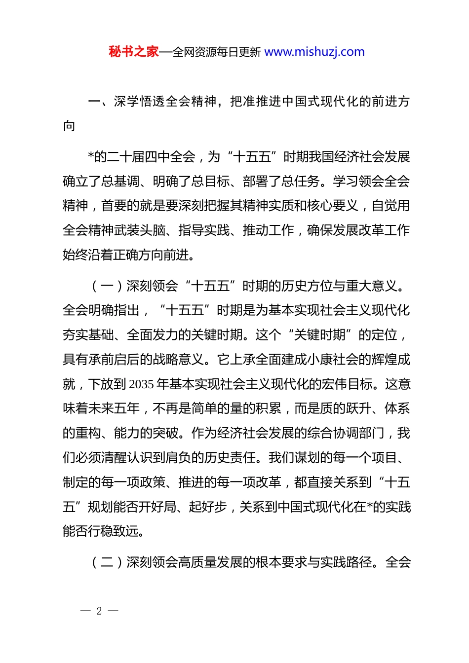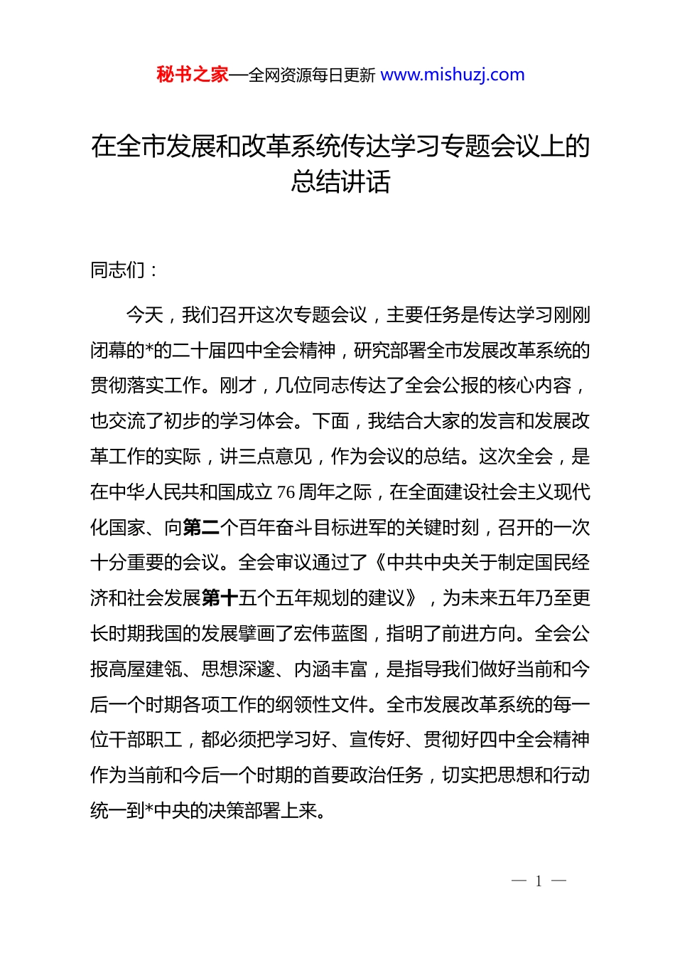 秘书之家—全网资源每日更新 www.mishuzj.com在全市发展和改革系统传达学习专题会议上的总结讲话同志们:今天,我们召开这次专题会议,主要任务是传达学习刚刚闭幕的*的二十届四中全会精神,研究部署全市发展改革系统的贯彻落实工作。刚才,几位同志传达了全会公报的核心内容,也交流了初步的学习体会。下面,我结合大家的发言和发展改革工作的实际,讲三点意见,作为会议的总结。这次全会,是在中华人民共和国成立 76 周年之际,在全面建设社会主义现代化国家、向第二个百年奋斗目标进军的关键时刻,召开的一次十分重要的会议。全会审议通过了《中共中央关于制定国民经济和社会发展第十五个五年规划的建议》,为未来五年乃至更长时期我国的发展擘画了宏伟蓝图,指明了前进方向。全会公报高屋建瓴、思想深邃、内涵丰富,是指导我们做好当前和今后一个时期各项工作的纲领性文件。全市发展改革系统的每一位干部职工,都必须把学习好、宣传好、贯彻好四中全会精神作为当前和今后一个时期的首要政治任务,切实把思想和行动统一到*中央的决策部署上来。— 1 —秘书之家—全网资源每日更新 www.mishuzj.com一、深学悟透全会精神,把准推进中国式现代化的前进方向*的二十届四中全会,为“十五五”时期我国经济社会发展确立了总基调、明确了总目标、部署了总任务。学习领会全会精神,首要的就是要深刻把握其精神实质和核心要义,自觉用全会精神武装头脑、指导实践、推动工作,确保发展改革工作始终沿着正确方向前进。(一)深刻领会“十五五”时期的历史方位与重大意义。全会明确指出,“十五五”时期是为基本实现社会主义现代化夯实基础、全面发力的关键时期。这个“关键时期”的定位,具有承前启后的战略意义。它上承全面建成小康社会的辉煌成就,下放到 2035 年基本实现社会主义现代化的宏伟目标。这意味着未来五年,不再是简单的量的积累,而是质的跃升、体系的重构、能力的突破。作为经济社会发展的综合协调部门,我们必须清醒认识到肩负的历史责任。我们谋划的每一个项目、制定的每一项政策、推进的每一项改革,都直接关系到“十五五”规划能否开好局、起好步,关系到中国式现代化在*的实践能否行稳致远。(二)深刻领会高质量发展的根本要求与实践路径。全会— 2 —秘书之家—全网资源每日更新 www.mishuzj.com再次强调,高质量发展是全面建设社会主义现代化国家的首要任务。公报提出的一系列主要目标,如“高质量发展取得显著成效”“科技自立自强水平大幅提高”“现代化产业体系建设取得重大进展”,都清晰地指向了发展的质量和效益。这要求我们必须彻底摆脱速度情结和路径依赖,完整、准确、全面贯彻新发展理念。发展改革工作必须从过去习惯于铺摊子、上项目,转向更加注重提质增效、创新驱动和绿色转型。要将高质量发展的要求贯穿于经济分析、规划制定、项目审批、政策研究的全过程,建立健全能够体现高质量发展要求的指标体系、政策体系和考核体系,引导全市形成崇尚创新、注重质量、追求卓越的发展导向。(三)深刻领会全面深化改革的强大动力与核心任务。全会强调,要坚持全面深化改革,构建高水平社会主义市场经济体制。这是应对内外环境深刻变化、破解发展深层次矛盾、激发全社会发展活力的关键一招。全会提出要坚持有效市场和有为政府相结合,这为我们处理好政府与市场的关系提供了根本遵循。作为改革的牵头部门,发展改革系统必须勇当改革的“促进派”和“实干家”。要聚焦经济社会发展的堵点、痛点、难点,聚焦市场主体和人民群众的“急难愁盼”,在要素市场— 3 —秘书之家—全网资源每日更新 www.mishuzj.com化配置、优化营商环境、投融资体制改革、城乡融合发展等重点领域,谋划推出一批牵一发而动全身的重大改革举措,以改革的持续深化为高质量发展注入源源不断的动力。二、紧密结合发展实际,找准推动高质量发展的着力点学习贯彻全会精神,关键在结合,落点在实干。必须将全会提出的新思想、新论断、新要求,与*市的发展阶段、发展特征、发展任务紧密结合起来,找准工作的切入点和发力点,将宏伟蓝图细化为施工图,转化为实景画。近年来,在市委、市...
