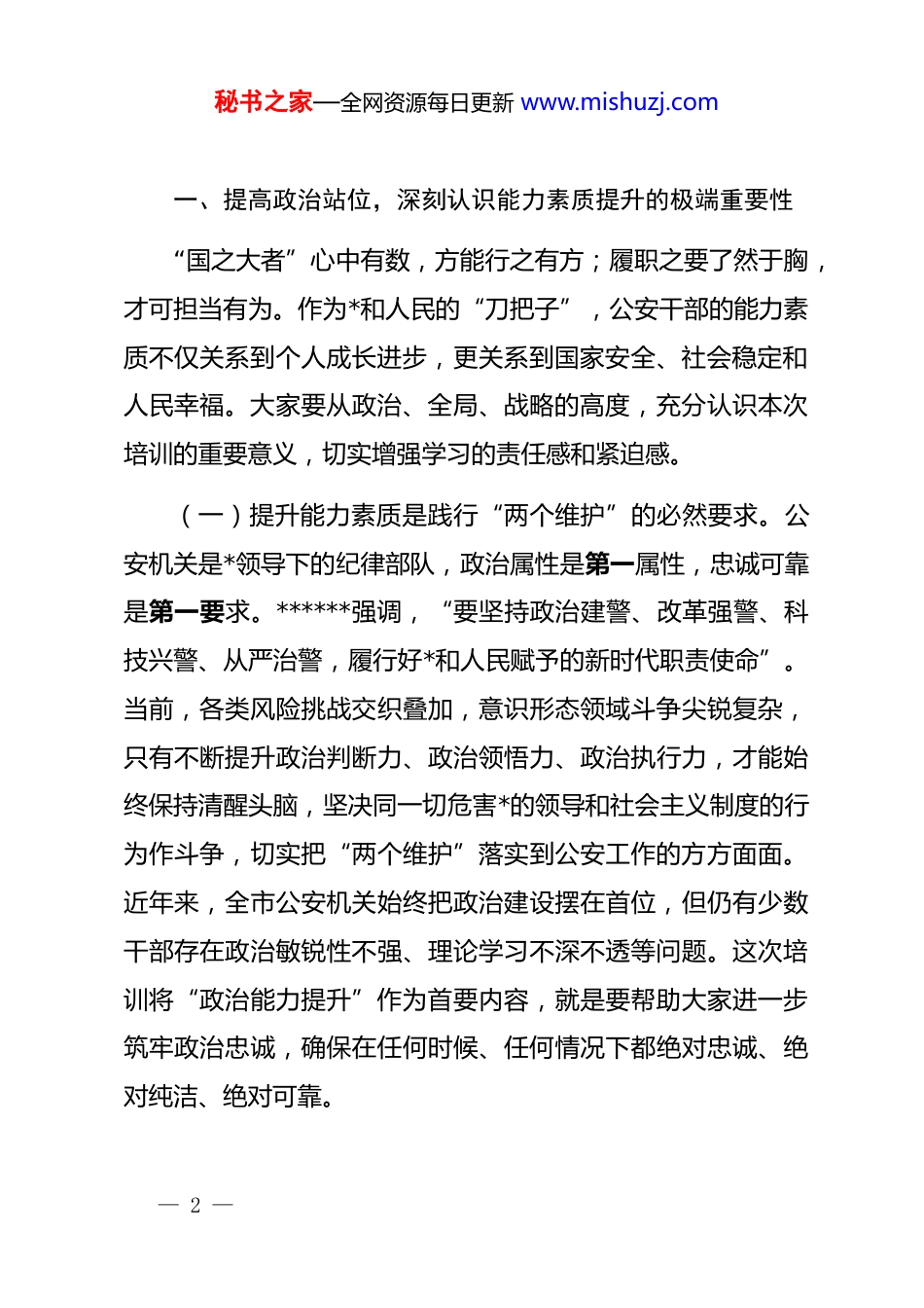 秘书之家—全网资源每日更新 www.mishuzj.com在全市公安系统干部能力素质提升培训班开班式上的讲话同志们:今天,我们隆重举行全市公安系统干部能力素质提升培训班开班仪式。这既是深入学习贯彻*的二十大精神和******关于新时代公安工作重要论述的具体行动,也是适应新形势、应对新挑战,推动全市公安工作高质量发展的现实需要。首先,我代表市公安局*委,向参加本次培训的全体学员表示热烈的欢迎!向为筹备本次培训付出辛勤努力的各位同志表示衷心的感谢!当前,我们正处在世界百年未有之大变局加速演进、国内改革发展稳定任务艰巨繁重的关键时期,公安工作面临的风险挑战、承担的使命任务比以往任何时候都更加复杂、更加艰巨。从维护政治安全到打击违法犯罪,从服务经济发展到保障民生福祉,每一项工作都对公安干部的能力素质提出了更高要求。举办这次培训班,就是要帮助大家补短板、强弱项、提能力,为全市公安工作再上新台阶注入强劲动力。下面,我讲三点意见,与大家共勉。— 1 —秘书之家—全网资源每日更新 www.mishuzj.com一、提高政治站位,深刻认识能力素质提升的极端重要性“国之大者”心中有数,方能行之有方;履职之要了然于胸,才可担当有为。作为*和人民的“刀把子”,公安干部的能力素质不仅关系到个人成长进步,更关系到国家安全、社会稳定和人民幸福。大家要从政治、全局、战略的高度,充分认识本次培训的重要意义,切实增强学习的责任感和紧迫感。(一)提升能力素质是践行“两个维护”的必然要求。公安机关是*领导下的纪律部队,政治属性是第一属性,忠诚可靠是第一要求。******强调,“要坚持政治建警、改革强警、科技兴警、从严治警,履行好*和人民赋予的新时代职责使命”。当前,各类风险挑战交织叠加,意识形态领域斗争尖锐复杂,只有不断提升政治判断力、政治领悟力、政治执行力,才能始终保持清醒头脑,坚决同一切危害*的领导和社会主义制度的行为作斗争,切实把“两个维护”落实到公安工作的方方面面。近年来,全市公安机关始终把政治建设摆在首位,但仍有少数干部存在政治敏锐性不强、理论学习不深不透等问题。这次培训将“政治能力提升”作为首要内容,就是要帮助大家进一步筑牢政治忠诚,确保在任何时候、任何情况下都绝对忠诚、绝对纯洁、绝对可靠。— 2 —秘书之家—全网资源每日更新 www.mishuzj.com(二)提升能力素质是应对风险挑战的迫切需要。当前,我市社会治安形势总体平稳,但随着经济社会快速发展,新型违法犯罪不断涌现,电信网络诈骗、跨境赌博、涉众型经济犯罪等案件高发多发,传统犯罪向网络化、智能化升级。这些新情况、新问题,对公安干部的专业能力提出了更高要求面对电信网络诈骗,部分基层民警仍存在“不会识、不会防、不会打”的问题;面对复杂矛盾纠纷,有的干部缺乏有效化解的方式方法。这次培训聚焦实战需求,设置了“新型犯罪打击防控”“矛盾纠纷多元化解”等课程,就是要帮助大家掌握新知识、新技能,切实提升应对风险挑战的能力水平,牢牢掌握工作主动权。(三)提升能力素质是推动公安工作高质量发展的关键支撑。近年来,在市委、市政府和省公安厅的坚强领导下,全市公安机关围绕“平安 xx、法治 xx”建设目标,扎实推进各项工作,取得了显著成效:刑事案件发案率连续三年下降,群众安全感满意度保持在全省前列,先后荣获“全国优秀公安局”“全省公安工作先进集体”等称号。但我们也要清醒地认识到,与新时代公安工作的要求相比、与人民群众的期待相比,我们还存在不少差距:有的干部创新意识不足,习惯于按老办法办— 3 —秘书之家—全网资源每日更新 www.mishuzj.com事;有的服务理念不强,便民利民措施落实不到位;有的队伍管理存在薄弱环节,纪律作风建设仍需加强。推动公安工作高质量发展,关键在人,核心在能力。这次培训就是要以能力提升为突破口,推动全市公安干部队伍素质实现整体跃升,为公安工作高质量发展提供坚强的人才保障。二、聚焦重点任务,准确把握能力素质提升的核心要求本次培训内容丰富、针对性强,涵盖政治理论、业务技能纪律作风等多个方面。大家要珍惜这次难得的学习机会,带着...