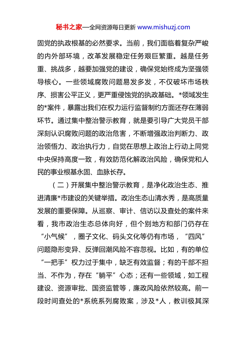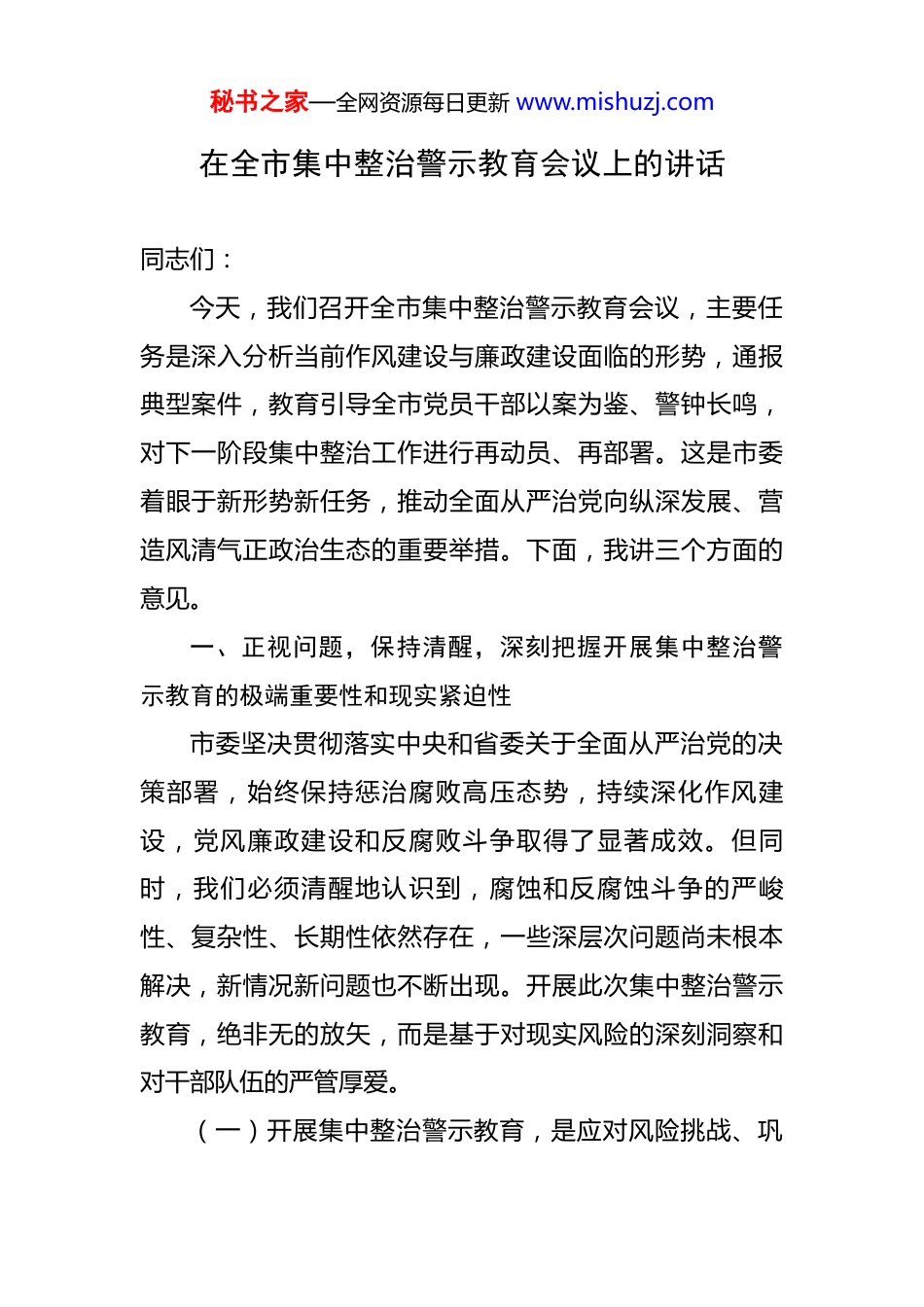 秘书之家—全网资源每日更新 www.mishuzj.com在全市集中整治警示教育会议上的讲话 同志们:今天,我们召开全市集中整治警示教育会议,主要任务是深入分析当前作风建设与廉政建设面临的形势,通报典型案件,教育引导全市党员干部以案为鉴、警钟长鸣,对下一阶段集中整治工作进行再动员、再部署。这是市委着眼于新形势新任务,推动全面从严治党向纵深发展、营造风清气正政治生态的重要举措。下面,我讲三个方面的意见。一、正视问题,保持清醒,深刻把握开展集中整治警示教育的极端重要性和现实紧迫性市委坚决贯彻落实中央和省委关于全面从严治党的决策部署,始终保持惩治腐败高压态势,持续深化作风建设,党风廉政建设和反腐败斗争取得了显著成效。但同时,我们必须清醒地认识到,腐蚀和反腐蚀斗争的严峻性、复杂性、长期性依然存在,一些深层次问题尚未根本解决,新情况新问题也不断出现。开展此次集中整治警示教育,绝非无的放矢,而是基于对现实风险的深刻洞察和对干部队伍的严管厚爱。(一)开展集中整治警示教育,是应对风险挑战、巩秘书之家—全网资源每日更新 www.mishuzj.com固党的执政根基的必然要求。当前,我们面临着复杂严峻的内外部环境,改革发展稳定任务艰巨繁重。越是任务重、挑战多,越要加强党的建设,确保党始终成为坚强领导核心。一些领域腐败问题易发多发,不仅破坏市场秩序、损害公平正义,更严重侵蚀党的执政基础。*领域发生的*案件,暴露出我们在权力运行监督制约方面还存在薄弱环节。通过集中整治警示教育,就是要引导广大党员干部深刻认识腐败问题的政治危害,不断增强政治判断力、政治领悟力、政治执行力,自觉在思想上政治上行动上同党中央保持高度一致,有效防范化解政治风险,确保党和人民的事业根基永固、血脉长存。(二)开展集中整治警示教育,是净化政治生态、推进清廉*市建设的关键举措。政治生态山清水秀,是高质量发展的重要保障。从巡察、审计、信访以及查处的案件来看,我市政治生态总体向好,但个别地方和部门仍存在“小气候”,圈子文化、码头文化等仍有市场,“四风”问题隐形变异、反弹回潮风险不容忽视。比如,有的单位“一把手”权力过于集中,缺乏有效监督;有的干部不担当、不作为,存在“躺平”心态;还有一些领域,如工程建设、资源审批、国资监管等,廉政风险依然较高。前一段时间查处的*系统系列腐败案,涉及*人,教训极其深秘书之家—全网资源每日更新 www.mishuzj.com刻。开展此次集中整治,就是要以刮骨疗毒的勇气、燕子垒窝的韧劲,坚决清除政治生态“污染源”,持续培厚良好政治生态的土壤,推动清廉*市建设目标一步步变为现实。(三)开展集中整治警示教育,是严管厚爱干部、激励担当作为的内在需要。干部是事业发展的中坚力量。绝大多数干部是好的,是勤勉尽责、廉洁奉公的。但也要看到,一些干部在长期工作中放松了要求,出现了这样那样的问题。有的是从一顿饭、一瓶酒、一张卡开始滑向深渊;有的是被“围猎”而丧失原则;还有的是心存侥幸,认为“小节无妨”。市纪委监委查处的*单位*案例,就是典型的由风及腐、风腐一体案件。警示教育的目的,不仅是惩处极少数,更是教育和挽救大多数。通过深入剖析典型案例,用身边事教育身边人,让广大党员干部知敬畏、存戒惧、守底线,时刻绷紧纪律规矩这根弦。这既是对干部的真正爱护,也是树立鲜明导向,激励广大干部在守住底线的同时,放开手脚、心无旁骛地干事创业,为*市高质量发展贡献智慧和力量。二、以案为鉴,警钟长鸣,深刻汲取反面典型案例的沉痛教训前车之覆,后车之鉴。会上通报的这些典型案例,涉秘书之家—全网资源每日更新 www.mishuzj.com及不同层级、不同领域,情节严重,性质恶劣,令人痛心,发人深省。它们就像一面面镜子,映照出理想信念滑坡、权力失控、监督缺失带来的严重后果。全市广大党员干部务必引以为戒,深刻反思,从中受到警醒和教育。(一)必须深刻汲取“理想信念动摇”的教训,始终筑牢思想防线。剖析这些违纪违法干部的堕落轨迹,无一不是从思想蜕化开始的。他们放松了世界观、人生观、价值观的改造,忘记了入党初心和誓言,导致精神上缺...