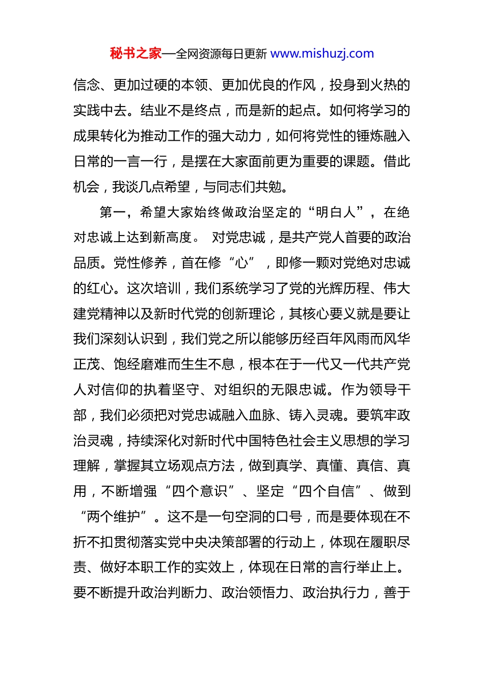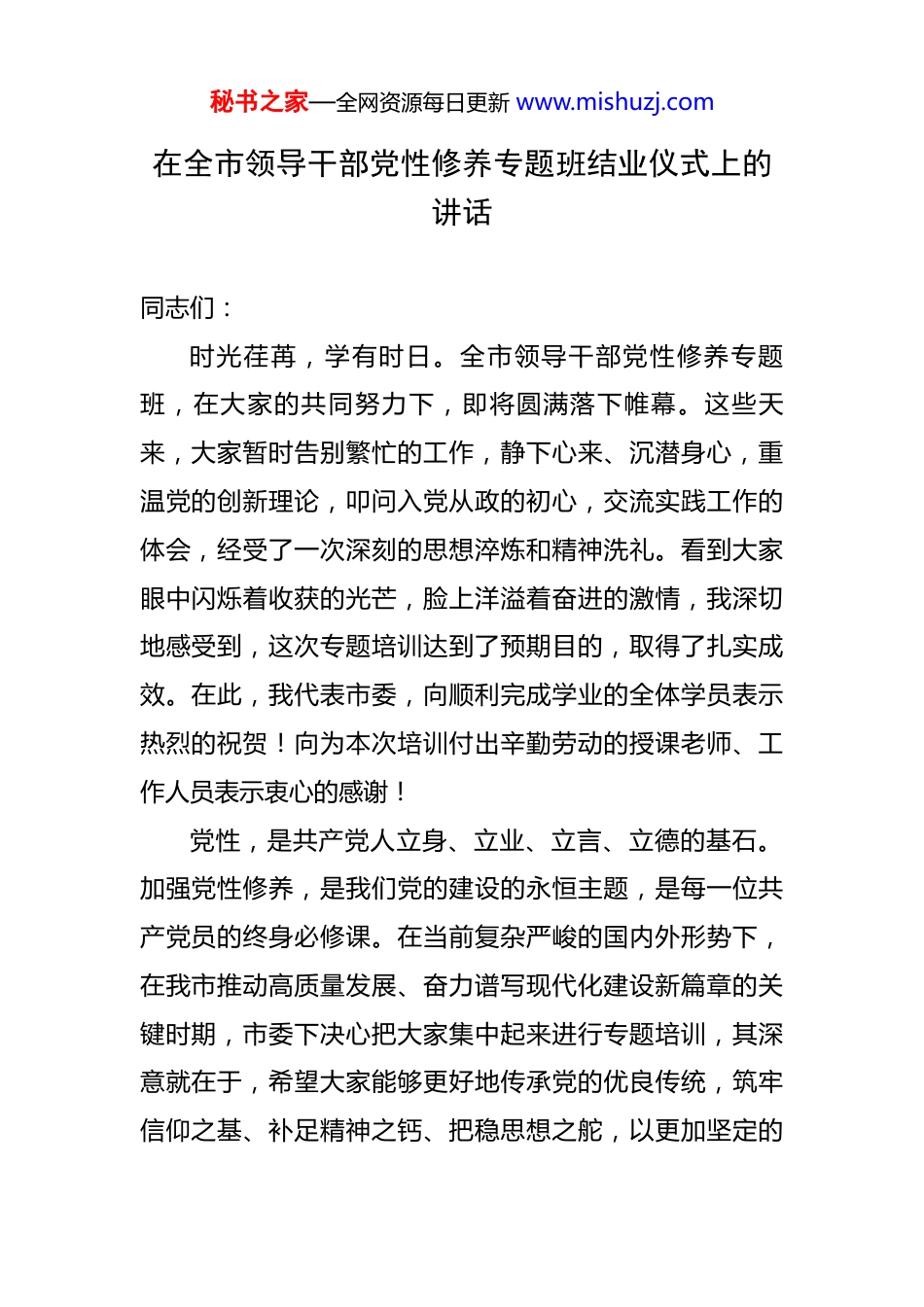 秘书之家—全网资源每日更新 www.mishuzj.com在全市领导干部党性修养专题班结业仪式上的讲话 同志们:时光荏苒,学有时日。全市领导干部党性修养专题班,在大家的共同努力下,即将圆满落下帷幕。这些天来,大家暂时告别繁忙的工作,静下心来、沉潜身心,重温党的创新理论,叩问入党从政的初心,交流实践工作的体会,经受了一次深刻的思想淬炼和精神洗礼。看到大家眼中闪烁着收获的光芒,脸上洋溢着奋进的激情,我深切地感受到,这次专题培训达到了预期目的,取得了扎实成效。在此,我代表市委,向顺利完成学业的全体学员表示热烈的祝贺!向为本次培训付出辛勤劳动的授课老师、工作人员表示衷心的感谢!党性,是共产党人立身、立业、立言、立德的基石。加强党性修养,是我们党的建设的永恒主题,是每一位共产党员的终身必修课。在当前复杂严峻的国内外形势下,在我市推动高质量发展、奋力谱写现代化建设新篇章的关键时期,市委下决心把大家集中起来进行专题培训,其深意就在于,希望大家能够更好地传承党的优良传统,筑牢信仰之基、补足精神之钙、把稳思想之舵,以更加坚定的秘书之家—全网资源每日更新 www.mishuzj.com信念、更加过硬的本领、更加优良的作风,投身到火热的实践中去。结业不是终点,而是新的起点。如何将学习的成果转化为推动工作的强大动力,如何将党性的锤炼融入日常的一言一行,是摆在大家面前更为重要的课题。借此机会,我谈几点希望,与同志们共勉。第一,希望大家始终做政治坚定的“明白人”,在绝对忠诚上达到新高度。 对党忠诚,是共产党人首要的政治品质。党性修养,首在修“心”,即修一颗对党绝对忠诚的红心。这次培训,我们系统学习了党的光辉历程、伟大建党精神以及新时代党的创新理论,其核心要义就是要让我们深刻认识到,我们党之所以能够历经百年风雨而风华正茂、饱经磨难而生生不息,根本在于一代又一代共产党人对信仰的执着坚守、对组织的无限忠诚。作为领导干部,我们必须把对党忠诚融入血脉、铸入灵魂。要筑牢政治灵魂,持续深化对新时代中国特色社会主义思想的学习理解,掌握其立场观点方法,做到真学、真懂、真信、真用,不断增强“四个意识”、坚定“四个自信”、做到“两个维护”。这不是一句空洞的口号,而是要体现在不折不扣贯彻落实党中央决策部署的行动上,体现在履职尽责、做好本职工作的实效上,体现在日常的言行举止上。要不断提升政治判断力、政治领悟力、政治执行力,善于秘书之家—全网资源每日更新 www.mishuzj.com从政治上看问题,善于把握政治大局,在大是大非面前头脑特别清醒、眼睛特别明亮、立场特别坚定,始终做到在党言党、在党忧党、在党为党。要严守党的政治纪律和政治规矩,做政治上的“老实人”、“明白人”,决不能在政治上出现任何偏差,确保我们的事业始终沿着正确的方向前进。第二,希望大家始终做理论武装的“先行者”,在学思践悟上展现新深度。 理论上的成熟是政治上坚定的基础。一个政党有了先进理论的指导,就能无往而不胜;一个领导干部掌握了科学理论的精髓,就能在纷繁复杂的现象中把握本质、明确方向。这次培训,我们安排了丰富的理论课程,大家普遍感到收获很大。但必须清醒地认识到,理论武装是一个持续深化、永无止境的过程。当今时代,知识更新周期大大缩短,新情况、新问题层出不穷,如果满足于现有知识、停留在已有认识,就会陷入“本领恐慌”,甚至迷失方向。希望大家把这次培训作为一次“充电加油”,更作为一次“思想启航”,将学习作为一种生活习惯、一种工作责任、一种精神追求。要坚持读原著、学原文、悟原理,特别是要持续深入地学习领会党的创新理论,深刻把握其时代背景、理论渊源、科学体系和实践要求,做到学深悟透、融会贯通。要大力弘扬理论联秘书之家—全网资源每日更新 www.mishuzj.com系实际的马克思主义学风,紧密结合我市改革发展稳定的实际,紧密结合本地区、本部门的工作实际,紧密结合人民群众的新期待,带着问题学、联系实际思、指导工作用,努力把学习成果转化为谋划工作的思路、促进发展的举措、解决问题的能力,真正让科学理论成为我们攻坚克难、开拓进取的“金...