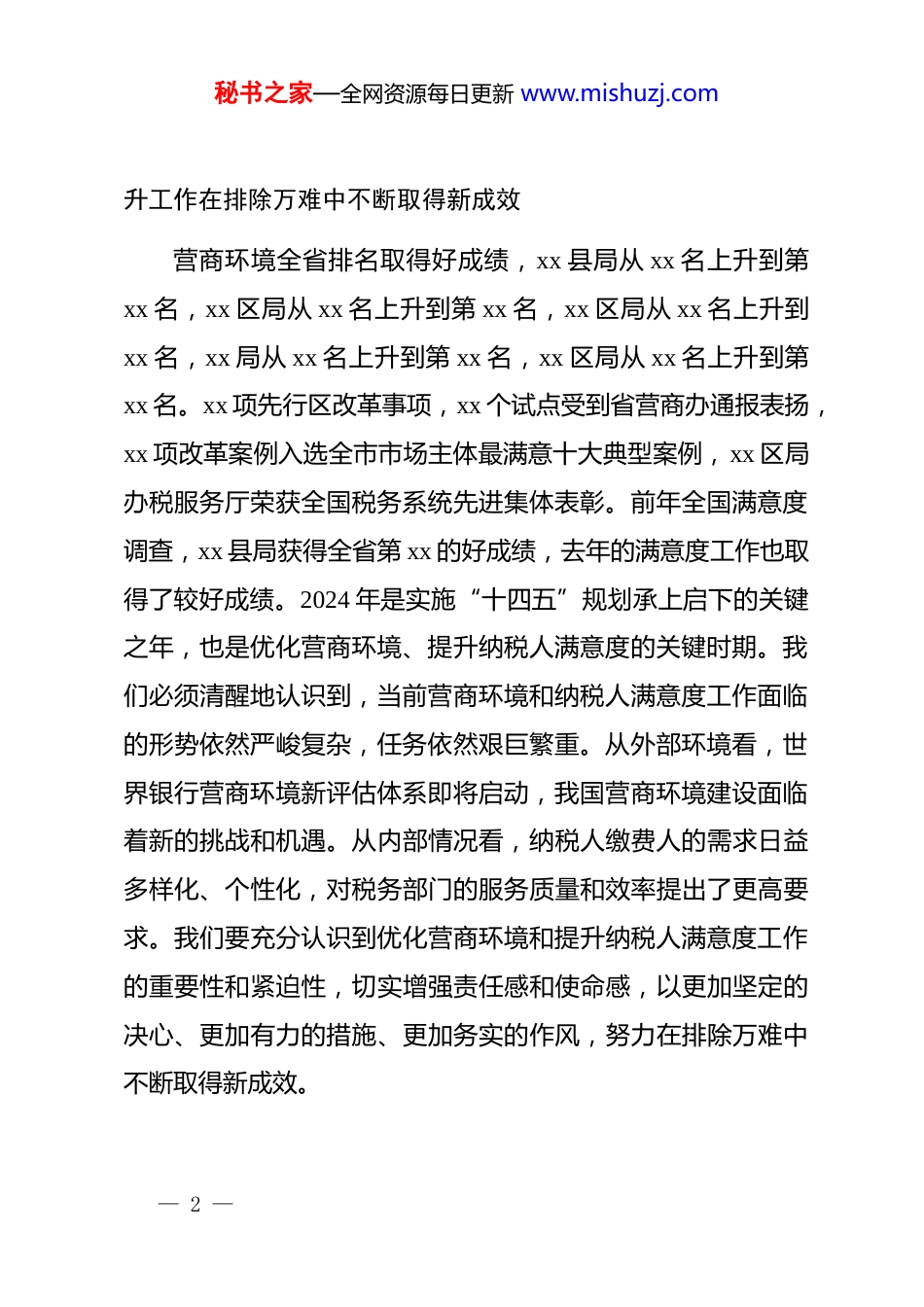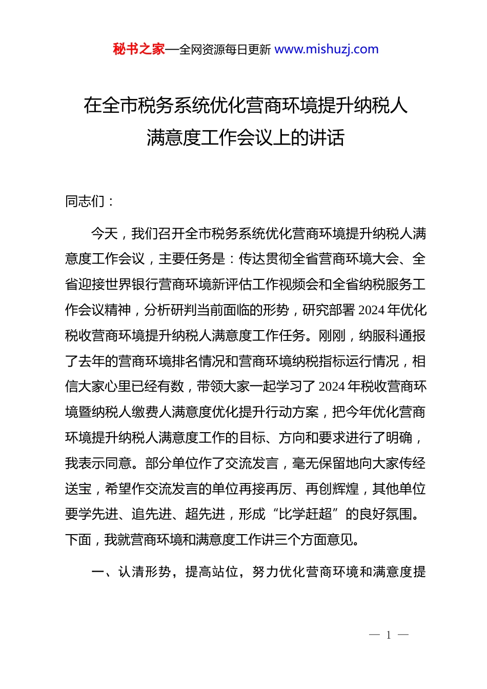秘书之家—全网资源每日更新 www.mishuzj.com在全市税务系统优化营商环境提升纳税人满意度工作会议上的讲话同志们:今天,我们召开全市税务系统优化营商环境提升纳税人满意度工作会议,主要任务是:传达贯彻全省营商环境大会、全省迎接世界银行营商环境新评估工作视频会和全省纳税服务工作会议精神,分析研判当前面临的形势,研究部署 2024 年优化税收营商环境提升纳税人满意度工作任务。刚刚,纳服科通报了去年的营商环境排名情况和营商环境纳税指标运行情况,相信大家心里已经有数,带领大家一起学习了 2024 年税收营商环境暨纳税人缴费人满意度优化提升行动方案,把今年优化营商环境提升纳税人满意度工作的目标、方向和要求进行了明确,我表示同意。部分单位作了交流发言,毫无保留地向大家传经送宝,希望作交流发言的单位再接再厉、再创辉煌,其他单位要学先进、追先进、超先进,形成“比学赶超”的良好氛围。下面,我就营商环境和满意度工作讲三个方面意见。一、认清形势,提高站位,努力优化营商环境和满意度提— 1 —秘书之家—全网资源每日更新 www.mishuzj.com升工作在排除万难中不断取得新成效营商环境全省排名取得好成绩,xx 县局从 xx 名上升到第xx 名,xx 区局从 xx 名上升到第 xx 名,xx 区局从 xx 名上升到xx 名,xx 局从 xx 名上升到第 xx 名,xx 区局从 xx 名上升到第xx 名。xx 项先行区改革事项,xx 个试点受到省营商办通报表扬,xx 项改革案例入选全市市场主体最满意十大典型案例,xx 区局办税服务厅荣获全国税务系统先进集体表彰。前年全国满意度调查,xx 县局获得全省第 xx 的好成绩,去年的满意度工作也取得了较好成绩。2024 年是实施“十四五”规划承上启下的关键之年,也是优化营商环境、提升纳税人满意度的关键时期。我们必须清醒地认识到,当前营商环境和纳税人满意度工作面临的形势依然严峻复杂,任务依然艰巨繁重。从外部环境看,世界银行营商环境新评估体系即将启动,我国营商环境建设面临着新的挑战和机遇。从内部情况看,纳税人缴费人的需求日益多样化、个性化,对税务部门的服务质量和效率提出了更高要求。我们要充分认识到优化营商环境和提升纳税人满意度工作的重要性和紧迫性,切实增强责任感和使命感,以更加坚定的决心、更加有力的措施、更加务实的作风,努力在排除万难中不断取得新成效。— 2 —秘书之家—全网资源每日更新 www.mishuzj.com二、突出重点,精准发力,确保优化营商环境和满意度提升工作取得实效(一)优化税收营商环境,助力经济发展1.深化“放管服”改革-简化办税流程:进一步精简办税资料,优化办税流程,压缩办税时间。推广“非接触式”办税缴费服务,扩大网上办税缴费事项范围,实现更多业务“全程网上办”。加强电子税务局建设,优化系统功能,提高系统稳定性,提升纳税人缴费人的办税体验。-优化税务注销:简化税务注销前置流程,实行清税证明免办服务,扩大简易注销范围,对未处于税务检查状态、无欠税(滞纳金)及罚款、已缴销发票及税控专用设备的纳税人,采取“承诺制”容缺办理,进一步提高注销办理效率。-推进发票电子化:加快增值税专用发票电子化进程,扩大电子发票使用范围,逐步实现发票全领域、全环节、全要素电子化。加强发票风险管理,优化发票领用和开具流程,为纳税人提供更加便捷、高效的发票服务。2.落实税费优惠政策— 3 —秘书之家—全网资源每日更新 www.mishuzj.com-精准宣传辅导:加强税费优惠政策宣传解读,通过官方网站、微信公众号、短信提醒等多种渠道,及时发布政策信息,制作通俗易懂的宣传资料,帮助纳税人缴费人准确理解政策内容。针对不同行业、不同规模的纳税人缴费人,开展精准辅导,确保政策应知尽知。-优化享受流程:简化税费优惠政策享受流程,推行“自行判别、申报享受、资料留存备查”的办理方式,纳税人缴费人申报即可享受。加强政策落实跟踪问效,及时发现和解决政策落实过程中存在的问题,确保政策红利精准直达市场主体。-强化效应分析:建立税费优惠政策落实效应分析机制,定期对政策落实情况进行评估,分析政策执行效果,为政...