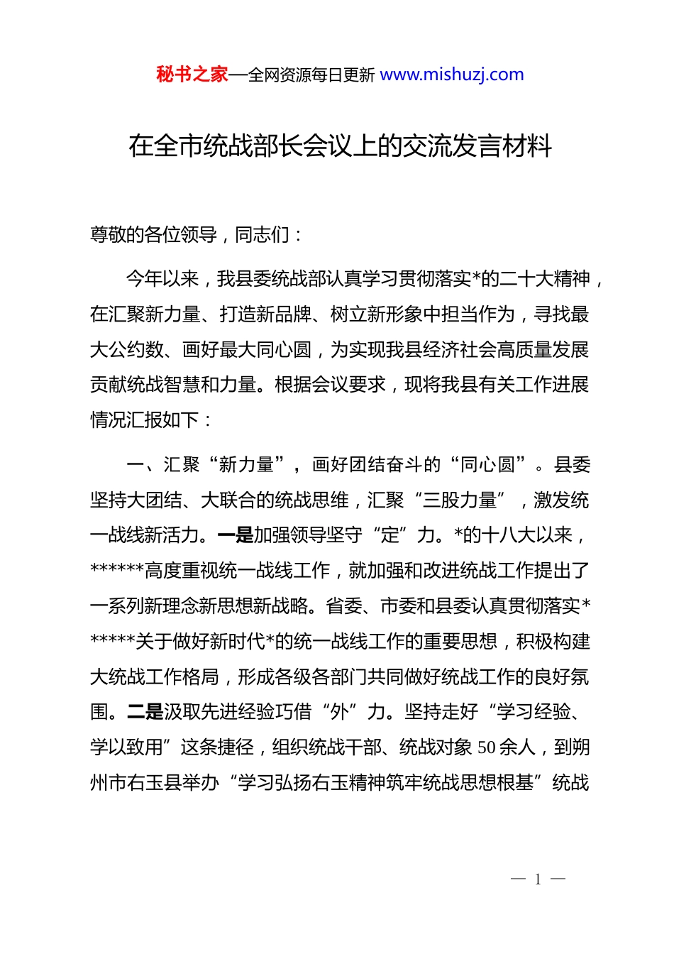 秘书之家—全网资源每日更新 www.mishuzj.com在全市统战部长会议上的交流发言材料尊敬的各位领导,同志们:今年以来,我县委统战部认真学习贯彻落实*的二十大精神,在汇聚新力量、打造新品牌、树立新形象中担当作为,寻找最大公约数、画好最大同心圆,为实现我县经济社会高质量发展贡献统战智慧和力量。根据会议要求,现将我县有关工作进展情况汇报如下:一、汇聚“新力量”,画好团结奋斗的“同心圆”。县委坚持大团结、大联合的统战思维,汇聚“三股力量”,激发统一战线新活力。一是加强领导坚守“定”力。*的十八大以来,******高度重视统一战线工作,就加强和改进统战工作提出了一系列新理念新思想新战略。省委、市委和县委认真贯彻落实******关于做好新时代*的统一战线工作的重要思想,积极构建大统战工作格局,形成各级各部门共同做好统战工作的良好氛围。二是汲取先进经验巧借“外”力。坚持走好“学习经验、学以致用”这条捷径,组织统战干部、统战对象 50 余人,到朔州市右玉县举办“学习弘扬右玉精神筑牢统战思想根基”统战— 1 —秘书之家—全网资源每日更新 www.mishuzj.com工作能力提升培训班,开阔眼界、增长见识,为创新统战工作提供智力支撑。三是整合各界资源广聚“众”力。积极发挥商会联系广泛、资源富集、信息广通的优势,坚持共建共享原则,以成立太原市商会为切入点,通过连结、联捷、链接多种方式,动员社会力量,在太原搭建 dj 研学服务平台、健康生态服务平台、科创数智服务平台,在我县建设 dj 联学红色教育基地、智能中医实训基地、小微企业创新创业基地),在北京、上海、广州设立三个窗口,通过讲述左权故事,宣传红色文化,为我县引才引资引智。二、打造“新品牌”,画好联合联谊的“同心圆”。县委统战部坚持“因地制宜、突出重点、彰显特色”的工作思路,精心打造“三大统战基地”,持续培育统战亮点。一是打造省社会主义学院现场教学基地。结合全县实际,跟踪对接省委统战部、省社会主义学院,以中国北方写生基地、桐峪 1941 小镇和非遗项目、特优农业项目为载体,结合“守法、诚信、感恩”公民道德教育活动,打造省社会主义学院现场教学基地,为全省统战成员关注支持我县发展提供平台。二是打造民营经济人士理想信念教育基地。紧紧围绕“两个健康”主题,以建立民营经济人士理想信念教育基地为抓手,引导广大民营经济— 2 —秘书之家—全网资源每日更新 www.mishuzj.com人士做爱国敬业、守法经营、创业创新、回报社会的典范,积极投身“万企兴万村”行动。发挥军耀红色文化传播公司民营经济人士理想信念教育基地的作用,打造了县通宝煤化有限责任公司等一批清廉民企示范点。三是打造*外知识分子社会服务基地。针对*外知识分子队伍规模扩大化、成份结构多元化、思想观念活跃化的特点,在县职中、县医院等*外知识分子相对集中的单位成立*外知识分子读书室,定期举办联谊活动,为调动*外知识分子主动性、创造性注入活力。三、树立“新形象”,画好凝聚共识的“同心圆”。县委统战部坚持以**************思想为指导,不断增强“四个意识”、坚定“四个自信”、做到“两个维护”,树立统战新形象。一是抓牢思想引领。召开县委统一战线工作领导小组(扩大)会议,组织统一战线成员 200 余人次学习宣传*的二十大精神和******关于做好新时代*的统一战线工作的重要思想;部机关召开专题研讨班、理论学习中心组研讨 6 次,深入学习贯彻《中国共产*统一战线工作条例》等统战理论方针政策;组织全体统战干部前往何云烈士殉难地、八路军白求恩野战医院旧址等地开展爱国主义思想教育,进一步坚定统战干部为民服务、团结奋进的理想信念。二是抓好活动引导。开展“同心大讲— 3 —秘书之家—全网资源每日更新 www.mishuzj.com堂”系列讲堂活动 8 次,组织机关全体人员、各乡镇、城区统战委员召开“同心大讲堂·廉政*课”,邀请辽阳镇乡贤、民俗博物馆馆长以“凝聚乡贤力量,共谱乡村振兴乐章”为主题进行授课,举办主题为“同心跟*走,奋进新征程”*外知识分子*的二十大精神主题宣讲活动,不断引领广大统战成员接续奋斗。三是抓实服务...