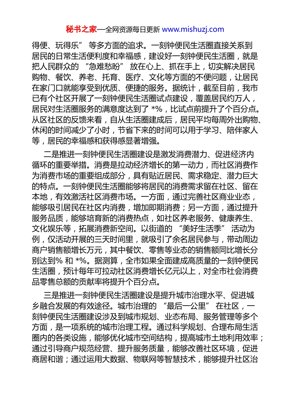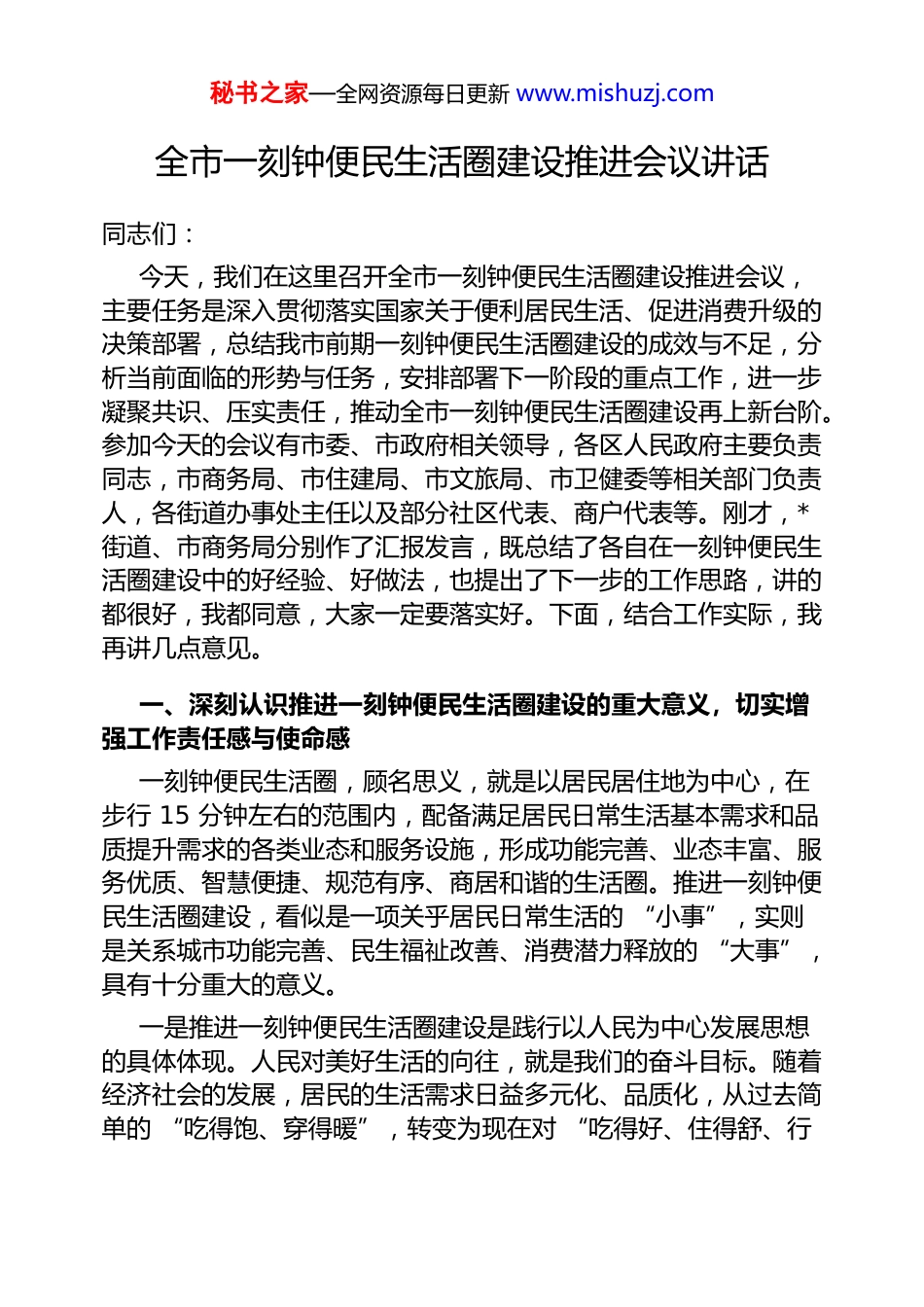 秘书之家—全网资源每日更新 www.mishuzj.com全市一刻钟便民生活圈建设推进会议讲话同志们:今天,我们在这里召开全市一刻钟便民生活圈建设推进会议,主要任务是深入贯彻落实国家关于便利居民生活、促进消费升级的决策部署,总结我市前期一刻钟便民生活圈建设的成效与不足,分析当前面临的形势与任务,安排部署下一阶段的重点工作,进一步凝聚共识、压实责任,推动全市一刻钟便民生活圈建设再上新台阶。参加今天的会议有市委、市政府相关领导,各区人民政府主要负责同志,市商务局、市住建局、市文旅局、市卫健委等相关部门负责人,各街道办事处主任以及部分社区代表、商户代表等。刚才,*街道、市商务局分别作了汇报发言,既总结了各自在一刻钟便民生活圈建设中的好经验、好做法,也提出了下一步的工作思路,讲的都很好,我都同意,大家一定要落实好。下面,结合工作实际,我再讲几点意见。一、深刻认识推进一刻钟便民生活圈建设的重大意义,切实增强工作责任感与使命感一刻钟便民生活圈,顾名思义,就是以居民居住地为中心,在步行 15 分钟左右的范围内,配备满足居民日常生活基本需求和品质提升需求的各类业态和服务设施,形成功能完善、业态丰富、服务优质、智慧便捷、规范有序、商居和谐的生活圈。推进一刻钟便民生活圈建设,看似是一项关乎居民日常生活的 “小事”,实则是关系城市功能完善、民生福祉改善、消费潜力释放的 “大事”,具有十分重大的意义。一是推进一刻钟便民生活圈建设是践行以人民为中心发展思想的具体体现。人民对美好生活的向往,就是我们的奋斗目标。随着经济社会的发展,居民的生活需求日益多元化、品质化,从过去简单的 “吃得饱、穿得暖”,转变为现在对 “吃得好、住得舒、行秘书之家—全网资源每日更新 www.mishuzj.com得便、玩得乐” 等多方面的追求。一刻钟便民生活圈直接关系到居民的日常生活便利度和幸福感,建设好一刻钟便民生活圈,就是把人民群众的 “急难愁盼” 放在心上、抓在手上,切实解决居民购物、餐饮、养老、托育、医疗、文化等方面的不便问题,让居民在家门口就能享受到优质、便捷的服务。据统计,截至目前,我市已有个社区开展了一刻钟便民生活圈试点建设,覆盖居民约万人,居民对生活圈服务的满意度达到了 *%,比试点前提升了个百分点。从区社区的反馈来看,自从生活圈建成后,居民平均每周外出购物、休闲的时间减少了小时,节省下来的时间可以用于学习、陪伴家人等,居民的幸福感和获得感显著增强。二是推进一刻钟便民生活圈建设是激发消费潜力、促进经济内循环的重要举措。消费是拉动经济增长的第一动力,而社区消费作为消费市场的重要组成部分,具有贴近居民、需求稳定、潜力巨大的特点。一刻钟便民生活圈能够将居民的消费需求留在社区、留在本地,有效激活社区消费市场。一方面,通过完善社区商业业态,能够吸引居民在社区内消费,增加即期消费;另一方面,通过提升服务品质,能够培育新的消费热点,如社区养老服务、健康养生、文化娱乐等,拓展消费新空间。以街道的 “美好生活季” 活动为例,仅活动开展的三天时间里,就吸引了余名居民参与,带动周边商户销售额增长万元,其中餐饮、零售等业态的销售额同比增长分别达到% 和 *%。据测算,全市如果全面建成高质量的一刻钟便民生活圈,预计每年可拉动社区消费增长亿元以上,对全市社会消费品零售总额的贡献率将提升个百分点。三是推进一刻钟便民生活圈建设是提升城市治理水平、促进城乡融合发展的有效途径。城市治理的 “最后一公里” 在社区,一刻钟便民生活圈建设涉及到城市规划、业态布局、服务管理等多个方面,是一项系统的城市治理工程。通过科学规划、合理布局生活圈内的各类设施,能够优化城市空间结构,提高城市土地利用效率;通过引导商户规范经营、提升服务质量,能够改善社区环境,促进商居和谐;通过运用大数据、物联网等智慧技术,能够提升社区治秘书之家—全网资源每日更新 www.mishuzj.com理的精细化、智能化水平。同时,推进一刻钟便民生活圈建设,也能带动农村地区借鉴城市的先进经验,完善农村社区的服务设施,缩小城乡差距,促进城乡...