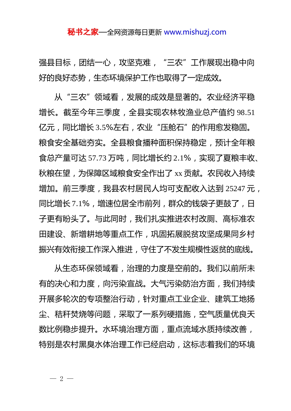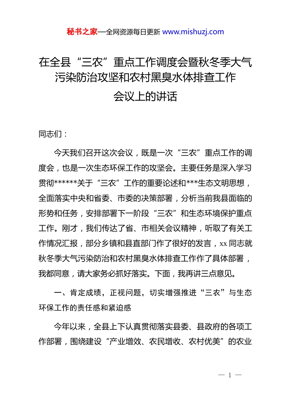 秘书之家—全网资源每日更新 www.mishuzj.com在全县“三农”重点工作调度会暨秋冬季大气污染防治攻坚和农村黑臭水体排查工作会议上的讲话同志们:今天我们召开这次会议,既是一次“三农”重点工作的调度会,也是一次生态环保工作的攻坚会。主要任务是深入学习贯彻******关于“三农”工作的重要论述和***生态文明思想,全面落实中央和省委、市委的决策部署,分析当前我县面临的形势和任务,安排部署下一阶段“三农”和生态环境保护重点工作。刚才,我们传达了省、市相关会议精神,听取了有关工作情况汇报,部分乡镇和县直部门作了很好的发言,xx 同志就秋冬季大气污染防治和农村黑臭水体排查工作作了具体部署,我都同意,请大家务必抓好落实。下面,我再讲三点意见。一、肯定成绩,正视问题,切实增强推进“三农”与生态环保工作的责任感和紧迫感今年以来,全县上下认真贯彻落实县委、县政府的各项工作部署,围绕建设“产业增效、农民增收、农村优美”的农业— 1 —秘书之家—全网资源每日更新 www.mishuzj.com强县目标,团结一心,攻坚克难,“三农”工作展现出稳中向好的良好态势,生态环境保护工作也取得了一定成效。从“三农”领域看,发展的成效是显著的。农业经济平稳增长。截至今年三季度,全县实现农林牧渔业总产值约 98.51亿元,同比增长 3.5%左右,农业“压舱石”的作用愈发稳固。粮食安全基础夯实。全县粮食播种面积保持稳定,预计全年粮食总产量可达 57.73 万吨,同比增长约 2.1%,实现了夏粮丰收、秋粮在望,为保障区域粮食安全作出了 xx 贡献。农民收入持续增加。前三季度,我县农村居民人均可支配收入达到 25247 元,同比增长 7.1%,增速位居全市前列,群众的钱袋子更鼓了,日子更有盼头了。与此同时,我们扎实推进农村改厕、高标准农田建设、新增耕地等重点工作,巩固拓展脱贫攻坚成果同乡村振兴有效衔接工作深入推进,守住了不发生规模性返贫的底线。从生态环保领域看,治理的力度是空前的。我们以前所未有的决心和力度,向污染宣战。大气污染防治方面,我们持续开展多轮次的专项整治行动,针对重点工业企业、建筑工地扬尘、秸秆焚烧等问题,采取了一系列硬措施,空气质量优良天数比例稳步提升。水环境治理方面,重点流域水质持续改善,特别是农村黑臭水体治理工作已经启动,这标志着我们的环境— 2 —秘书之家—全网资源每日更新 www.mishuzj.com治理正在从城市向农村、从干流向末梢延伸。在肯定成绩的同时,我们更要清醒地看到工作中存在的短板和弱项。一是发展不平衡问题依然突出。部分乡镇的特色产业规模偏小、链条不长、品牌不响,同质化竞争现象依然存在。农业产业化龙头企业的带动能力还不够强,与农民的利益联结机制有待完善。二是重点任务推进仍有差距。对照年初确定的目标,个别项目,如部分高标准农田建设、农村改厕等工作进度不及预期,需要我们加压奋进。财政资金使用效益有待进一步提高,“开源节流”的意识需要进一步强化。三是生态环境的欠账依然不少。当前已进入秋冬季,这是一年中大气污染最严峻的时期,面临的压力巨大。农村人居环境整治虽有成效,但乱堆乱放、污水横流的现象在一些偏远村庄还偶有发生。农村黑臭水体底数不清、成因复杂、治理难度大,是我们必须啃下的硬骨头。这些问题,既有客观原因,也有主观因素;既是发展中的问题,也是工作中的问题。全县各级各部门必须拿出“等不起”的紧迫感、“慢不得”的危机感、“坐不住”的责任感,以“钉钉子”的精神,一个问题一个问题去解决,一项工作一项工作去落实,奋力开创我县乡村全面振兴和城乡融合发展的— 3 —秘书之家—全网资源每日更新 www.mishuzj.com新局面。二、聚焦核心任务,聚力攻坚克难,全面提升“三农”工作与生态环境保护水平做好下一阶段工作,任务艰巨,责任重大。我们必须坚持问题导向、目标导向、结果导向,精准发力,靶向施策,确保各项工作取得实实在在的成效。(一)在推动乡村全面振兴上持续用力,筑牢农业强县根基乡村振兴是“三农”工作的总抓手。我们要牢牢把握产业兴旺、生态宜居、乡风文明、治理有效、生活富裕的总要求,推动农业全面...