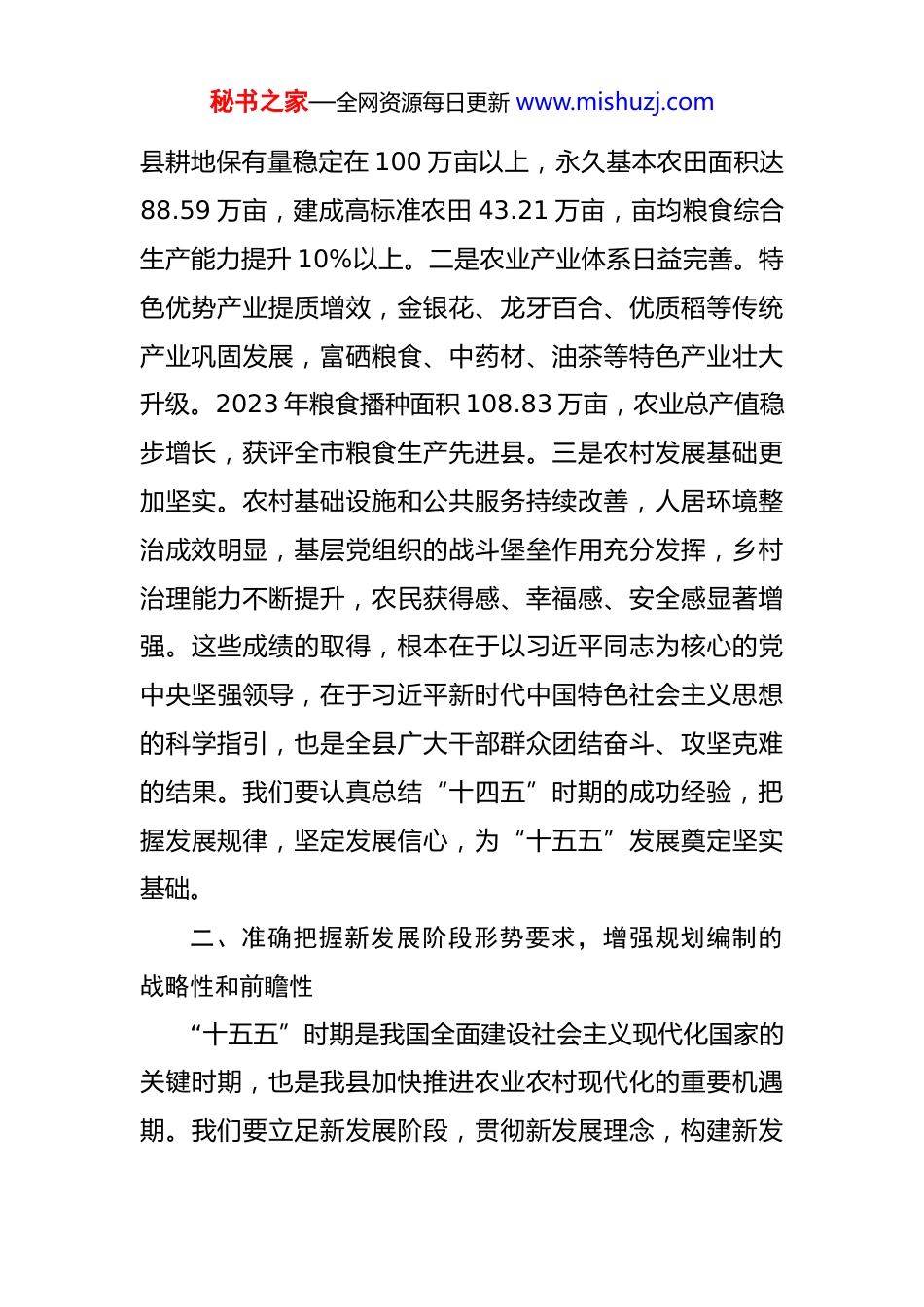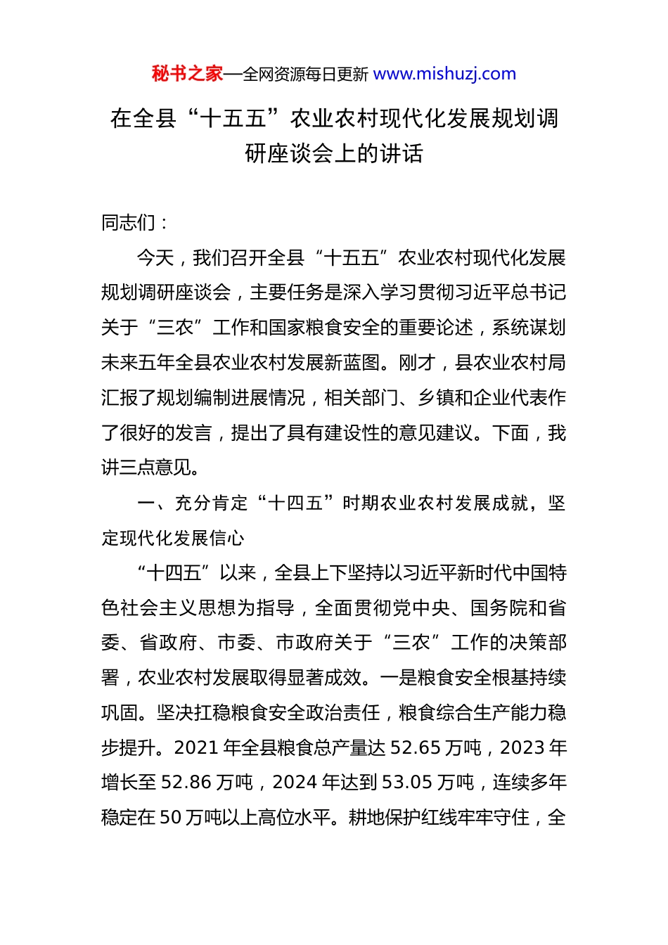 秘书之家—全网资源每日更新 www.mishuzj.com在全县“十五五”农业农村现代化发展规划调研座谈会上的讲话 同志们:今天,我们召开全县“十五五”农业农村现代化发展规划调研座谈会,主要任务是深入学习贯彻习近平总书记关于“三农”工作和国家粮食安全的重要论述,系统谋划未来五年全县农业农村发展新蓝图。刚才,县农业农村局汇报了规划编制进展情况,相关部门、乡镇和企业代表作了很好的发言,提出了具有建设性的意见建议。下面,我讲三点意见。一、充分肯定“十四五”时期农业农村发展成就,坚定现代化发展信心“十四五”以来,全县上下坚持以习近平新时代中国特色社会主义思想为指导,全面贯彻党中央、国务院和省委、省政府、市委、市政府关于“三农”工作的决策部署,农业农村发展取得显著成效。一是粮食安全根基持续巩固。坚决扛稳粮食安全政治责任,粮食综合生产能力稳步提升。2021 年全县粮食总产量达 52.65 万吨,2023 年增长至 52.86 万吨,2024 年达到 53.05 万吨,连续多年稳定在 50 万吨以上高位水平。耕地保护红线牢牢守住,全秘书之家—全网资源每日更新 www.mishuzj.com县耕地保有量稳定在 100 万亩以上,永久基本农田面积达88.59 万亩,建成高标准农田 43.21 万亩,亩均粮食综合生产能力提升 10%以上。二是农业产业体系日益完善。特色优势产业提质增效,金银花、龙牙百合、优质稻等传统产业巩固发展,富硒粮食、中药材、油茶等特色产业壮大升级。2023 年粮食播种面积 108.83 万亩,农业总产值稳步增长,获评全市粮食生产先进县。三是农村发展基础更加坚实。农村基础设施和公共服务持续改善,人居环境整治成效明显,基层党组织的战斗堡垒作用充分发挥,乡村治理能力不断提升,农民获得感、幸福感、安全感显著增强。这些成绩的取得,根本在于以习近平同志为核心的党中央坚强领导,在于习近平新时代中国特色社会主义思想的科学指引,也是全县广大干部群众团结奋斗、攻坚克难的结果。我们要认真总结“十四五”时期的成功经验,把握发展规律,坚定发展信心,为“十五五”发展奠定坚实基础。二、准确把握新发展阶段形势要求,增强规划编制的战略性和前瞻性“十五五”时期是我国全面建设社会主义现代化国家的关键时期,也是我县加快推进农业农村现代化的重要机遇期。我们要立足新发展阶段,贯彻新发展理念,构建新发秘书之家—全网资源每日更新 www.mishuzj.com展格局,深刻认识农业农村发展面临的新形势新要求。从战略全局看,国家高度重视农业农村发展。习近平总书记强调,民族要复兴,乡村必振兴。党中央坚持把解决好“三农”问题作为全党工作重中之重,持续加大强农惠农富农政策力度,为我们推进农业农村现代化提供了根本遵循和强大动力。国家实施粮食安全战略、乡村振兴战略,出台一系列支持政策措施,为农业农村发展创造了有利条件。从区域发展看,我省我市对农业农村工作提出新要求。省委、省政府明确要求坚决扛稳粮食安全重任,落实粮食安全党政同责,稳定发展粮食生产,巩固提升传统双季稻产区产能。市委、市政府部署推进农业产业兴旺,构建农村创业服务体系和农村电商服务体系,发展智慧农业,实施数字农业项目,为我县农业农村发展指明了方向。从自身发展看,我县农业农村既具备良好基础,也面临挑战。一方面,我县是国家商品粮基地县,农业资源丰富,产业特色鲜明,发展潜力巨大。另一方面,农业基础设施仍需加强,产业链条有待延伸,品牌影响力需要提升,农民持续增收机制尚需完善。面对新形势新任务,我们要增强机遇意识和风险意识,准确识变、科学应变、主秘书之家—全网资源每日更新 www.mishuzj.com动求变,在危机中育先机、于变局中开新局。三、聚焦重点任务,高质量编制“十五五”农业农村现代化发展规划做好“十五五”规划编制工作,要坚持以习近平新时代中国特色社会主义思想为指导,全面贯彻党的二十大和二十届二中、三中全会精神,落实中央和省市委部署要求,紧密结合*实际,科学确定发展目标、重点任务和重大举措。一要坚决保障粮食和重要农产品供给安全。始终绷紧粮食安全这根弦,落实藏粮于地、藏粮于技战略。严守耕...
