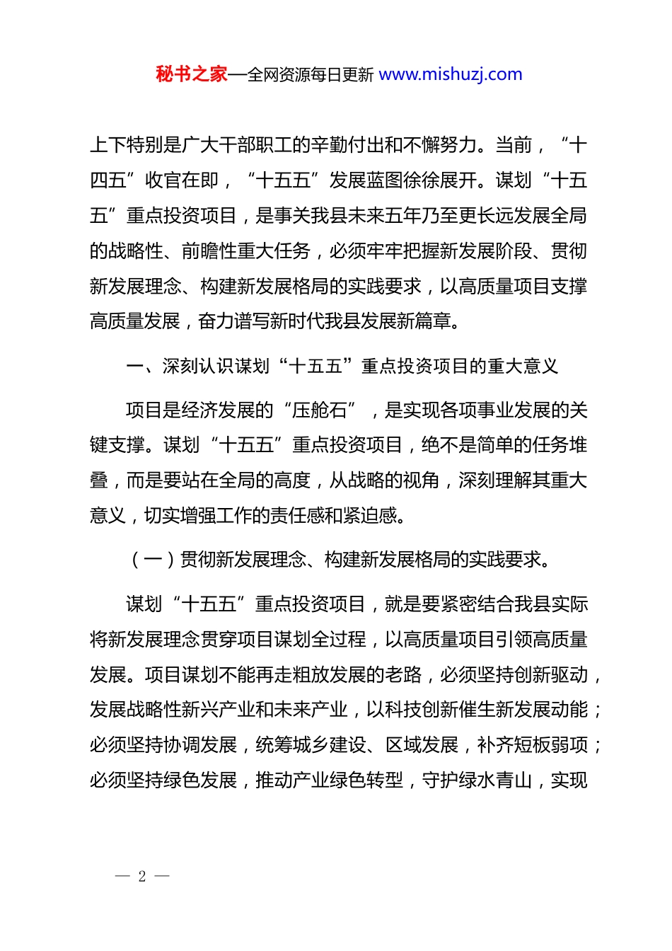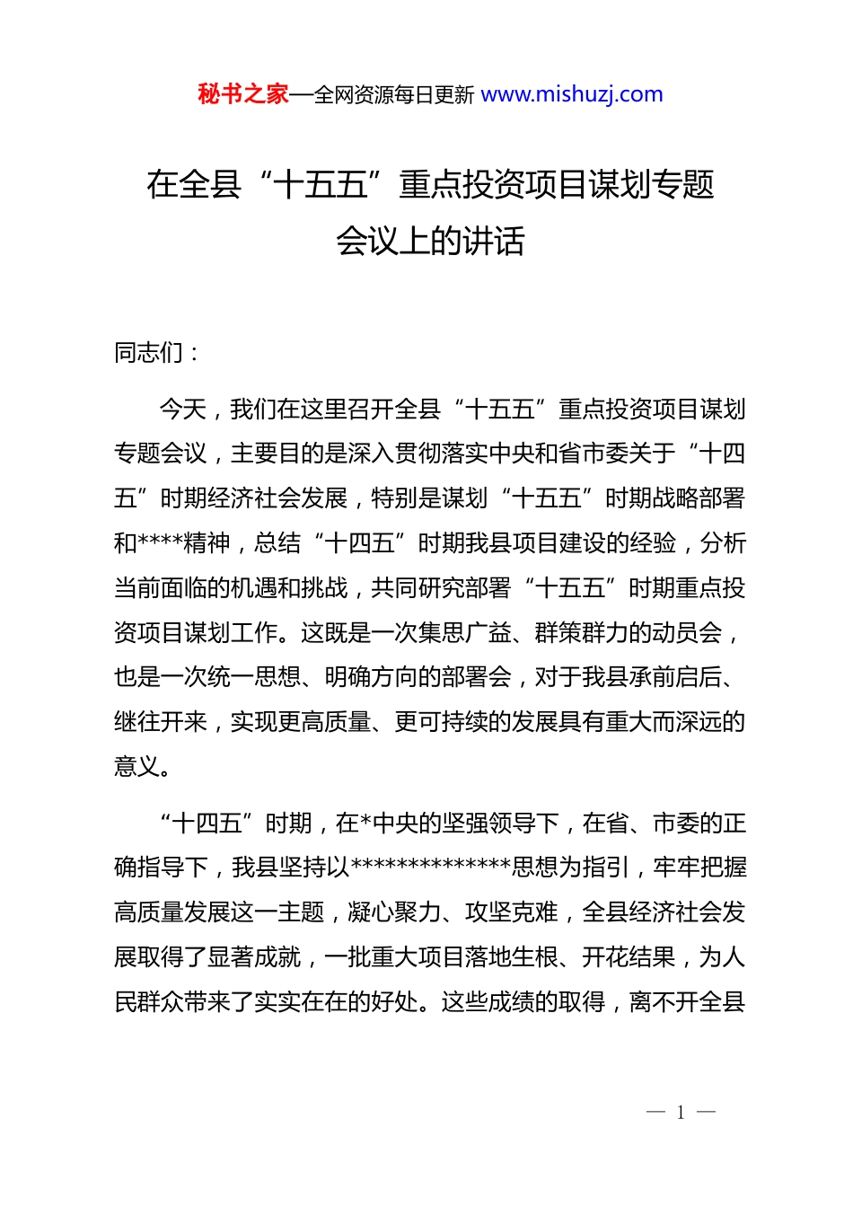 秘书之家—全网资源每日更新 www.mishuzj.com在全县“十五五”重点投资项目谋划专题会议上的讲话同志们:今天,我们在这里召开全县“十五五”重点投资项目谋划专题会议,主要目的是深入贯彻落实中央和省市委关于“十四五”时期经济社会发展,特别是谋划“十五五”时期战略部署和****精神,总结“十四五”时期我县项目建设的经验,分析当前面临的机遇和挑战,共同研究部署“十五五”时期重点投资项目谋划工作。这既是一次集思广益、群策群力的动员会,也是一次统一思想、明确方向的部署会,对于我县承前启后、继往开来,实现更高质量、更可持续的发展具有重大而深远的意义。“十四五”时期,在*中央的坚强领导下,在省、市委的正确指导下,我县坚持以**************思想为指引,牢牢把握高质量发展这一主题,凝心聚力、攻坚克难,全县经济社会发展取得了显著成就,一批重大项目落地生根、开花结果,为人民群众带来了实实在在的好处。这些成绩的取得,离不开全县— 1 —秘书之家—全网资源每日更新 www.mishuzj.com上下特别是广大干部职工的辛勤付出和不懈努力。当前,“十四五”收官在即,“十五五”发展蓝图徐徐展开。谋划“十五五”重点投资项目,是事关我县未来五年乃至更长远发展全局的战略性、前瞻性重大任务,必须牢牢把握新发展阶段、贯彻新发展理念、构建新发展格局的实践要求,以高质量项目支撑高质量发展,奋力谱写新时代我县发展新篇章。一、深刻认识谋划“十五五”重点投资项目的重大意义项目是经济发展的“压舱石”,是实现各项事业发展的关键支撑。谋划“十五五”重点投资项目,绝不是简单的任务堆叠,而是要站在全局的高度,从战略的视角,深刻理解其重大意义,切实增强工作的责任感和紧迫感。(一)贯彻新发展理念、构建新发展格局的实践要求。谋划“十五五”重点投资项目,就是要紧密结合我县实际将新发展理念贯穿项目谋划全过程,以高质量项目引领高质量发展。项目谋划不能再走粗放发展的老路,必须坚持创新驱动,发展战略性新兴产业和未来产业,以科技创新催生新发展动能;必须坚持协调发展,统筹城乡建设、区域发展,补齐短板弱项;必须坚持绿色发展,推动产业绿色转型,守护绿水青山,实现— 2 —秘书之家—全网资源每日更新 www.mishuzj.com经济效益、社会效益、生态效益的有机统一;必须坚持开放发展,积极融入国家和区域发展战略,吸引优质资源要素;必须坚持共享发展,让发展成果更多更公平惠及全体人民,实现共同富裕。只有这样,我们才能真正将中央精神落到实处,将宏伟蓝图变为生动实践,为构建新发展格局贡献我县力量。(二)是推动我县经济社会高质量发展的关键支撑。当前,我县正处于转型升级、爬坡过坎的关键时期。传统产业转型升级面临瓶颈,新兴产业培育尚需发力,基础设施仍有待完善,民生领域存在短板。这些挑战,既是压力,更是项目谋划的着力点和突破口。高质量的投资项目,能够有效优化产业结构,提升核心竞争力;能够显著改善基础设施条件,增强县域承载能力;能够持续激发市场活力,带动就业增长;能够直接提升公共服务水平,满足人民日益增长的美好生活需要。可以说,项目谋划的质量,直接决定了我县“十五五”时期的发展速度和发展质量。如果我们谋划的项目缺乏前瞻性、科学性、战略性,就可能错失发展机遇,甚至陷入被动;反之,如果我们能够谋划一批具有引领性、支撑性、带动性的重大项目,就能够为我县经济社会高质量发展注入强大动力,实现跨越式发展。我们要树立“项目为王”的理念,把谋划重大项目作为— 3 —秘书之家—全网资源每日更新 www.mishuzj.com一项基础性、战略性工作来抓,抢占先机、赢得主动。(三)增进民生福祉、提升人民生活品质的根本保障。我们的一切工作,归根结底都是为了人民。×××指出,必须坚持以人民为中心的发展思想,着力解决好人民群众急难愁盼问题。谋划“十五五”重点投资项目,必须始终坚持人民至上,将增进民生福祉作为出发点和落脚点。比如,通过项目建设,我们可以优化教育资源配置,让孩子们享有更优质的教育;可以完善医疗卫生服务体系,让群众看病就医更加便捷;可以加强养老托幼...