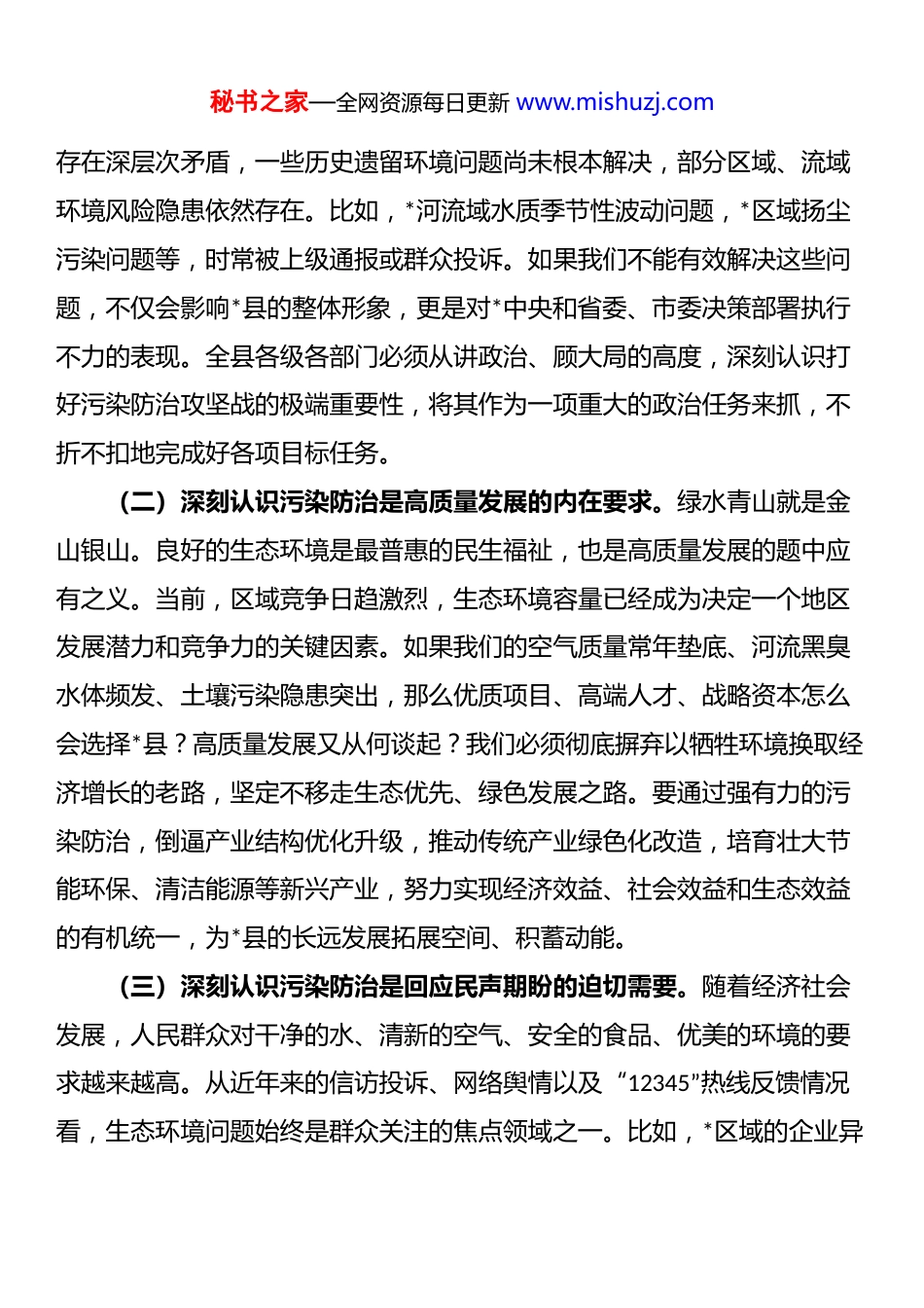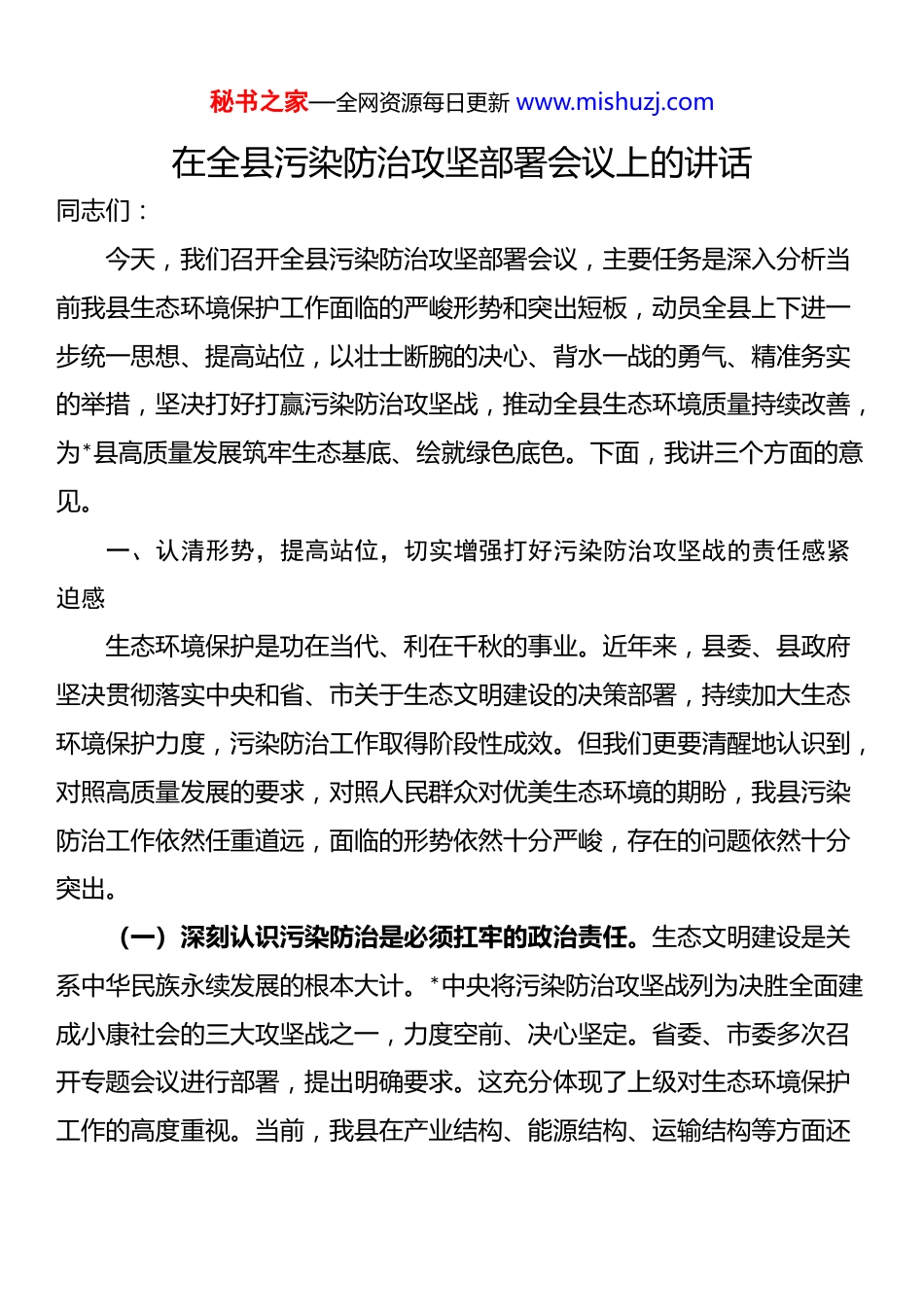 秘书之家—全网资源每日更新 www.mishuzj.com在全县污染防治攻坚部署会议上的讲话同志们:今天,我们召开全县污染防治攻坚部署会议,主要任务是深入分析当前我县生态环境保护工作面临的严峻形势和突出短板,动员全县上下进一步统一思想、提高站位,以壮士断腕的决心、背水一战的勇气、精准务实的举措,坚决打好打赢污染防治攻坚战,推动全县生态环境质量持续改善,为*县高质量发展筑牢生态基底、绘就绿色底色。下面,我讲三个方面的意见。一、认清形势,提高站位,切实增强打好污染防治攻坚战的责任感紧迫感生态环境保护是功在当代、利在千秋的事业。近年来,县委、县政府坚决贯彻落实中央和省、市关于生态文明建设的决策部署,持续加大生态环境保护力度,污染防治工作取得阶段性成效。但我们更要清醒地认识到,对照高质量发展的要求,对照人民群众对优美生态环境的期盼,我县污染防治工作依然任重道远,面临的形势依然十分严峻,存在的问题依然十分突出。(一)深刻认识污染防治是必须扛牢的政治责任。生态文明建设是关系中华民族永续发展的根本大计。*中央将污染防治攻坚战列为决胜全面建成小康社会的三大攻坚战之一,力度空前、决心坚定。省委、市委多次召开专题会议进行部署,提出明确要求。这充分体现了上级对生态环境保护工作的高度重视。当前,我县在产业结构、能源结构、运输结构等方面还秘书之家—全网资源每日更新 www.mishuzj.com存在深层次矛盾,一些历史遗留环境问题尚未根本解决,部分区域、流域环境风险隐患依然存在。比如,*河流域水质季节性波动问题,*区域扬尘污染问题等,时常被上级通报或群众投诉。如果我们不能有效解决这些问题,不仅会影响*县的整体形象,更是对*中央和省委、市委决策部署执行不力的表现。全县各级各部门必须从讲政治、顾大局的高度,深刻认识打好污染防治攻坚战的极端重要性,将其作为一项重大的政治任务来抓,不折不扣地完成好各项目标任务。(二)深刻认识污染防治是高质量发展的内在要求。绿水青山就是金山银山。良好的生态环境是最普惠的民生福祉,也是高质量发展的题中应有之义。当前,区域竞争日趋激烈,生态环境容量已经成为决定一个地区发展潜力和竞争力的关键因素。如果我们的空气质量常年垫底、河流黑臭水体频发、土壤污染隐患突出,那么优质项目、高端人才、战略资本怎么会选择*县?高质量发展又从何谈起?我们必须彻底摒弃以牺牲环境换取经济增长的老路,坚定不移走生态优先、绿色发展之路。要通过强有力的污染防治,倒逼产业结构优化升级,推动传统产业绿色化改造,培育壮大节能环保、清洁能源等新兴产业,努力实现经济效益、社会效益和生态效益的有机统一,为*县的长远发展拓展空间、积蓄动能。(三)深刻认识污染防治是回应民声期盼的迫切需要。随着经济社会发展,人民群众对干净的水、清新的空气、安全的食品、优美的环境的要求越来越高。从近年来的信访投诉、网络舆情以及“12345”热线反馈情况看,生态环境问题始终是群众关注的焦点领域之一。比如,*区域的企业异秘书之家—全网资源每日更新 www.mishuzj.com味扰民问题、*建筑工地的夜间施工噪声问题、*乡镇的畜禽养殖污染问题等,群众反映强烈。这些问题如果得不到及时有效解决,必然会损害群众的切身利益,影响*委政府的公信力,甚至可能引发社会矛盾。我们必须坚持以人民为中心的发展思想,把解决突出生态环境问题作为民生优先领域,积极回应人民群众的所想、所盼、所急,下大力气改善环境质量,提供更多优质生态产品,不断满足人民日益增长的优美生态环境需要,切实增强人民群众的生态环境获得感、幸福感、安全感。二、聚焦问题,精准施策,全力攻克污染防治攻坚战的突出短板与薄弱环节打好污染防治攻坚战,必须坚持问题导向,找准病灶、对症下药。我们要聚焦当前我县生态环境领域最突出的问题和最薄弱的环节,集中优势兵力,采取超常举措,务求取得实质性突破。(一)坚决打赢蓝天保卫战,守护“*县蓝”。空气质量是直观感受,必须紧盯关键指标,实施精准治理。一要狠抓工业污染源减排。加大对*行业、*企业的监管力度,确保稳定达标排放。加快推进*工业聚集区清...