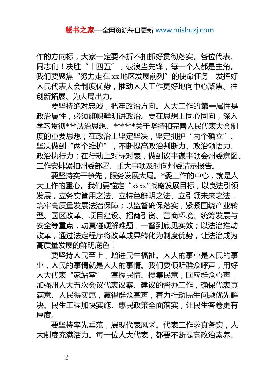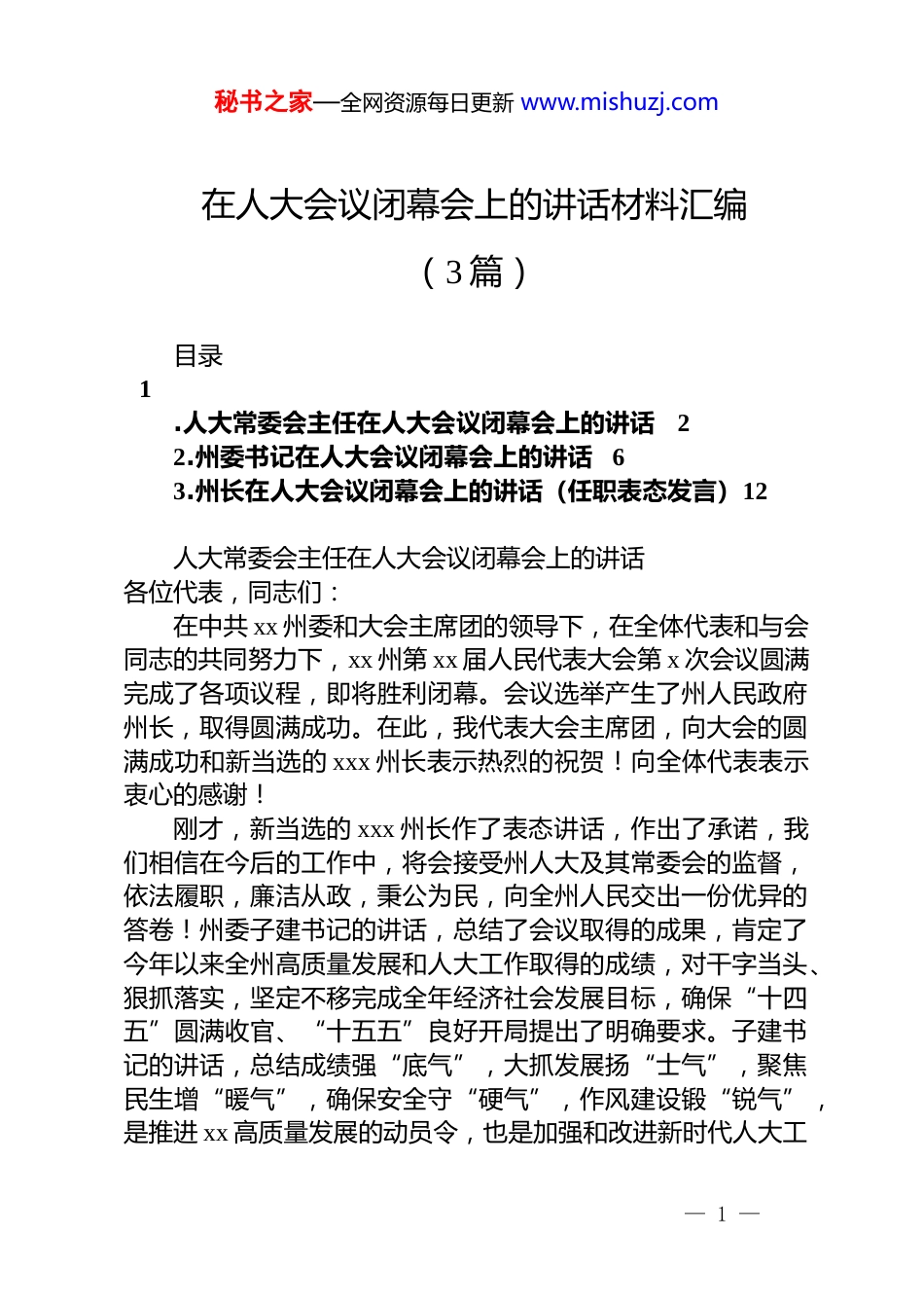 秘书之家—全网资源每日更新 www.mishuzj.com在人大会议闭幕会上的讲话材料汇编(3 篇)目录1.人大常委会主任在人大会议闭幕会上的讲话22.州委书记在人大会议闭幕会上的讲话 63.州长在人大会议闭幕会上的讲话(任职表态发言)12人大常委会主任在人大会议闭幕会上的讲话各位代表,同志们:在中共 xx 州委和大会主席团的领导下,在全体代表和与会同志的共同努力下,xx 州第 xx 届人民代表大会第 x 次会议圆满完成了各项议程,即将胜利闭幕。会议选举产生了州人民政府州长,取得圆满成功。在此,我代表大会主席团,向大会的圆满成功和新当选的 xxx 州长表示热烈的祝贺!向全体代表表示衷心的感谢!刚才,新当选的 xxx 州长作了表态讲话,作出了承诺,我们相信在今后的工作中,将会接受州人大及其常委会的监督,依法履职,廉洁从政,秉公为民,向全州人民交出一份优异的答卷!州委子建书记的讲话,总结了会议取得的成果,肯定了今年以来全州高质量发展和人大工作取得的成绩,对干字当头、狠抓落实,坚定不移完成全年经济社会发展目标,确保“十四五”圆满收官、“十五五”良好开局提出了明确要求。子建书记的讲话,总结成绩强“底气”,大抓发展扬“士气”,聚焦民生增“暖气”,确保安全守“硬气”,作风建设锻“锐气”,是推进 xx 高质量发展的动员令,也是加强和改进新时代人大工— 1 —秘书之家—全网资源每日更新 www.mishuzj.com作的方向标,大家一定要不折不扣抓好贯彻落实。各位代表、同志们!决胜“十四五”,破浪当先锋,每一个人都是主角。我们要聚焦“努力走在 xx 地区发展前列”的使命任务,发挥好人民代表大会制度优势,推动人大工作更好地向中心聚焦、往创新拓展、为大局出力。要坚持绝对忠诚,把牢政治方向。人大工作的第一属性是政治属性,必须旗帜鲜明讲政治。要在思想上同心同向,深入学习贯彻***法治思想、******关于坚持和完善人民代表大会制度的重要思想;在政治上坚定坚决,坚定拥护“两个确立”、坚决做到“两个维护”,不断提高政治判断力、政治领悟力、政治执行力;在行动上对标对表,做到议事谋事领会州委意图、工作安排紧扣州委部署、重大事项及时向州委请示报告。要坚持实干争先,服务发展大局。*委工作的中心,就是人大工作的重心。我们要锚定“xxxx”战略发展目标,以良法引领发展,立务实管用之法、立特色鲜明之法、立引领未来之法,筑牢高质量发展法治保障;以监督确保落实,紧紧围绕产业转型、园区改革、项目建设、招商引资、营商环境、统筹发展与安全等重点,动真碰硬解难题,一督到底见实效;以法治推动改革,通过法定程序将改革成果转化为制度优势,让法治成为高质量发展的鲜明底色!要坚持人民至上,增进民生福祉。人大的事业是人民的事业,人民的事情就是人大的事情。我们要倾听群众呼声,用好人大代表“家站室”,掌握民情、搜集民意;回应群众心声,加强州人大五次会议代表议案、建议的督办工作,确保代表真满意、人民得实惠;赢得群众掌声,着力推动民生问题优先解决、民生工程加快实施、惠民政策全面落实,让民生答卷更有厚度。要坚持率先垂范,展现代表风采。代表工作求真务实,人大制度充满活力。每一位人大代表,都要不断提高政治素养、— 2 —秘书之家—全网资源每日更新 www.mishuzj.com法治素养、民主素养、专业素养,当好“政策法规宣传员”,将*的温暖送进千家万户,让法治的阳光照亮公平正义;当好“群众诉求接访员”,把群众“急难愁盼”变为履职“满意答卷”;当好“社情民意收集员”,让群众的每一份诉求都有回应、每一桩难事都有回响;当好“矛盾纠纷调解员”,守护万家安宁,维护和谐稳定;当好“民主管理监督员”,筑牢人民当家作主的“坚实屏障”。星汉灿烂,北斗指航。坚持*对人大工作的全面领导,就是支持和保证人民实现当家作主。各级人大及其常委会必须坚持*的领导、人民当家作主、依法治国有机统一,确保*的理论、路线、方针政策和决策部署全面贯彻落实,让人民代表大会制度的显著优势绽放硕果盈枝的治理效能。各位代表、同志们!意志所至,山海皆平;步履所达,天地为径。让我们更加紧密地...