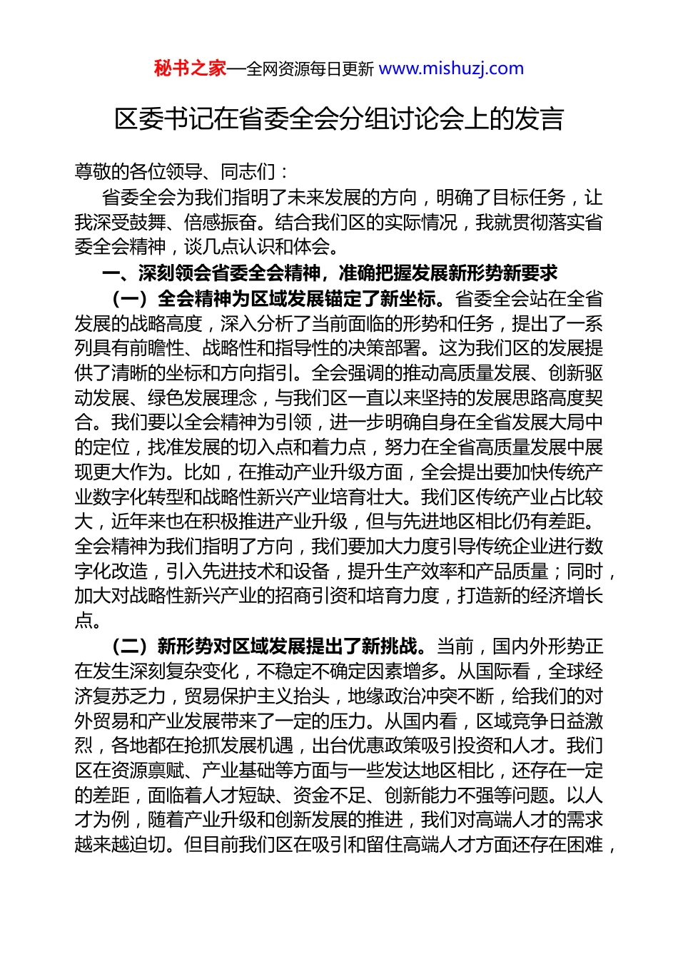 秘书之家—全网资源每日更新 www.mishuzj.com区委书记在省委全会分组讨论会上的发言尊敬的各位领导、同志们:省委全会为我们指明了未来发展的方向,明确了目标任务,让我深受鼓舞、倍感振奋。结合我们区的实际情况,我就贯彻落实省委全会精神,谈几点认识和体会。一、深刻领会省委全会精神,准确把握发展新形势新要求(一)全会精神为区域发展锚定了新坐标。省委全会站在全省发展的战略高度,深入分析了当前面临的形势和任务,提出了一系列具有前瞻性、战略性和指导性的决策部署。这为我们区的发展提供了清晰的坐标和方向指引。全会强调的推动高质量发展、创新驱动发展、绿色发展理念,与我们区一直以来坚持的发展思路高度契合。我们要以全会精神为引领,进一步明确自身在全省发展大局中的定位,找准发展的切入点和着力点,努力在全省高质量发展中展现更大作为。比如,在推动产业升级方面,全会提出要加快传统产业数字化转型和战略性新兴产业培育壮大。我们区传统产业占比较大,近年来也在积极推进产业升级,但与先进地区相比仍有差距。全会精神为我们指明了方向,我们要加大力度引导传统企业进行数字化改造,引入先进技术和设备,提升生产效率和产品质量;同时,加大对战略性新兴产业的招商引资和培育力度,打造新的经济增长点。(二)新形势对区域发展提出了新挑战。当前,国内外形势正在发生深刻复杂变化,不稳定不确定因素增多。从国际看,全球经济复苏乏力,贸易保护主义抬头,地缘政治冲突不断,给我们的对外贸易和产业发展带来了一定的压力。从国内看,区域竞争日益激烈,各地都在抢抓发展机遇,出台优惠政策吸引投资和人才。我们区在资源禀赋、产业基础等方面与一些发达地区相比,还存在一定的差距,面临着人才短缺、资金不足、创新能力不强等问题。以人才为例,随着产业升级和创新发展的推进,我们对高端人才的需求越来越迫切。但目前我们区在吸引和留住高端人才方面还存在困难,秘书之家—全网资源每日更新 www.mishuzj.com一方面是生活配套设施不够完善,另一方面是薪酬待遇和职业发展空间与发达地区相比缺乏竞争力。这就要求我们必须采取更加有效的措施,优化人才发展环境,提高人才政策的吸引力和实效性。(三)新要求为区域发展带来了新机遇。省委全会提出的一系列新要求,也为我们区的发展带来了新的机遇。全会强调要加强区域协调发展,推动城乡融合发展,这为我们加强与周边地区的合作交流,实现资源共享、优势互补提供了契机。我们可以积极参与区域产业分工协作,承接发达地区的产业转移,拓展发展空间。同时,全会对科技创新、绿色发展等方面的重视,也为我们区发挥自身优势,培育特色产业提供了政策支持。我们区拥有一定的科研资源和生态环境优势,可以加大在科技创新和绿色产业领域的投入,打造具有竞争力的创新高地和绿色发展示范区。依托区内的高校和科研机构,建立产学研合作平台,加强科技成果转化;利用良好的生态环境,发展生态农业、生态旅游等绿色产业。二、立足区情实际,明确发展思路和重点任务(一)坚持创新驱动,推动产业转型升级。创新是引领发展的第一动力。我们要把创新摆在区域发展的核心位置,加快构建以创新为引领的现代产业体系。一是加强科技创新平台建设。加大对科研机构和创新企业的扶持力度,建设一批重点实验室、工程技术研究中心等创新平台,提高自主创新能力。我们正在规划建设的科技创新园区,将集聚一批高端创新资源和人才,打造成为区域创新高地。二是推动产业数字化转型。鼓励传统企业加大数字化改造投入,引入工业互联网、大数据、人工智能等技术,实现生产过程的智能化、自动化和精细化管理。同时,培育发展数字经济新业态新模式,如电子商务、数字创意、智能制造等,推动数字经济与实体经济深度融合。三是培育壮大战略性新兴产业。结合我们区的产业基础和资源优势,重点发展新能源、新材料、生物医药、高端装备制造等战略性新兴产业。加大对新兴产业项目的招商引资力度,引进一批龙头企业和重大项目,带动产业集群发展。我们近期引进了一家新秘书之家—全网资源每日更新 www.mishuzj.com能源电池生产企业,该项目投资规...