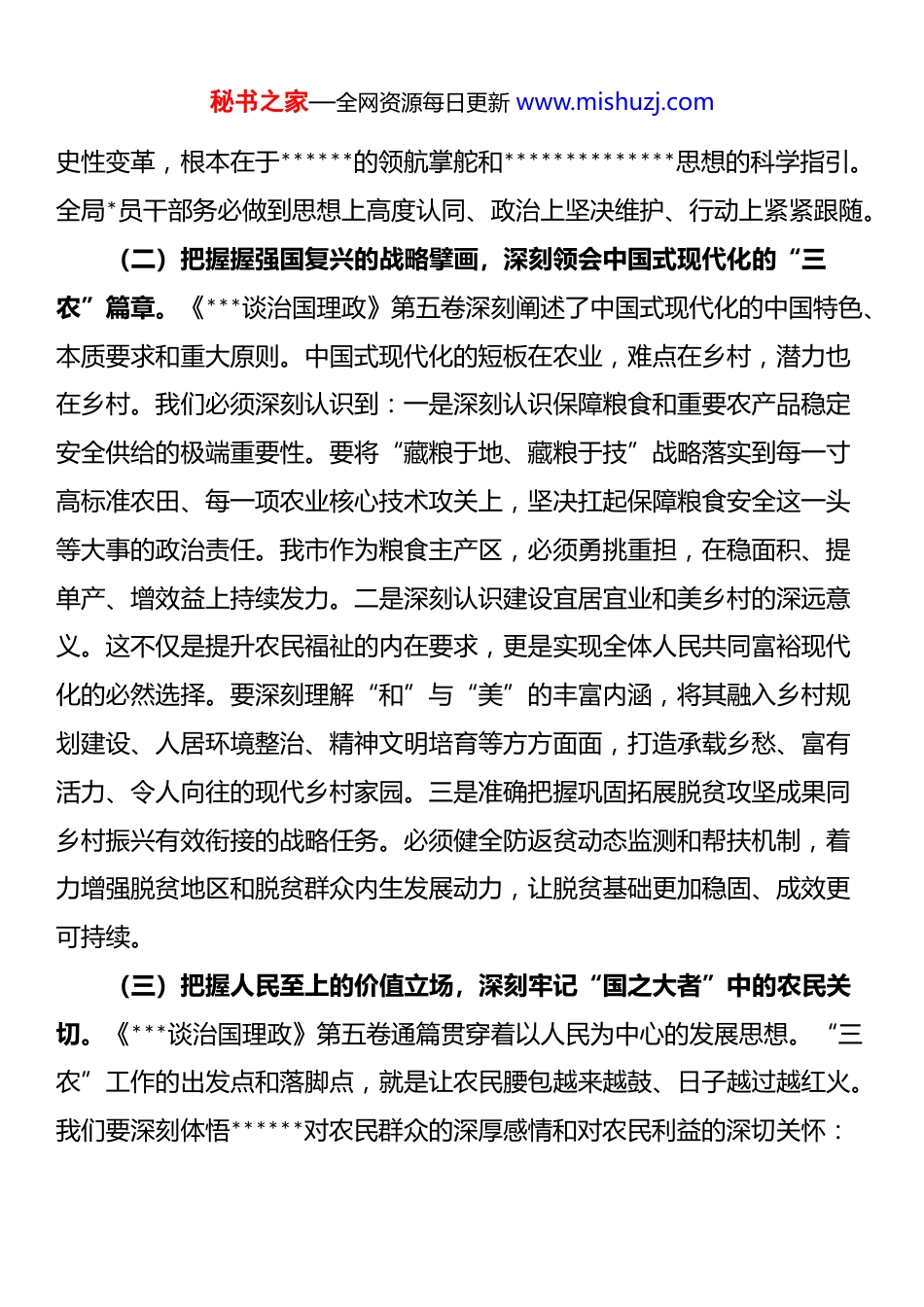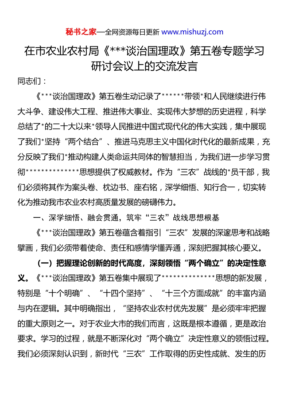 秘书之家—全网资源每日更新 www.mishuzj.com在市农业农村局《***谈治国理政》第五卷专题学习研讨会议上的交流发言同志们:《***谈治国理政》第五卷生动记录了******带领*和人民继续进行伟大斗争、建设伟大工程、推进伟大事业、实现伟大梦想的历史进程,科学总结了*的二十大以来*领导人民推进中国式现代化的伟大实践,集中展现了我们*坚持“两个结合”、推进马克思主义中国化时代化的最新成果,充分反映了我们*推动构建人类命运共同体的智慧担当,为我们进一步学习贯彻**************思想提供了权威教材。作为“三农”战线的*员干部,我们必须将其作为案头卷、枕边书、座右铭,深学细悟、知行合一,切实转化为推动我市农业农村高质量发展的磅礴伟力。一、深学细悟、融会贯通,筑牢“三农”战线思想根基《***谈治国理政》第五卷蕴含着指引“三农”发展的深邃思考和战略擘画,我们必须带着使命、责任和感情学懂弄通,深刻把握其核心要义。(一)把握理论创新的时代高度,深刻领悟“两个确立”的决定性意义。《***谈治国理政》第五卷集中展现了**************思想的新发展,特别是“十个明确”、“十四个坚持”、“十三个方面成就”的丰富内涵与内在逻辑。其中明确指出,“坚持农业农村优先发展”是必须牢牢把握的重大原则之一。对于农业大市的我们而言,这既是根本遵循,更是政治要求。学习的过程,就是不断深化对“两个确立”决定性意义的领悟过程。我们必须深刻认识到,新时代“三农”工作取得的历史性成就、发生的历秘书之家—全网资源每日更新 www.mishuzj.com史性变革,根本在于******的领航掌舵和**************思想的科学指引。全局*员干部务必做到思想上高度认同、政治上坚决维护、行动上紧紧跟随。(二)把握握强国复兴的战略擘画,深刻领会中国式现代化的“三农”篇章。《***谈治国理政》第五卷深刻阐述了中国式现代化的中国特色、本质要求和重大原则。中国式现代化的短板在农业,难点在乡村,潜力也在乡村。我们必须深刻认识到:一是深刻认识保障粮食和重要农产品稳定安全供给的极端重要性。要将“藏粮于地、藏粮于技”战略落实到每一寸高标准农田、每一项农业核心技术攻关上,坚决扛起保障粮食安全这一头等大事的政治责任。我市作为粮食主产区,必须勇挑重担,在稳面积、提单产、增效益上持续发力。二是深刻认识建设宜居宜业和美乡村的深远意义。这不仅是提升农民福祉的内在要求,更是实现全体人民共同富裕现代化的必然选择。要深刻理解“和”与“美”的丰富内涵,将其融入乡村规划建设、人居环境整治、精神文明培育等方方面面,打造承载乡愁、富有活力、令人向往的现代乡村家园。三是准确把握巩固拓展脱贫攻坚成果同乡村振兴有效衔接的战略任务。必须健全防返贫动态监测和帮扶机制,着力增强脱贫地区和脱贫群众内生发展动力,让脱贫基础更加稳固、成效更可持续。(三)把握人民至上的价值立场,深刻牢记“国之大者”中的农民关切。《***谈治国理政》第五卷通篇贯穿着以人民为中心的发展思想。“三农”工作的出发点和落脚点,就是让农民腰包越来越鼓、日子越过越红火。我们要深刻体悟******对农民群众的深厚感情和对农民利益的深切关怀:秘书之家—全网资源每日更新 www.mishuzj.com一是着力在促进农民增收致富上下功夫。扎实推进乡村产业发展壮大,完善联农带农机制,多渠道拓展农民增收空间,切实解决农民群众急难愁盼问题。二是着力在维护农民主体地位和权利上下功夫。尊重农民意愿,保障农民在乡村建设和治理中的知情权、参与权、表达权、监督权。三是着力在提升农民获得感、幸福感、安全感上下功夫。推动公共服务和社会事业向农村覆盖,加强乡村治理体系和治理能力现代化,建设充满活力、和谐有序的善治乡村。二、知行合一、担当实干,谱写乡村振兴崭新篇章学习的目的在于运用。我们必须紧密结合我市“三农”工作实际,找准切入点、着力点,将学习成果转化为推动工作的强大动力和实际成效。(一)聚焦首要任务,在保障粮食安全上展现新作为。一是严守耕地红线寸土不让。采取“长牙齿”的硬措施,坚决遏制耕地“非农化”、严格管控“非粮化”,扎实推进高标准农田...