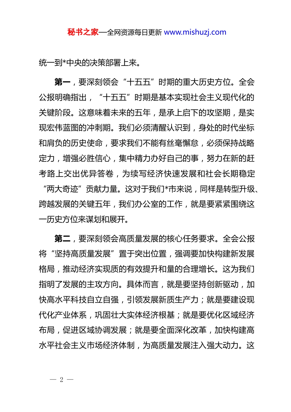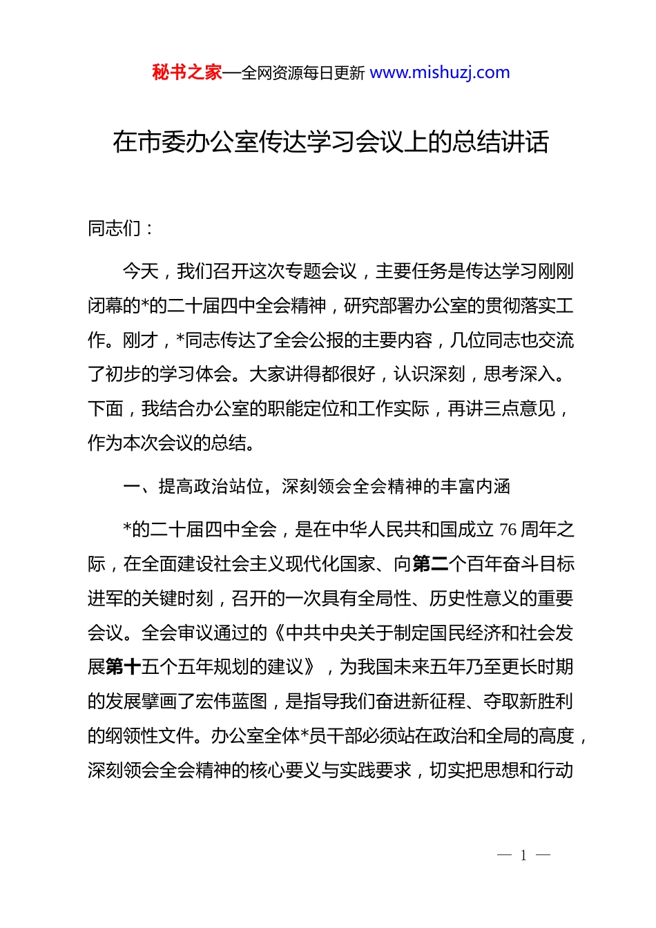 秘书之家—全网资源每日更新 www.mishuzj.com在市委办公室传达学习会议上的总结讲话同志们:今天,我们召开这次专题会议,主要任务是传达学习刚刚闭幕的*的二十届四中全会精神,研究部署办公室的贯彻落实工作。刚才,*同志传达了全会公报的主要内容,几位同志也交流了初步的学习体会。大家讲得都很好,认识深刻,思考深入。下面,我结合办公室的职能定位和工作实际,再讲三点意见,作为本次会议的总结。一、提高政治站位,深刻领会全会精神的丰富内涵*的二十届四中全会,是在中华人民共和国成立 76 周年之际,在全面建设社会主义现代化国家、向第二个百年奋斗目标进军的关键时刻,召开的一次具有全局性、历史性意义的重要会议。全会审议通过的《中共中央关于制定国民经济和社会发展第十五个五年规划的建议》,为我国未来五年乃至更长时期的发展擘画了宏伟蓝图,是指导我们奋进新征程、夺取新胜利的纲领性文件。办公室全体*员干部必须站在政治和全局的高度,深刻领会全会精神的核心要义与实践要求,切实把思想和行动— 1 —秘书之家—全网资源每日更新 www.mishuzj.com统一到*中央的决策部署上来。第一,要深刻领会“十五五”时期的重大历史方位。全会公报明确指出,“十五五”时期是基本实现社会主义现代化的关键阶段。这意味着未来的五年,是承上启下的攻坚期,是实现宏伟蓝图的冲刺期。我们必须清醒认识到,身处的时代坐标和肩负的历史使命,要求我们不能有丝毫懈怠,必须保持战略定力,增强必胜信心,集中精力办好自己的事,努力在新的赶考路上交出优异答卷,为续写经济快速发展和社会长期稳定“两大奇迹”贡献力量。这对于我们*市来说,同样是转型升级、跨越发展的关键五年,我们办公室的工作,就是要紧紧围绕这一历史方位来谋划和展开。第二,要深刻领会高质量发展的核心任务要求。全会公报将“坚持高质量发展”置于突出位置,强调要加快构建新发展格局,推动经济实现质的有效提升和量的合理增长。这为我们指明了发展的主攻方向。具体而言,就是要坚持创新驱动,加快高水平科技自立自强,引领发展新质生产力;就是要建设现代化产业体系,巩固壮大实体经济根基;就是要优化区域经济布局,促进区域协调发展;就是要全面深化改革,加快构建高水平社会主义市场经济体制,为高质量发展注入强大动力。这— 2 —秘书之家—全网资源每日更新 www.mishuzj.com些部署既是宏观的战略指引,也为我们思考和推动*市的发展提供了根本遵循。第三,要深刻领会以人民为中心的发展思想。全会再次彰显了我们*一以贯之的为民情怀,强调要加大保障和改善民生力度,扎实推进全体人民共同富裕,不断提高人民生活品质。无论是促进高质量充分就业,还是办好人民满意的教育、健全社会保障体系、推进健康中国建设,都体现了发展为了人民、发展依靠人民、发展成果由人民共享的价值追求。市委办公室作为离市委最近、服务群众最直接的部门之一,必须将这种思想融入血脉、见诸行动,始终把人民群众的安危冷暖放在心上。第四,要深刻领会统筹发展和安全的重大原则。安全是发展的前提,发展是安全的保障。全会强调要更好统筹发展和安全,推进国家安全体系和能力现代化。这要求我们在谋划工作、推进发展时,必须增强忧患意识,坚持底线思维,下好先手棋、打好主动仗,有效防范化解政治、经济、社会、生态等各领域风险挑战,确保*市在现代化建设的道路上行稳致远。二、聚焦职责使命,全力做好服务保障的各项工作学习贯彻全会精神,关键在于结合实际、推动工作。市委— 3 —秘书之家—全网资源每日更新 www.mishuzj.com办公室作为市委的“坚强前哨”和“巩固后院”,承担着参谋辅政、统筹协调、督查督办、服务保障的重要职责。我们必须把全会精神转化为做好“三服务”工作的具体思路、务实举措和实际行动,在服务*市高质量发展大局中展现新担当、新作为。第一,围绕“高质量发展”这一首要任务,当好参谋助手。全会为“十五五”时期的经济工作定下了基调。对照全会要求,我们必须清醒地看到*市当前发展面临的挑战。2024 年,我市地区生产总值增长 3.0%,虽然总量保持领先,但增速有所放缓。特别是第二...