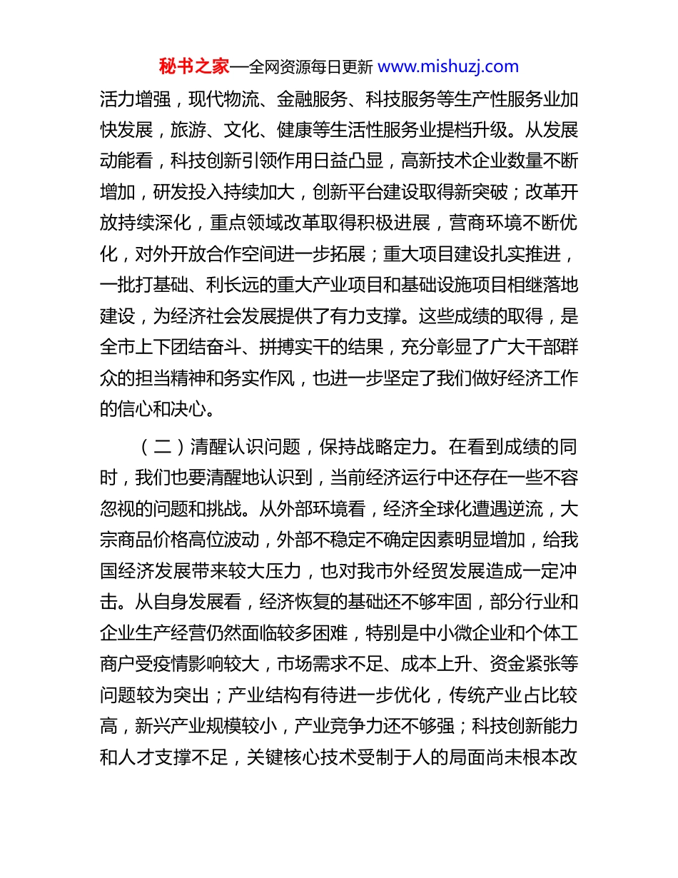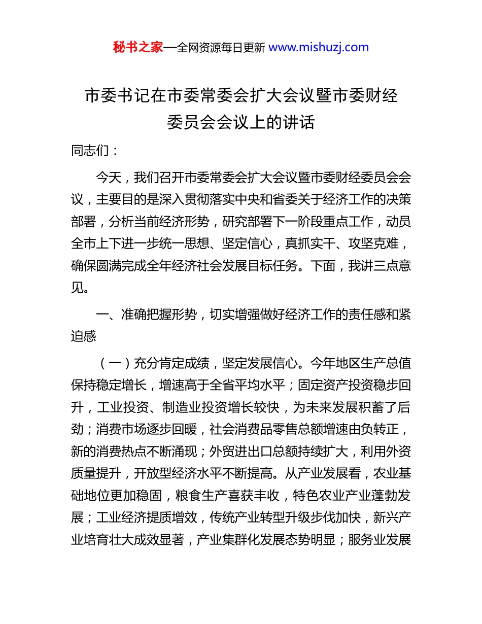 秘书之家—全网资源每日更新 www.mishuzj.com市委书记在市委常委会扩大会议暨市委财经委员会会议上的讲话同志们:今天,我们召开市委常委会扩大会议暨市委财经委员会会议,主要目的是深入贯彻落实中央和省委关于经济工作的决策部署,分析当前经济形势,研究部署下一阶段重点工作,动员全市上下进一步统一思想、坚定信心,真抓实干、攻坚克难,确保圆满完成全年经济社会发展目标任务。下面,我讲三点意见。一、准确把握形势,切实增强做好经济工作的责任感和紧迫感(一)充分肯定成绩,坚定发展信心。今年地区生产总值保持稳定增长,增速高于全省平均水平;固定资产投资稳步回升,工业投资、制造业投资增长较快,为未来发展积蓄了后劲;消费市场逐步回暖,社会消费品零售总额增速由负转正,新的消费热点不断涌现;外贸进出口总额持续扩大,利用外资质量提升,开放型经济水平不断提高。从产业发展看,农业基础地位更加稳固,粮食生产喜获丰收,特色农业产业蓬勃发展;工业经济提质增效,传统产业转型升级步伐加快,新兴产业培育壮大成效显著,产业集群化发展态势明显;服务业发展秘书之家—全网资源每日更新 www.mishuzj.com活力增强,现代物流、金融服务、科技服务等生产性服务业加快发展,旅游、文化、健康等生活性服务业提档升级。从发展动能看,科技创新引领作用日益凸显,高新技术企业数量不断增加,研发投入持续加大,创新平台建设取得新突破;改革开放持续深化,重点领域改革取得积极进展,营商环境不断优化,对外开放合作空间进一步拓展;重大项目建设扎实推进,一批打基础、利长远的重大产业项目和基础设施项目相继落地建设,为经济社会发展提供了有力支撑。这些成绩的取得,是全市上下团结奋斗、拼搏实干的结果,充分彰显了广大干部群众的担当精神和务实作风,也进一步坚定了我们做好经济工作的信心和决心。(二)清醒认识问题,保持战略定力。在看到成绩的同时,我们也要清醒地认识到,当前经济运行中还存在一些不容忽视的问题和挑战。从外部环境看,经济全球化遭遇逆流,大宗商品价格高位波动,外部不稳定不确定因素明显增加,给我国经济发展带来较大压力,也对我市外经贸发展造成一定冲击。从自身发展看,经济恢复的基础还不够牢固,部分行业和企业生产经营仍然面临较多困难,特别是中小微企业和个体工商户受疫情影响较大,市场需求不足、成本上升、资金紧张等问题较为突出;产业结构有待进一步优化,传统产业占比较高,新兴产业规模较小,产业竞争力还不够强;科技创新能力和人才支撑不足,关键核心技术受制于人的局面尚未根本改秘书之家—全网资源每日更新 www.mishuzj.com变,高层次创新人才和技能型人才短缺问题较为突出;民生领域还存在不少短板弱项,教育、医疗、养老等公共服务供给与人民群众的需求还有一定差距,生态环境保护任务依然艰巨。对于这些问题,我们必须高度重视,切实增强忧患意识和底线思维,保持战略定力,坚定发展信心,采取有效措施加以解决,努力在危机中育新机、于变局中开新局。(三)抢抓发展机遇,积极主动作为当前,我国经济长期向好的基本面没有改变,发展潜力巨大、韧性十足、空间广阔的特点没有改变,支撑高质量发展的生产要素条件没有改变,经济稳中向好、长期向好的发展趋势没有改变。同时,随着国家一系列稳经济政策措施的出台实施,为我市经济发展带来了新的机遇和动力。加大基础设施建设投资力度,将为我市交通、能源、水利等领域项目建设提供有力支持;推动产业升级和数字化转型,将为我市传统产业改造提升和新兴产业培育壮大创造有利条件;实施区域协调发展战略,将为我市加强与周边地区的合作交流、融入区域发展大局提供广阔空间。面对难得的发展机遇,我们要善于从政策中找机遇、从市场中找空间、从创新中找动力,以时不我待的紧迫感和使命感,积极主动作为,努力把政策机遇转化为发展优势,把市场潜力转化为发展实效,把创新活力转化为发展动力,推动全市经济高质量发展不断取得新成效。二、聚焦重点任务,全力推动经济高质量发展秘书之家—全网资源每日更新 www.mishuzj.com(一)着力稳定经济增长,确保实现全年目标任...