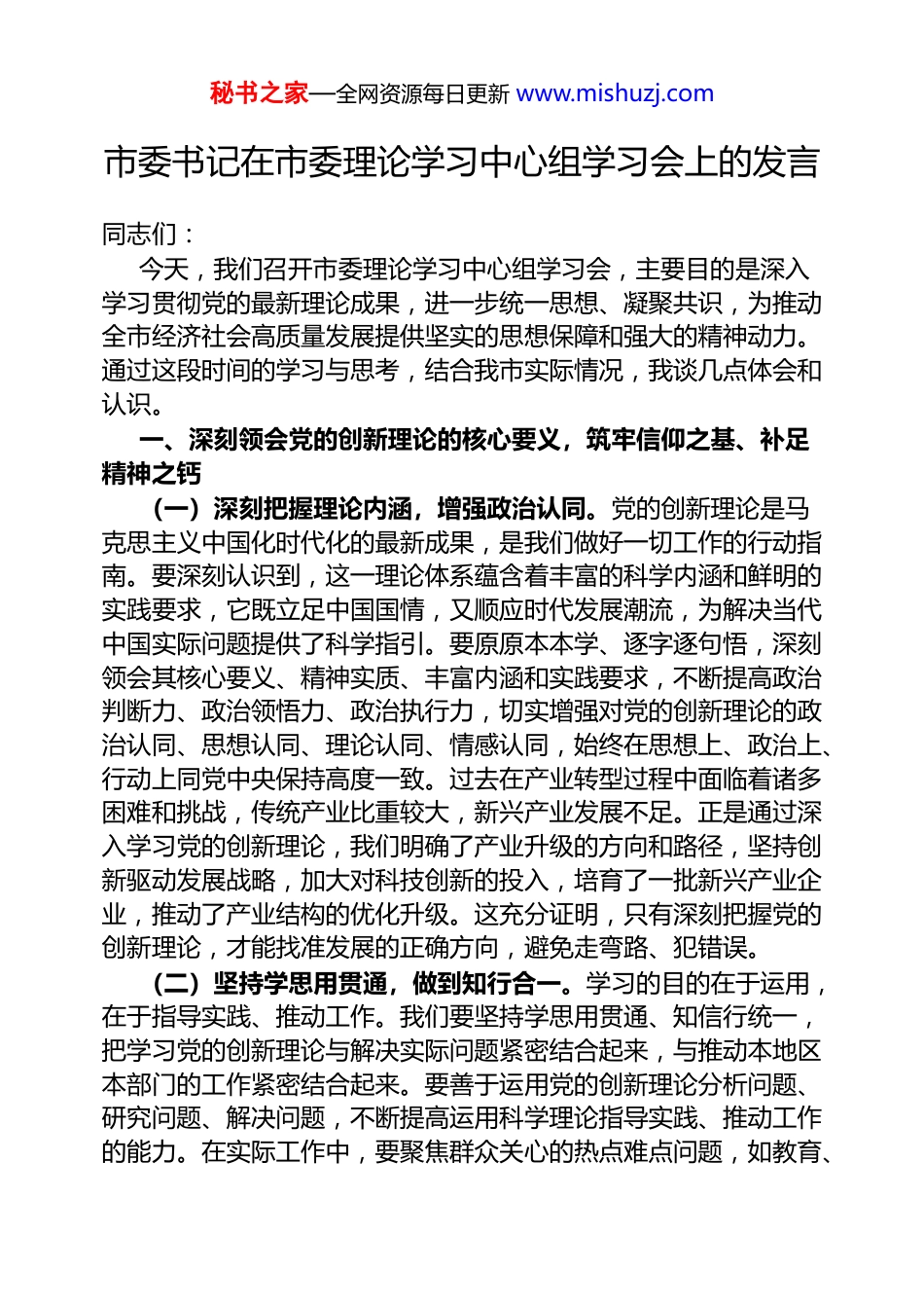 秘书之家—全网资源每日更新 www.mishuzj.com市委书记在市委理论学习中心组学习会上的发言同志们:今天,我们召开市委理论学习中心组学习会,主要目的是深入学习贯彻党的最新理论成果,进一步统一思想、凝聚共识,为推动全市经济社会高质量发展提供坚实的思想保障和强大的精神动力。通过这段时间的学习与思考,结合我市实际情况,我谈几点体会和认识。一、深刻领会党的创新理论的核心要义,筑牢信仰之基、补足精神之钙(一)深刻把握理论内涵,增强政治认同。党的创新理论是马克思主义中国化时代化的最新成果,是我们做好一切工作的行动指南。要深刻认识到,这一理论体系蕴含着丰富的科学内涵和鲜明的实践要求,它既立足中国国情,又顺应时代发展潮流,为解决当代中国实际问题提供了科学指引。要原原本本学、逐字逐句悟,深刻领会其核心要义、精神实质、丰富内涵和实践要求,不断提高政治判断力、政治领悟力、政治执行力,切实增强对党的创新理论的政治认同、思想认同、理论认同、情感认同,始终在思想上、政治上、行动上同党中央保持高度一致。过去在产业转型过程中面临着诸多困难和挑战,传统产业比重较大,新兴产业发展不足。正是通过深入学习党的创新理论,我们明确了产业升级的方向和路径,坚持创新驱动发展战略,加大对科技创新的投入,培育了一批新兴产业企业,推动了产业结构的优化升级。这充分证明,只有深刻把握党的创新理论,才能找准发展的正确方向,避免走弯路、犯错误。(二)坚持学思用贯通,做到知行合一。学习的目的在于运用,在于指导实践、推动工作。我们要坚持学思用贯通、知信行统一,把学习党的创新理论与解决实际问题紧密结合起来,与推动本地区本部门的工作紧密结合起来。要善于运用党的创新理论分析问题、研究问题、解决问题,不断提高运用科学理论指导实践、推动工作的能力。在实际工作中,要聚焦群众关心的热点难点问题,如教育、秘书之家—全网资源每日更新 www.mishuzj.com医疗、就业等,运用党的创新理论中关于以人民为中心的发展思想,制定切实可行的政策措施,努力让人民群众获得感、幸福感、安全感更加充实、更有保障、更可持续。比如,在教育领域,通过加大教育投入,优化教育资源配置,推进教育公平,提高了全市的教育质量,让更多的孩子享受到了优质的教育资源。这就是将党的创新理论转化为实际行动,解决群众实际问题的生动体现。(三)强化理论武装,提升党性修养。党性修养是党员干部立身、立业、立言、立德的基石。加强理论学习是提升党性修养的重要途径。要通过深入学习党的创新理论,坚定理想信念,增强党性观念,牢记初心使命。要时刻保持对党的忠诚,对人民的赤诚,对事业的执着,自觉践行党的宗旨,全心全意为人民服务。同时,要加强道德修养,树立正确的世界观、人生观、价值观,自觉抵制各种腐朽思想的侵蚀,做到清正廉洁、公道正派。在日常工作和生活中,要严格要求自己,遵守党的纪律和规矩,自觉维护党的形象和威信。二、立足市情实际,以党的创新理论引领全市经济社会高质量发展(一)推动产业转型升级,构建现代产业体系。产业是经济发展的根基。要以党的创新理论为指导,立足我市产业基础和资源禀赋,加快推动产业转型升级,构建具有竞争力的现代产业体系。一方面,要改造提升传统产业,运用新技术、新工艺、新模式,推动传统产业向高端化、智能化、绿色化方向发展。例如,我们市的制造业基础较好,但存在技术水平不高、产品附加值低等问题。我们可以通过引进先进技术和设备,加强企业技术创新,提高产品质量和性能,提升产业的整体竞争力。另一方面,要培育壮大新兴产业,加大对新能源、新材料、生物医药、数字经济等战略性新兴产业的扶持力度,打造新的经济增长点。要优化产业布局,加强产业园区建设,提高产业集聚度和协同发展水平。通过产业转型升级,实现经济发展质量变革、效率变革、动力变革,推动我市经济高质量发展。秘书之家—全网资源每日更新 www.mishuzj.com(二)加强科技创新,激发创新活力。科技创新是引领发展的第一动力。要深入实施创新驱动发展战略,强化科技创新对经济社会发展的支撑引领作用。要加...